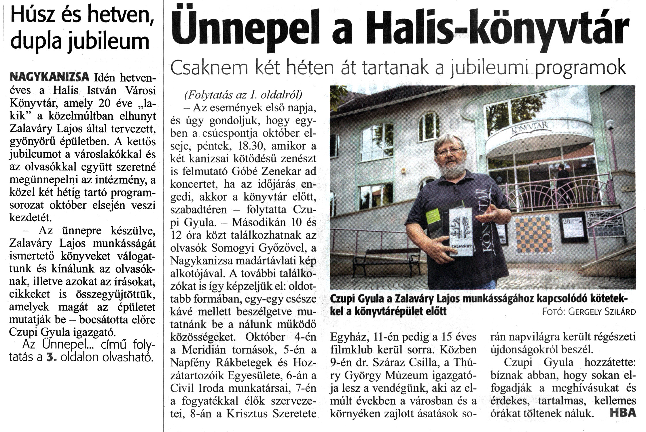 Nyilvános 1085 | 1424 | Zalai Hírlap 2021. szeptember 24. 222. szám, 1, 3. oldal | Húsz és hetven, dupla jubileum NAGYKANIZSA Idén hetvenéves a Halis István Városi Könyvtár, amely 20 éve „lakik" a közelmúltban elhunyt Zalaváry Lajos által tervezett, gyönyörű épületben. A kettős jubileumot a városlakókkal és az olvasókkal együtt szeretné megünnepelni az intézmény, a közel két hétig tartó programsorozat október elsején veszi kezdetét. - Az ünnepre készülve, Zalaváry Lajos munkásságát ismertető könyveket válogattunk és kínálunk az olvasóknak, illetve azokat az írásokat, cikkeket is összegyűjtöttük, amelyek magát az épületet mutatják be - bocsátotta előre Czupi Gyula igazgató. Az Ünnepel... című folytatás a 3. oldalon olvasható. Ünnepel a Halis-könyvtár Csaknem két héten át tartanak a jubileumi programok (Folytatás az 1. oldalról) - Az események első napja, és úgy gondoljuk, hogy egyben a csúcspontja október elseje, péntek, 18.30, amikor a két kanizsai kötődésű zenészt is felmutató Góbé Zenekar ad koncertet, ha az időjárás engedi, akkor a könyvtár előtt, szabadtéren - folytatta Czupi Gyula. - Másodikán 10 és 12 óra közt találkozhatnak az olvasók Somogyi Győzővel, a Nagykanizsa madártávlati kép alkotójával. A további találkozókat is így képzeljük el: oldottabb formában, egy-egy csésze kávé mellett beszélgetve mutatnánk be a nálunk működő közösségeket. Október 4-én a Meridián tornások, 5-én a Napfény Rákbetegek és Hozzátartozóik Egyesülete, 6-án a Civil Iroda munkatársai, 7-én a fogyatékkal élők szervezetei, 8-án a Krisztus Szeretete Egyház, 11-én pedig a 15 éves filmklub kerül sorra. Közben 9-én dr. Száraz Csilla, a Thú-ry György Múzeum igazgatója lesz a vendégünk, aki az elmúlt években a városban és a környéken zajlott ásatások során napvilágra került régészeti újdonságokról beszél. Czupi Gyula hozzátette: bíznak abban, hogy sokan elfogadják a meghívásukat és érdekes, tartalmas, kellemes órákat töltenek náluk. HBA Czupi Gyula a Zalaváry Lajos munkásságához kapcsolódó kötetekkel a könyvtárépület előtt Fotó: Gergely Szilárd |