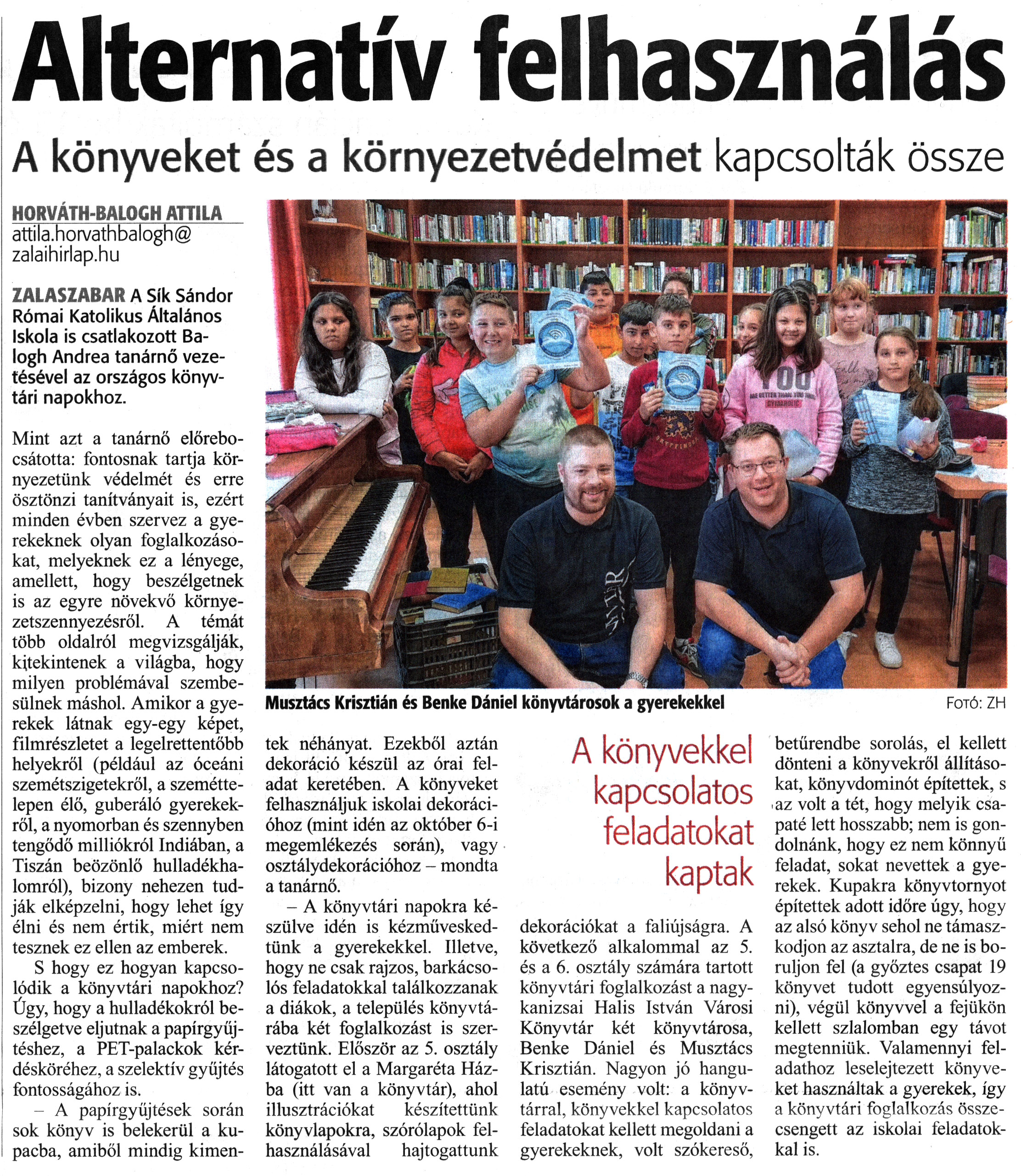 Nyilvános 1107 | 1493 | Zalai Hírlap 2021. október 21. 245. szám 4. oldal | Alternatív felhasználás A könyveket és a környezetvédelmet kapcsolták össze HORVÁTH-BALOGH ATTILA attila.horvathbalogh@ zalaihirlap.hu ZALASZABAR A Sík Sándor Római Katolikus Általános Iskola is csatlakozott Balogh Andrea tanárnő vezetésével az országos könyvtári napokhoz. Mint azt a tanárnő előrebocsátotta: fontosnak tartja környezetünk védelmét és erre ösztönzi tanítványait is, ezért minden évben szervez a gyerekeknek olyan foglalkozásokat, melyeknek ez a lényege, amellett, hogy beszélgetnek is az egyre növekvő környezetszennyezésről. A témát több oldalról megvizsgálják, kitekintenek a világba, hogy milyen problémával szembesülnek máshol. Amikor a gyerekek látnak egy-egy képet, filmrészletet a legelrettentőbb helyekről (például az óceáni szemétszigetekről, a szeméttelepen élő, guberáló gyerekekről, a nyomorban és szennyben tengődő milliókról Indiában, a Tiszán beözönlő hulladékhalomról), bizony nehezen tudják elképzelni, hogy lehet így élni és nem értik, miért nem tesznek ez ellen az emberek. S hogy ez hogyan kapcsolódik a könyvtári napokhoz? Úgy, hogy a hulladékokról beszélgetve eljutnak a papírgyűjtéshez, a PET-palackok kérdésköréhez, a szelektív gyűjtés fontosságához is. - A papírgyűjtések során sok könyv is belekerül a kupacba, amiből mindig kimentek néhányat. Ezekből aztán dekoráció készül az órai feladat keretében. A könyveket felhasználjuk iskolai dekorációhoz (mint idén az október 6-i megemlékezés során), vagy osztálydekorációhoz - mondta a tanárnő. - A könyvtári napokra készülve idén is kézműveskedtünk a gyerekekkel. Illetve, hogy ne csak rajzos, barkácsolós feladatokkal találkozzanak a diákok, a település könyvtárába két foglalkozást is szerveztünk. Először az 5. osztály látogatott el a Margaréta Házba (itt van a könyvtár), ahol illusztrációkat készítettünk könyvlapokra, szórólapok felhasználásával hajtogattunk dekorációkat a faliújságra. A következő alkalommal az 5. és a 6. osztály számára tartott könyvtári foglalkozást a nagykanizsai Halis István Városi Könyvtár két könyvtárosa, Benke Dániel és Musztács Krisztián. Nagyon jó hangulatú esemény volt: a könyvtárral, könyvekkel kapcsolatos feladatokat kellett megoldani a gyerekeknek, volt szókereső, betűrendbe sorolás, el kellett dönteni a könyvekről állításokat, könyvdominót építettek, s az volt a tét, hogy melyik csapaté lett hosszabb; nem is gondolnánk, hogy ez nem könnyű feladat, sokat nevettek a gyerekek. Kupakra könyvtornyot építettek adott időre úgy, hogy az alsó könyv sehol ne támaszkodjon az asztalra, de ne is boruljon fel (a győztes csapat 19 könyvet tudott egyensúlyozni), végül könyvvel a fejükön kellett szlalomban egy távot megtenniük. Valamennyi feladathoz leselejtezett könyveket használtak a gyerekek, így a könyvtári foglalkozás összecsengett az iskolai feladatokkal is. Musztács Krisztián és Benke Dániel könyvtárosok a gyerekekkel |