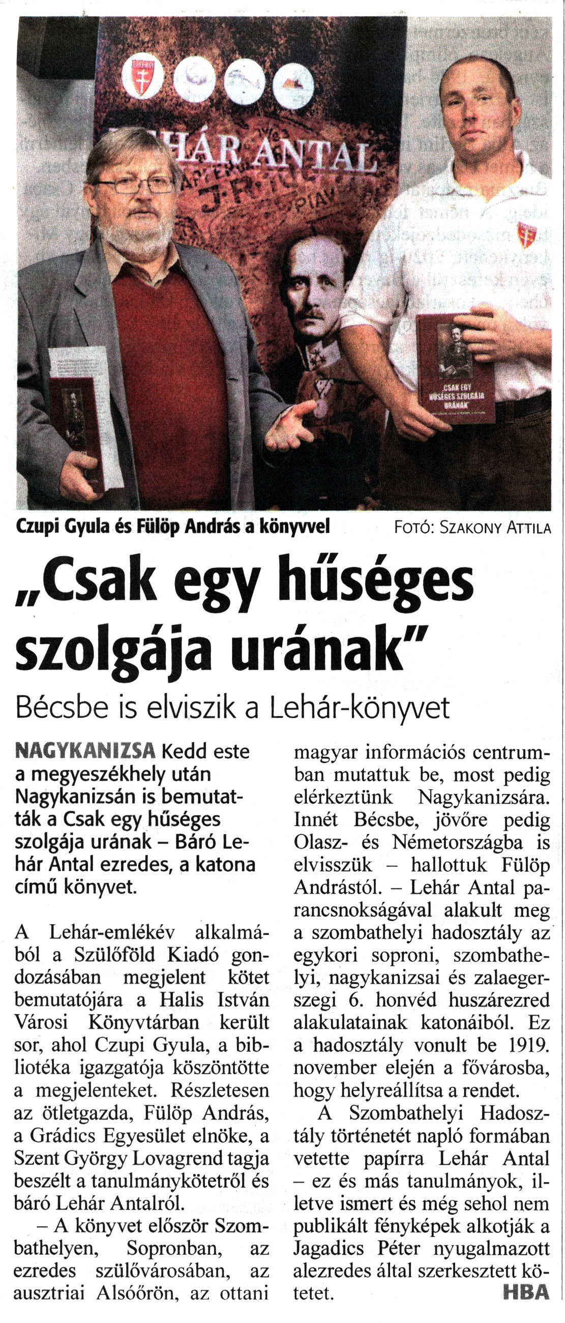Nyilvános 1156 | 1632 | Zalai Hírlap 2021. november 25. 273. szám 16. oldal | „Csak egy hűséges szolgája urának" Bécsbe is elviszik a Lehár-könyvet NAGYKANIZSA Kedd este a megyeszékhely után Nagykanizsán is bemutatták a Csak egy hűséges szolgája urának - Báró Lehár Antal ezredes, a katona című könyvet. A Lehár-emlékév alkalmából a Szülőföld Kiadó gondozásában megjelent kötet bemutatójára a Halis István Városi Könyvtárban került sor, ahol Czupi Gyula, a bibliotéka igazgatója köszöntötte a megjelenteket. Részletesen az ötletgazda, Fülöp András, a Grádics Egyesület elnöke, a Szent György Lovagrend tagja beszélt a tanulmánykötetről és báró Lehár Antalról. - A könyvet először Szombathelyen, Sopronban, az ezredes szülővárosában, az ausztriai Alsóőrön, az ottani magyar információs centrumban mutattuk be, most pedig elérkeztünk Nagykanizsára. Innét Bécsbe, jövőre pedig Olasz- és Németországba is elvisszük - hallottuk Fülöp Andrástól. - Lehár Antal parancsnokságával alakult meg a szombathelyi hadosztály az egykori soproni, szombathelyi, nagykanizsai és zalaegerszegi 6. honvéd huszárezred alakulatainak katonáiból. Ez a hadosztály vonult be 1919. november elején a fővárosba, hogy helyreállítsa a rendet. A Szombathelyi Hadosztály történetét napló formában vetette papírra Lehár Antal - ez és más tanulmányok, illetve ismert és még sehol nem publikált fényképek alkotják a Jagadics Péter nyugalmazott alezredes által szerkesztett kötetet. HBA Czupi Gyula és Fülöp András a könyvvel Fotó: Szakony Attila |