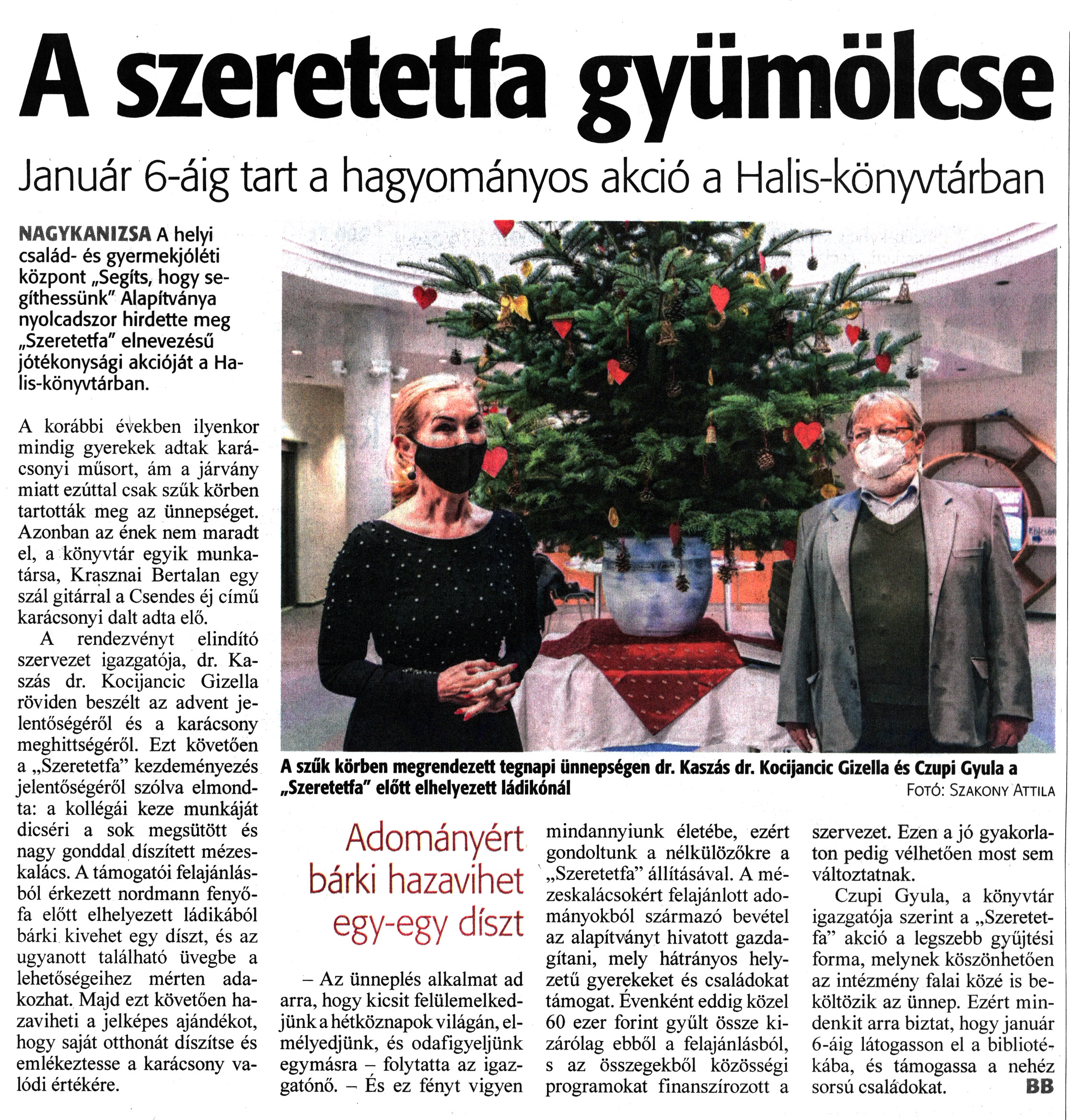Nyilvános 1166 | 1731 | Zalai Hírlap 2021. december 2. 279. szám 2. oldal | A szeretetfa gyümölcse Január 6-áig tart a hagyományos akció a Halis-könyvtárban NAGYKANIZSA A helyi család- és gyermekjóléti központ „Segíts, hogy segíthessünk" Alapítványa nyolcadszor hirdette meg „Szeretetfa" elnevezésű jótékonysági akcióját a Halis-könyvtárban. A korábbi években ilyenkor mindig gyerekek adtak karácsonyi műsort, ám a járvány miatt ezúttal csak szűk körben tartották meg az ünnepséget. Azonban az ének nem maradt el, a könyvtár egyik munkatársa, Krasznai Bertalan egy szál gitárral a Csendes éj című karácsonyi dalt adta elő. A rendezvényt elindító szervezet igazgatója, dr. Kaszás dr. Kocijancic Gizella röviden beszélt az advent jelentőségéről és a karácsony meghittségéről. Ezt követően a „Szeretetfa" kezdeményezés jelentőségéről szólva elmondta: a kollégái keze munkáját dicséri a sok megsütött és nagy gonddal díszített mézeskalács. A támogatói felajánlásból érkezett nordmann fenyőfa előtt elhelyezett ládikából bárki kivehet egy díszt, és az ugyanott található üvegbe a lehetőségeihez mérten adakozhat. Majd ezt követően hazaviheti a jelképes ajándékot, hogy saját otthonát díszítse és emlékeztesse a karácsony valódi értékére. - Az ünneplés alkalmat ad arra, hogy kicsit felülemelkedjünk a hétköznapok világán, elmélyedjünk, és odafigyeljünk egymásra - folytatta az igazgatónő. - És ez fényt vigyen mindannyiunk életébe, ezért gondoltunk a nélkülözőkre a „Szeretetfa" állításával. A mézeskalácsokért felajánlott adományokból származó bevétel az alapítványt hivatott gazdagítani, mely hátrányos helyzetű gyerekeket és családokat támogat. Évenként eddig közel 60 ezer forint gyűlt össze kizárólag ebből a felajánlásból, s az összegekből közösségi programokat finanszírozott a szervezet. Ezen a jó gyakorlaton pedig vélhetően most sem változtatnak. Czupi Gyula, a könyvtár igazgatója szerint a „Szeretetfa" akció a legszebb gyűjtési forma, melynek köszönhetően az intézmény falai közé is beköltözik az ünnep. Ezért mindenkit arra biztat, hogy január 6-áig látogasson el a bibliotékába, és támogassa a nehéz sorsú családokat. BB A szűk körben megrendezett tegnapi ünnepségen dr. Kaszás dr. Kocijancic Gizella és Czupi Gyula a „Szeretetfa" előtt elhelyezett ládikónál Fotó: Szakony Attila |