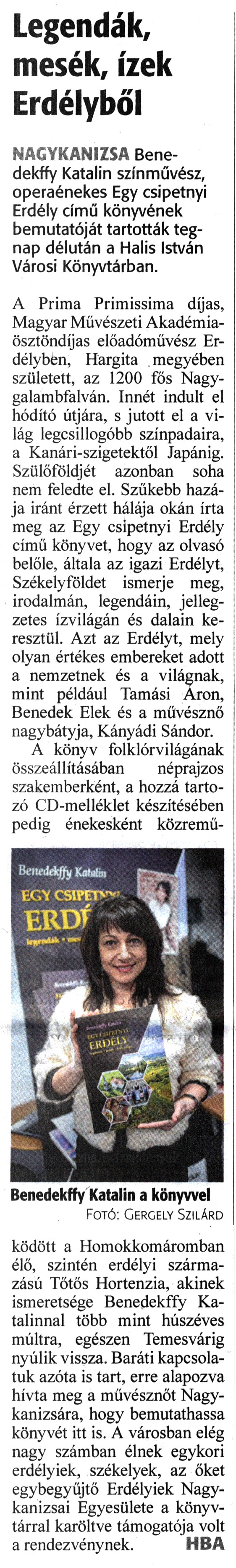 Nyilvános 1135 | 1510 | Zalai Hírlap 2021. december 13. 288. szám 2. oldal | Legendák, mesék, ízek Erdélyből NAGYKANIZSA Benedekffy Katalin színművész, operaénekes Egy csipetnyi Erdély című könyvének bemutatóját tartották tegnap délután a Halis István Városi Könyvtárban. A Prima Primissima díjas, Magyar Művészeti Akadémiaösztöndíjas előadóművész Erdélyben, Hargita megyében született, az 1200 fős Nagygalambfalván. Innét indult el hódító útjára, s jutott el a világ legcsillogóbb színpadaira, a Kanári-szigetektől Japánig. Szülőföldjét azonban soha nem feledte el. Szűkebb hazája iránt érzett hálája okán írta meg az Egy csipetnyi Erdély című könyvet, hogy az olvasó belőle, általa az igazi Erdélyt, Székelyföldet ismerje meg, irodalmán, legendáin, jellegzetes ízvilágán és dalain keresztül. Azt az Erdélyt, mely olyan értékes embereket adott a nemzetnek és a világnak, mint például Tamási Áron, Benedek Elek és a művésznő nagybátyja, Kányádi Sándor. A könyv folklórvilágának összeállításában néprajzos szakemberként, a hozzá tartozó CD-melléklet készítésében pedig énekesként közreműködött a Homokkomáromban élő, szintén erdélyi származású Tőtős Hortenzia, akinek ismeretsége Benedekffy Katalinnal több mint húszéves múltra, egészen Temesvárig nyúlik vissza. Baráti kapcsolatuk azóta is tart, erre alapozva hívta meg a művésznőt Nagykanizsára, hogy bemutathassa könyvét itt is. A városban elég nagy számban élnek egykori erdélyiek, székelyek, az őket egybegyűjtő Erdélyiek Nagykanizsai Egyesülete a könyvtárral karöltve támogatója volt a rendezvénynek. HBA Benedekffy Katalin a könyvvel Fotó: Gergely Szilárd |