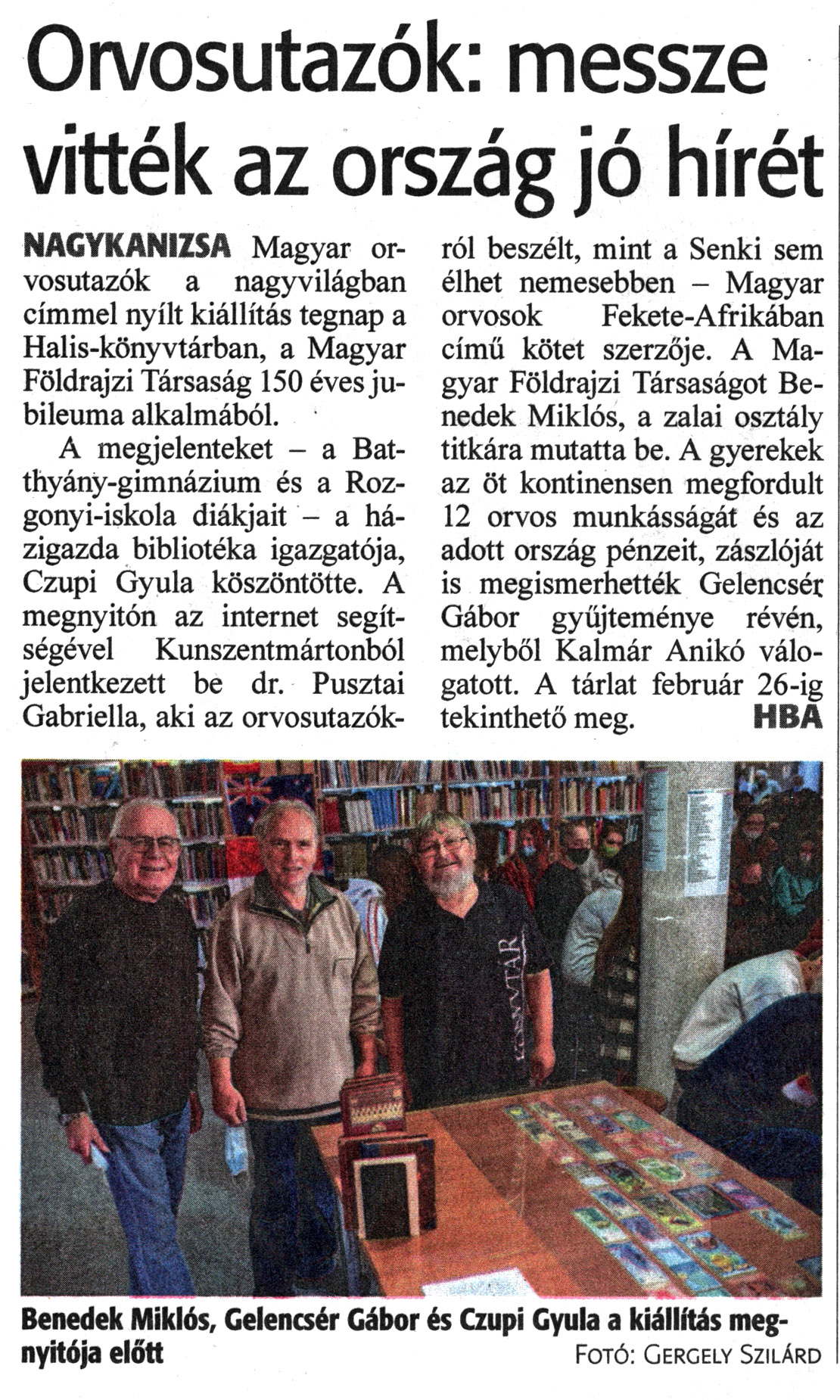 Nyilvános 1161 | 1809 | Zalai Hírlap 2022. január 15. 12. szám 2. oldal | Orvosutazók: messze vitték az ország jó hírét NAGYKANIZSA Magyar orvosutazók a nagyvilágban címmel nyílt kiállítás tegnap a Halis-könyvtárban, a Magyar Földrajzi Társaság 150 éves jubileuma alkalmából. A megjelenteket - a Batthyány-gimnázium és a Rozgonyi-iskola diákjait - a házigazda bibliotéka igazgatója, Czupi Gyula köszöntötte. A megnyitón az internet segítségével Kunszentmártonból jelentkezett be dr. Pusztai Gabriella, aki az orvosutazókról beszélt, mint a Senki sem élhet nemesebben - Magyar orvosok Fekete-Afrikában című kötet szerzője. A Magyar Földrajzi Társaságot Benedek Miklós, a zalai osztály titkára mutatta be. A gyerekek az öt kontinensen megfordult 12 orvos munkásságát és az adott ország pénzeit, zászlóját is megismerhették Gelencsér Gábor gyűjteménye révén, melyből Kalmár Anikó válogatott. A tárlat február 26-ig tekinthető meg. HBA Benedek Miklós, Gelencsér Gábor és Czupi Gyula a kiállítás megnyitója előtt Fotó: Gergely Szilárd |
