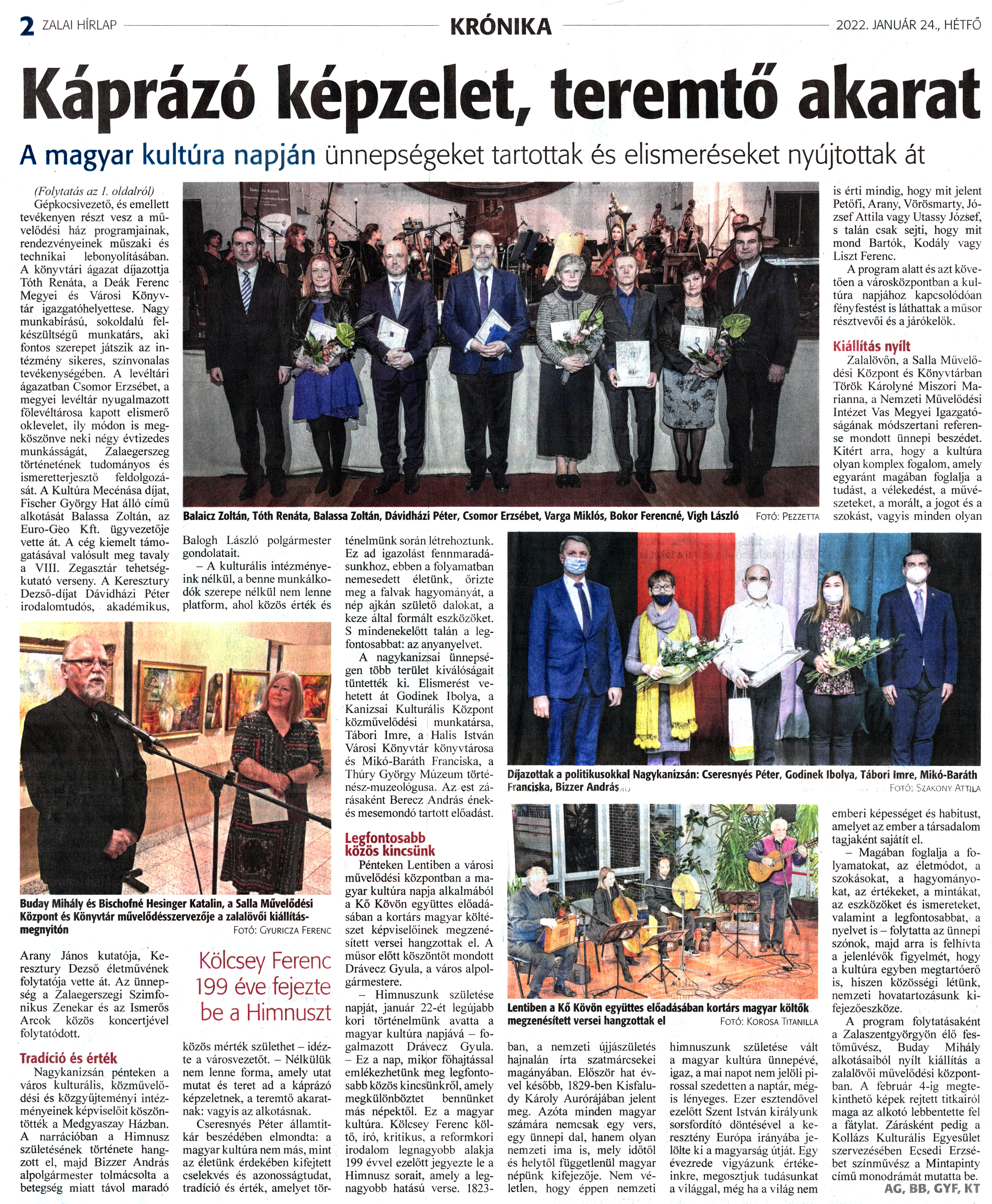 Nyilvános 1127 | 2065 | Zalai Hírlap 2022. január 24. 19. szám 2. oldal | Káprázó képzelet, teremtő akarat A magyar kultúra napján ünnepségeket tartottak és elismeréseket nyújtottak át (Folytatás az 1. oldalról) Gépkocsivezető, és emellett tevékenyen részt vesz a művelődési ház programjainak, rendezvényeinek műszaki és technikai lebonyolításában. A könyvtári ágazat díjazottja Tóth Renáta, a Deák Ferenc Megyei és Városi Könyvtár igazgatóhelyettese. Nagy munkabírású, sokoldalú felkészültségű munkatárs, aki fontos szerepet játszik az intézmény sikeres, színvonalas tevékenységében. A levéltári ágazatban Csomor Erzsébet, a megyei levéltár nyugalmazott főlevéltárosa kapott elismerő oklevelet, ily módon is megköszönve neki négy évtizedes munkásságát, Zalaegerszeg történetének tudományos és ismeretterjesztő feldolgozását. A Kultúra Mecénása díjat, Fischer György Hat álló című alkotását Balassa Zoltán, az Euro-Géo Kft. ügyvezetője vette át. A cég kiemelt támogatásával valósult meg tavaly a VIII. Zegasztár tehetségkutató verseny. A Keresztury Dezső-díjat Dávidházi Péter irodalomtudós, akadémikus. Arany János kutatója, Keresztury Dezső életművének folytatója vette át. Az ünnepség a Zalaegerszegi Szimfonikus Zenekar és az Ismerős Arcok közös koncertjével folytatódott. Tradíció és érték Nagykanizsán pénteken a város kulturális, közművelődési és közgyűjteményi intézményeinek képviselőit köszöntötték a Medgyaszay Házban. A narrációban a Himnusz születésének története hangzott el, majd Bizzer András alpolgármester tolmácsolta a betegség miatt távol maradó Balogh László polgármester gondolatait. - A kulturális intézményeink nélkül, a benne munkálkodók szerepe nélkül nem lenne platform, ahol közös érték és közös mérték születhet - idézte a városvezetőt. - Nélkülük nem lenne forma, amely utat mutat és teret ad a káprázó képzeletnek, a teremtő akaratnak: vagyis az alkotásnak. Cseresnyés Péter államtitkár beszédében elmondta: a magyar kultúra nem más, mint az életünk érdekében kifejtett cselekvés és azonosságtudat, tradíció és érték, amelyet történelmünk során létrehoztunk. Ez ad igazolást fennmaradásunkhoz, ebben a folyamatban nemesedett életünk, őrizte meg a falvak hagyományát, a nép ajkán születő dalokat, a keze által formált eszközöket. S mindenekelőtt talán a legfontosabbat: az anyanyelvet. A nagykanizsai ünnepségen több terület kiválóságait tüntették ki. Elismerést vehetett át Gödinek Ibolya, a Kanizsai Kulturális Központ közművelődési munkatársa, Tábori Imre, a Halis István Városi Könyvtár könyvtárosa és Mikó-Baráth Franciska, a Thúry György Múzeum történész-muzeológusa. Az est zárásaként Berecz András ének-és mesemondó tartott előadást. Legfontosabb közös kincsünk Pénteken Lentiben a városi művelődési központban a magyar kultúra napja alkalmából a Kő Kövön együttes előadásában a kortárs magyar költészet képviselőinek megzenésített versei hangzottak el. A műsor előtt köszöntőt mondott Drávecz Gyula, a város alpolgármestere. - Himnuszunk születése napját, január 22-ét legújabb kori történelmünk avatta a magyar kultúra napjává - fogalmazott Drávecz Gyula. - Ez a nap, mikor főhajtással emlékezhetünk meg legfontosabb közös kincsünkről, amely megkülönböztet bennünket más népektől. Ez a magyar kultúra. Kölcsey Ferenc költő, író, kritikus, a reformkori irodalom legnagyobb alakja 199 évvel ezelőtt jegyezte le a Himnusz sorait, amely a legnagyobb hatású verse. 1823-ban, a nemzeti újjászületés hajnalán írta szatmárcsekei magányában. Először hat évvel később, 1829-ben Kisfaludy Károly Aurórájában jelent meg. Azóta minden magyar számára nemcsak egy vers, egy ünnepi dal, hanem olyan nemzeti ima is, mely időtől és helytől függetlenül magyar népünk kifejezője. Nem véletlen, hogy éppen nemzeti himnuszunk születése vált a magyar kultúra ünnepévé, igaz, a mai napot nem jelöli pirossal szedetten a naptár, mégis lényeges. Ezer esztendővel ezelőtt Szent István királyunk sorsfordító döntésével a keresztény Európa irányába jelölte ki a magyarság útját. Egy évezrede vigyázunk értékeinkre, megosztjuk tudásunkat a világgal, még ha a világ nem is érti mindig, hogy mit jelent Petőfi, Arany, Vörösmarty, József Attila vagy Utassy József, s talán csak sejti, hogy mit mond Bartók, Kodály vagy Liszt Ferenc. A program alatt és azt követően a városközpontban a kultúra napjához kapcsolódóan fényfestést is láthattak a műsor résztvevői és a járókelők. Kiállítás nyílt Zalalövőn, a Salla Művelődési Központ és Könyvtárban Török Károly né Mi szőri Marianna, a Nemzeti Művelődési Intézet Vas Megyei Igazgatóságának módszertani referense mondott ünnepi beszédet. Kitért arra, hogy a kultúra olyan komplex fogalom, amely egyaránt magában foglalja a tudást, a vélekedést, a művészeteket, a morált, a jogot és a szokást, vagyis minden olyan emberi képességet és habitust, amelyet az ember a társadalom tagjaként sajátít el. - Magában foglalja a folyamatokat, az életmódot, a szokásokat, a hagyományokat, az értékeket, a mintákat, az eszközöket és ismereteket, valamint a legfontosabbat, a nyelvet is - folytatta az ünnepi szónok, majd arra is felhívta a jelenlévők figyelmét, hogy a kultúra egyben megtartóerő is, hiszen közösségi létünk, nemzeti hovatartozásunk kifejezőeszköze. A program folytatásaként a Zalaszentgyörgyön élő festőművész, Buday Mihály alkotásaiból nyílt kiállítás a zalalövői művelődési központban. A február 4-ig megtekinthető képek rejtett titkairól maga az alkotó lebbentette fel a fáty