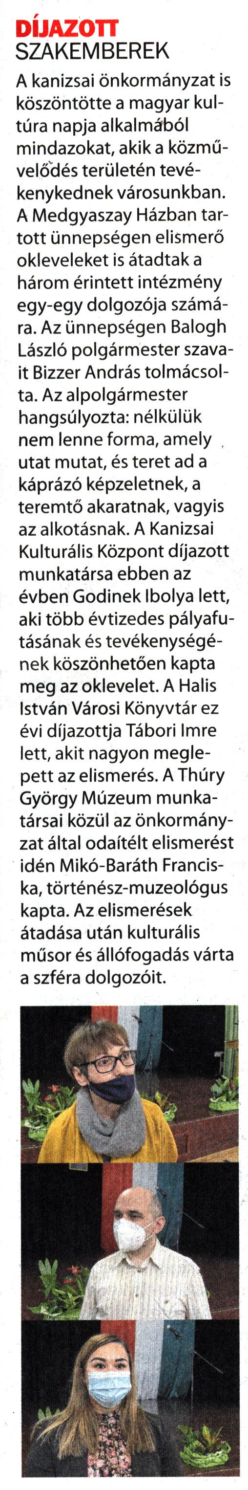 Nyilvános 1226 | 1583 | Kanizsa 2022. január 28. 2. szám 3. oldal | DÍJAZOTT SZAKEMBEREK A kanizsai önkormányzat is köszöntötte a magyar kultúra napja alkalmából mindazokat, akik a közművelődés területén tevékenykednek városunkban. A Medgyaszay Házban tartott ünnepségen elismerő okleveleket is átadtak a három érintett intézmény egy-egy dolgozója számára. Az ünnepségen Balogh László polgármester szavait Bizzer András tolmácsolta. Az alpolgármester hangsúlyozta: nélkülük nem lenne forma, amely utat mutat, és teret ad a káprázó képzeletnek, a teremtő akaratnak, vagyis az alkotásnak. A Kanizsai Kulturális Központ díjazott munkatársa ebben az évben Gödinek Ibolya lett, aki több évtizedes pályafutásának és tevékenységének köszönhetően kapta meg az oklevelet. A Halis István Városi Könyvtár ez évi díjazottja Tábori Imre lett, akit nagyon meglepett az elismerés. A Thúry György Múzeum munkatársai közül az önkormányzat által odaítélt elismerést idén Mikó-Baráth Franciska, történész-muzeológus kapta. Az elismerések átadása után kulturális műsor és állófogadás várta a szféra dolgozóit. |