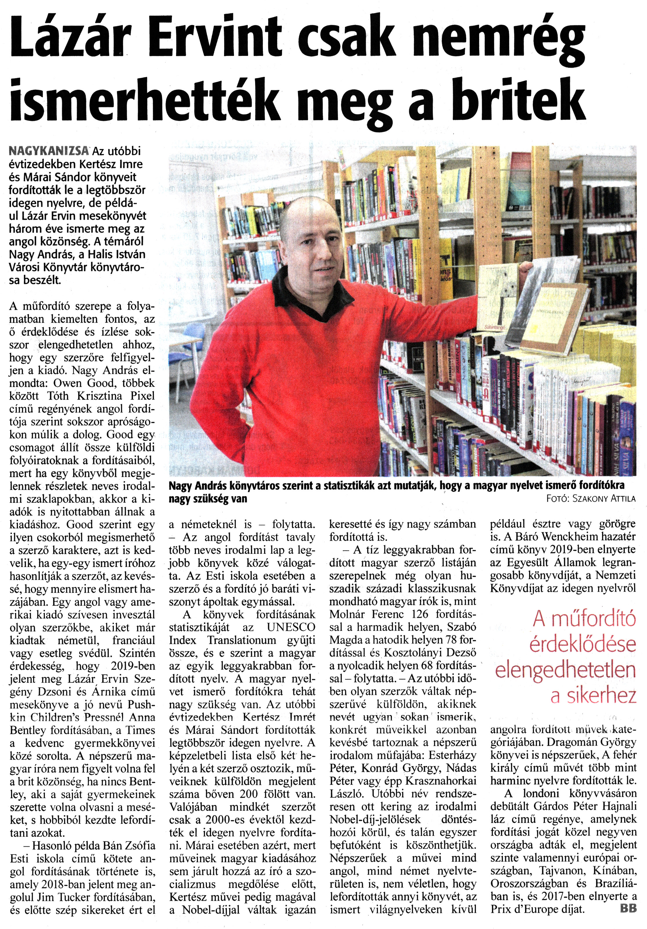 Nyilvános 1123 | 1576 | Zalai Hírlap 2022. február 9. 33. szám 12. oldal | Lázár Ervint csak nemrég ismerhették meg a britek NAGYKANIZSA Az utóbbi évtizedekben Kertész Imre és Márai Sándor könyveit fordították le a legtöbbször idegen nyelvre, de például Lázár Ervin mesekönyvét három éve ismerte meg az angol közönség. A témáról Nagy András, a Halis István Városi Könyvtár könyvtárosa beszélt. A műfordító szerepe a folyamatban kiemelten fontos, az ő érdeklődése és ízlése sokszor elengedhetetlen ahhoz, hogy egy szerzőre felfigyeljen a kiadó. Nagy András elmondta: Owen Good, többek között Tóth Krisztina Pixel című regényének angol fordítója szerint sokszor apróságokon múlik a dolog. Good egy csomagot állít össze külföldi folyóiratoknak a fordításaiból, mert ha egy könyvből megjelennek részletek neves irodalmi szaklapokban, akkor a kiadók is nyitottabban állnak a kiadáshoz. Good szerint egy ilyen csokorból megismerhető a szerző karaktere, azt is kedvelik, ha egy-egy ismert íróhoz hasonlítják a szerzőt, az kevéssé, hogy mennyire elismert hazájában. Egy angol vagy amerikai kiadó szívesen invesztál olyan szerzőkbe, akiket már kiadtak németül, franciául vagy esetleg svédül. Szintén érdekesség, hogy 2019-ben jelent meg Lázár Ervin Szegény Dzsoni és Árnika című mesekönyve a jó nevű Push-kin Children''s Pressnél Anna Bentley fordításában, a Times a kedvenc gyermekkönyvei közé sorolta. A népszerű magyar íróra nem figyelt volna fel a brit közönség, ha nincs Bentley, aki a saját gyermekeinek szerette volna olvasni a meséket, s hobbiból kezdte lefordítani azokat. - Hasonló példa Bán Zsófia Esti iskola című kötete angol fordításának története is, amely 2018-ban jelent meg angolul Jim Tucker fordításában, és előtte szép sikereket ért el a németeknél is - folytatta. - Az angol fordítást tavaly több neves irodalmi lap a legjobb könyvek közé válogatta. Az Esti iskola esetében a szerző és a fordító jó baráti viszonyt ápoltak egymással. A könyvek fordításának statisztikáját az UNESCO Index Translationum gyűjti Össze, és e szerint a magyar az egyik leggyakrabban fordított nyelv. A magyar nyelvet ismerő fordítókra tehát nagy szükség van. Az utóbbi évtizedekben Kertész Imrét és Márai Sándort fordították legtöbbször idegen nyelvre. A képzeletbeli lista első két helyén a két szerző osztozik, műveiknek külföldön megjelent száma bőven 200 fölött van. Valójában mindkét szerzőt csak a 2000-es évektől kezdték el idegen nyelvre fordítani. Márai esetében azért, mert műveinek magyar kiadásához sem járult hozzá az író a szocializmus megdőlése előtt, Kertész művei pedig magával a Nobel-díjjal váltak igazán keresetté és így nagy számban fordítottá is. - A tíz leggyakrabban fordított magyar szerző listáján szerepelnek még olyan huszadik századi klasszikusnak mondható magyar írók is, mint Molnár Ferenc 126 fordítással a harmadik helyen, Szabó Magda a hatodik helyen 78 fordítással és Kosztolányi Dezső a nyolcadik helyen 68 fordítással - folytatta. - Az utóbbi időben olyan szerzők váltak népszerűvé külföldön, akiknek nevét ugyan sokan ismerik, konkrét műveikkel azonban kevésbé tartoznak a népszerű irodalom műfajába: Esterházy Péter, Konrád György, Nádas Péter vagy épp Krasznahorkai László. Utóbbi név rendszeresen ott kering az irodalmi Nobel-díj-jelölések döntéshozói körül, és talán egyszer befutóként is köszönthetjük. Népszerűek a művei mind angol, mind német nyelvterületen is, nem véletlen, hogy lefordították annyi könyvét, az ismert világnyelveken kívül például észtre vagy görögre is. A Báró Wenckheim hazatér című könyv 2019-ben elnyerte az Egyesült Államok legrangosabb könyvdíját, a Nemzeti Könyvdíjat az idegen nyelvről angolra fordított müvek kategóriájában. Dragomán György könyvei is népszerűek, A fehér király című művét több mint harminc nyelvre fordították le. A londoni könyvvásáron debütált Gárdos Péter Hajnali láz című regénye, amelynek fordítási jogát közel negyven országba adták el, megjelent szinte valamennyi európai országban, Tajvanon, Kínában, Oroszországban és Brazíliában is, és 2017-ben elnyerte a Prix d''Europe díjat. BB Nagy András könyvtáros szerint a statisztikák azt mutatják, hogy a magyar nyelvet ismerő fordítókra nagy szükség van Fotó: Szakony Attila |