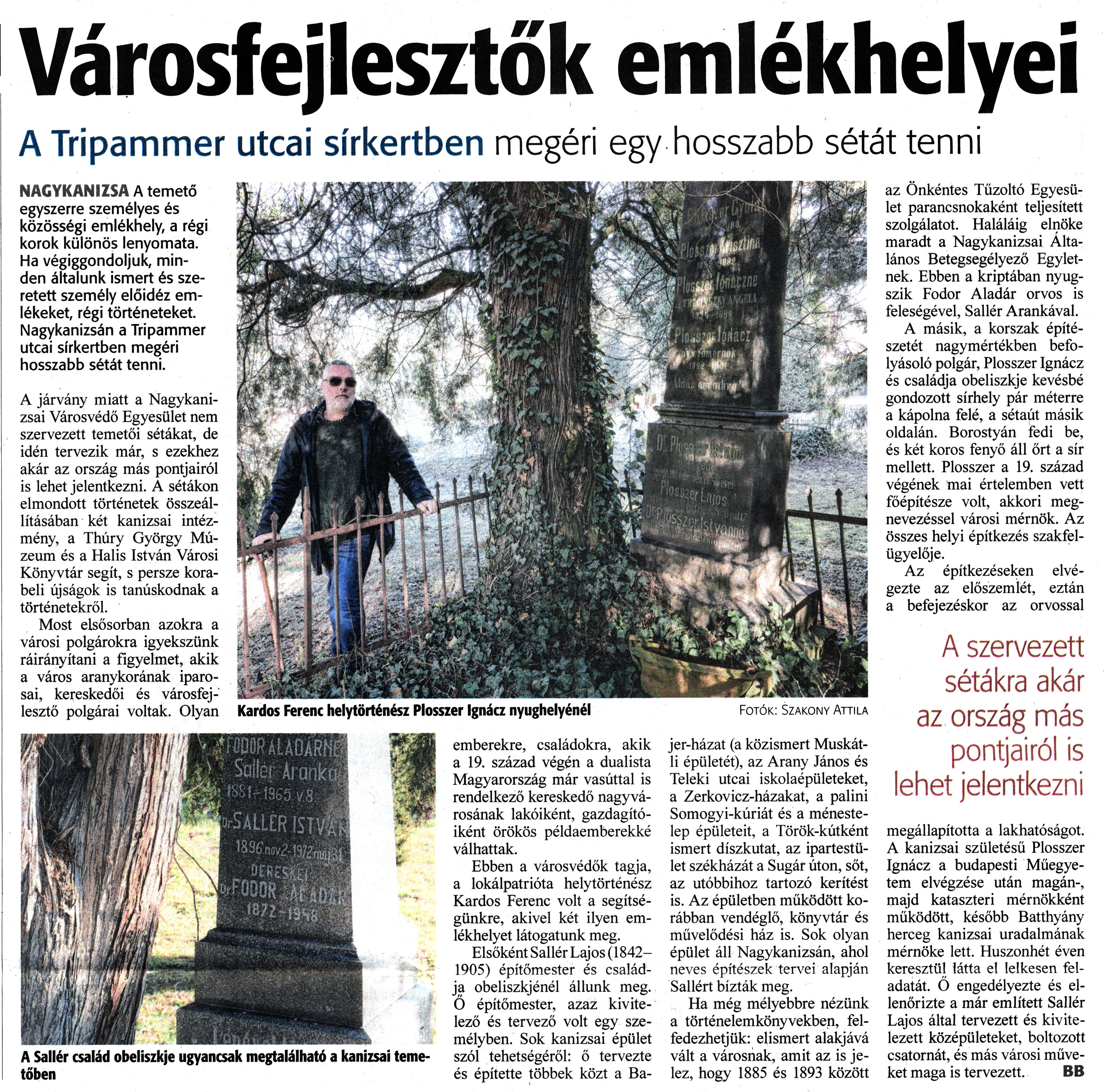 Nyilvános 1118 | 1509 | Zalai Hírlap 2022. február 16. 39. szám 10. oldal | Városfejlesztők emlékhelyei A Tripammer utcai sírkertben megéri egy hosszabb sétát tenni NAGYKANIZSA A temető egyszerre személyes és közösségi emlékhely, a régi korok különös lenyomata. Ha végiggondoljuk, minden általunk ismert és szeretett személy előidéz emlékeket, régi történeteket. Nagykanizsán a Tripammer utcai sírkertben megéri hosszabb sétát tenni. A járvány miatt a Nagykanizsai Városvédő Egyesület nem szervezett temetői sétákat, de idén tervezik már, s ezekhez akár az ország más pontjairól is lehet jelentkezni. A sétákon elmondott történetek összeállításában két kanizsai intézmény, a Thúry György Múzeum és a Halis István Városi Könyvtár segít, s persze korabeli újságok is tanúskodnak a történetekről. Most elsősorban azokra a városi polgárokra igyekszünk ráirányítani a figyelmet, akik a város aranykorának iparosai, kereskedői és városfejlesztő polgárai voltak. Olyan emberekre, családokra, akik a 19. század végén a dualista Magyarország már vasúttal is rendelkező kereskedő nagyvárosának lakóiként, gazdagító-iként örökös példaemberekké válhattak. Ebben a városvédők tagja, a lokálpatrióta helytörténész Kardos Ferenc volt a segítségünkre, akivel két ilyen emlékhelyet látogatunk meg. Elsőként Sallér Lajos (1842-1905) építőmester és családja obeliszkjénél állunk meg. Ő építőmester, azaz kivitelező és tervező volt egy személyben. Sok kanizsai épület szól tehetségéről: ő tervezte és építette többek közt a Bajer-házat (a közismert Muskátli épületét), az Arany János és Teleki utcai iskolaépületeket, a Zerkovicz-házakat, a palini Somogyi-kúriát és a ménestelep épületeit, a Török-kútként ismert díszkutat, az ipartestület székházát a Sugár úton, sőt, az utóbbihoz tartozó kerítést is. Az épületben működött korábban vendéglő, könyvtár és művelődési ház is. Sok olyan épület áll Nagykanizsán, ahol neves építészek tervei alapján Sallért bízták meg. Ha még mélyebbre nézünk a történelemkönyvekben, felfedezhetjük: elismert alakjává vált a városnak, amit az is jelez, hogy 1885 és 1893 között az Önkéntes Tűzoltó Egyesület parancsnokaként teljesített szolgálatot. Haláláig elnöke maradt a Nagykanizsai Általános Betegsegélyező Egyletnek. Ebben a kriptában nyugszik Fodor Aladár orvos is feleségével, Sallér Arankával. A másik, a korszak építészetét nagymértékben befolyásoló polgár, Plosszer Ignácz és családja obeliszkje kevésbé gondozott sírhely pár méterre a kápolna felé, a sétaút másik oldalán. Borostyán fedi be, és két koros fenyő áll őrt a sír mellett. Plosszer a 19. század végének mai értelemben vett főépítésze volt, akkori megnevezéssel városi mérnök. Az összes helyi építkezés szakfelügyelője. Az építkezéseken elvégezte az előszemlét, eztán a befejezéskor az orvossal megállapította a lakhatóságot. A kanizsai születésű Plosszer Ignácz a budapesti Műegyetem elvégzése után magán-, majd kataszteri mérnökként működött, később Batthyány herceg kanizsai uradalmának mérnöke lett. Huszonhét éven keresztül látta el lelkesen feladatát. Ő engedélyezte és ellenőrizte a már említett Sallér Lajos által tervezett és kivitelezett középületeket, boltozott csatornát, és más városi műveket maga is tervezett. BB A Sallér család obeliszkje ugyancsak megtalálható a kanizsai temetőben Kardos Ferenc helytörténész Plosszer Ignácz nyughelyénél Fotók: Szakony Attila |