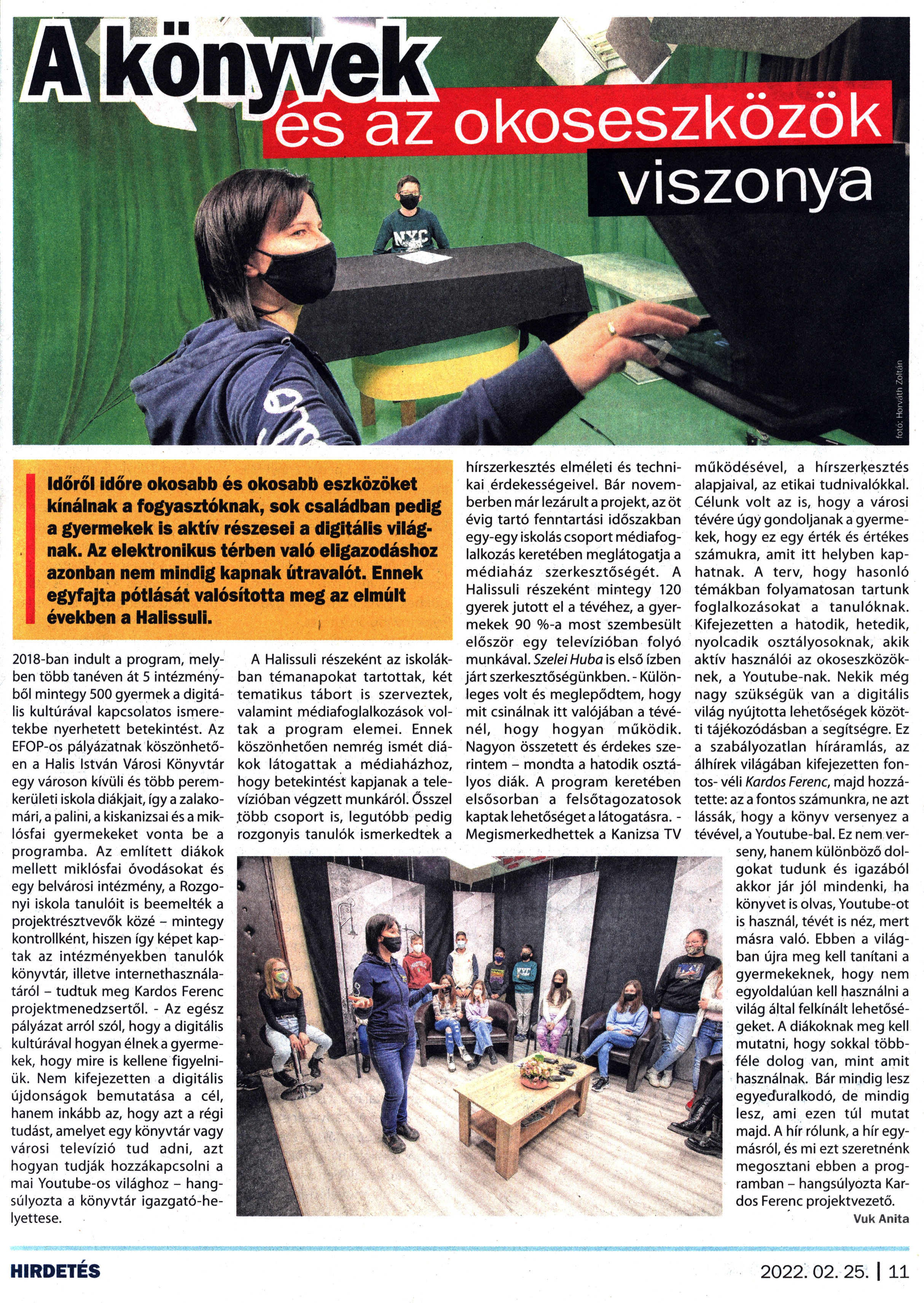 Nyilvános 1227 | 1695 | Kanizsa 2022. február 25. 4. szám 11. oldal | A könyvek és az okoseszközök viszonya Időről időre okosabb és okosabb eszközöket kínálnak a fogyasztóknak, sok családban pedig a gyermekek is aktív részesei a digitális világnak. Az elektronikus térben való eligazodáshoz azonban nem mindig kapnak útravalót. Ennek egyfajta pótlását valósította meg az elmúlt években a Halissuli. 2018-ban indult a program, melyben több tanéven át 5 intézményből mintegy 500 gyermek a digitális kultúrával kapcsolatos ismeretekbe nyerhetett betekintést. Az EFOP-os pályázatnak köszönhetően a Halis István Városi Könyvtár egy városon kívüli és több peremkerületi iskola diákjait, így a zalakomári, a palini, a kiskanizsai és a miklósfai gyermekeket vonta be a programba. Az említett diákok mellett miklósfai óvodásokat és egy belvárosi intézmény, a Rozgo-nyi iskola tanulóit is beemelték a projektrésztvevők közé - mintegy kontrollként, hiszen így képet kaptak az intézményekben tanulók könyvtár, illetve internethasználatáról - tudtuk meg Kardos Ferenc projektmenedzsertől. - Az egész pályázat arról szól, hogy a digitális kultúrával hogyan élnek a gyermekek, hogy mire is kellene figyelniük. Nem kifejezetten a digitális újdonságok bemutatása a cél, hanem inkább az, hogy azt a régi tudást, amelyet egy könyvtár vagy városi televízió tud adni, azt hogyan tudják hozzákapcsolni a mai Youtube-os világhoz - hangsúlyozta a könyvtár igazgató-helyettese. A Halissuli részeként az iskolákban témanapokat tartottak, két tematikus tábort is szerveztek, valamint médiafoglalkozások voltak a program elemei. Ennek köszönhetően nemrég ismét diákok látogattak a médiaházhoz, hogy betekintést kapjanak a televízióban végzett munkáról. Ősszel több csoport is, legutóbb pedig rozgonyis tanulók ismerkedtek a hírszerkesztés elméleti és technikai érdekességeivel. Bár novemberben már lezárult a projekt, az öt évig tartó fenntartási időszakban egy-egy iskolás csoport médiafoglalkozás keretében meglátogatja a médiaház szerkesztőségét. A Halissuli részeként mintegy 120 gyerek jutott el a tévéhez, a gyermekek 90 %-a most szembesült először egy televízióban folyó munkával. Szelei Huba is első ízben járt szerkesztőségünkben. - Különleges volt és meglepődtem, hogy mit csinálnak itt valójában a tévénél, hogy hogyan működik. Nagyon összetett és érdekes szerintem - mondta a hatodik osztályos diák. A program keretében elsősorban a felsőtagozatosok kaptak lehetőséget a látogatásra. -Megismerkedhettek a Kanizsa TV működésével, a hírszerkesztés alapjaival, az etikai tudnivalókkal. Célunk volt az is, hogy a városi tévére úgy gondoljanak a gyermekek, hogy ez egy érték és értékes számukra, amit itt helyben kaphatnak. A terv, hogy hasonló témákban folyamatosan tartunk foglalkozásokat a tanulóknak. Kifejezetten a hatodik, hetedik, nyolcadik osztályosoknak, akik aktív használói az okoseszközöknek, a Youtube-nak. Nekik még nagy szükségük van a digitális világ nyújtotta lehetőségek közötti tájékozódásban a segítségre. Ez a szabályozatlan híráramlás, az álhírek világában kifejezetten fontos- véli Kardos Ferenc, majd hozzátette: az a fontos számunkra, ne azt lássák, hogy a könyv versenyez a tévével, a Youtube-bal. Ez nem verseny, hanem különböző dolgokat tudunk és igazából akkor jár jól mindenki, ha könyvet is olvas, Youtube-ot is használ, tévét is néz, mert másra való. Ebben a világban újra meg kell tanítani a gyermekeknek, hogy nem egyoldalúan kell használni a világ által felkínált lehetőségeket. A diákoknak meg kell mutatni, hogy sokkal többféle dolog van, mint amit használnak. Bár mindig lesz egyeduralkodó, de mindig lesz, ami ezen túl mutat majd. A hír rólunk, a hír egymásról, és mi ezt szeretnénk megosztani ebben a programban - hangsúlyozta Kardos Ferenc projektvezető. Vuk Anita |