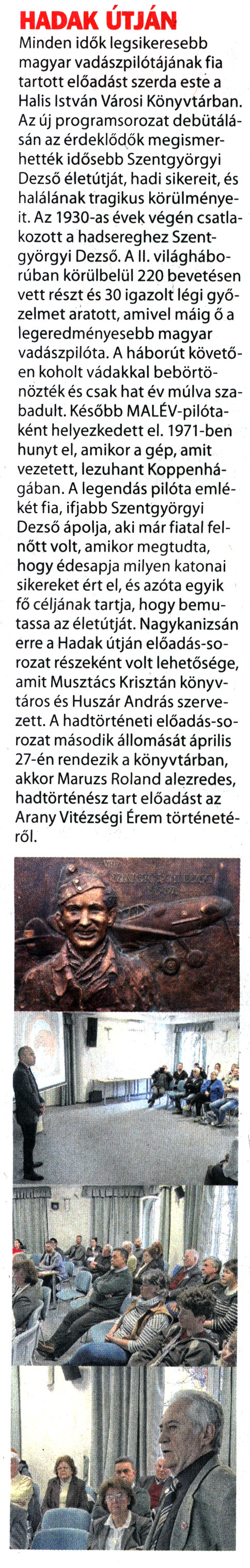Nyilvános 1240 | 1615 | Kanizsa 2022. április 8. 7. szám 3. oldal | HADAK ÚTJÁN Minden idők legsikeresebb magyar vadászpilótájának fia tartott előadást szerda este a Halis István Városi Könyvtárban. Az új programsorozat debütálásán az érdeklődők megismerhették idősebb Szentgyörgyi Dezső életútját, hadi sikereit, és halálának tragikus körülményeit. Az 1930-as évek végén csatlakozott a hadsereghez Szentgyörgyi Dezső. A II. világháborúban körülbelül 220 bevetésen vett részt és 30 igazolt légi győzelmet aratott, amivel máig ő a legeredményesebb magyar vadászpilóta. A háborút követően koholt vádakkal bebörtönözték és csak hat év múlva szabadult. Később MALÉV-pilótaként helyezkedettel. 1971-ben hunyt el, amikor a gép, amit vezetett, lezuhant Koppenhágában. A legendás pilóta emlékét fia, ifjabb Szentgyörgyi Dezső ápolja, aki már fiatal felnőtt volt, amikor megtudta, hogy édesapja milyen katonai sikereket ért el, és azóta egyik fő céljának tartja, hogy bemutassa az életútját. Nagykanizsán erre a Hadak útján előadás-sorozat részeként volt lehetősége, amit Musztács Krisztán könyvtáros és Huszár András szervezett. A hadtörténeti előadás-sorozat második állomását április 27-én rendezik a könyvtárban, akkor Maruzs Roland alezredes, hadtörténész tart előadást az Arany Vitézségi Érem történetéről. |