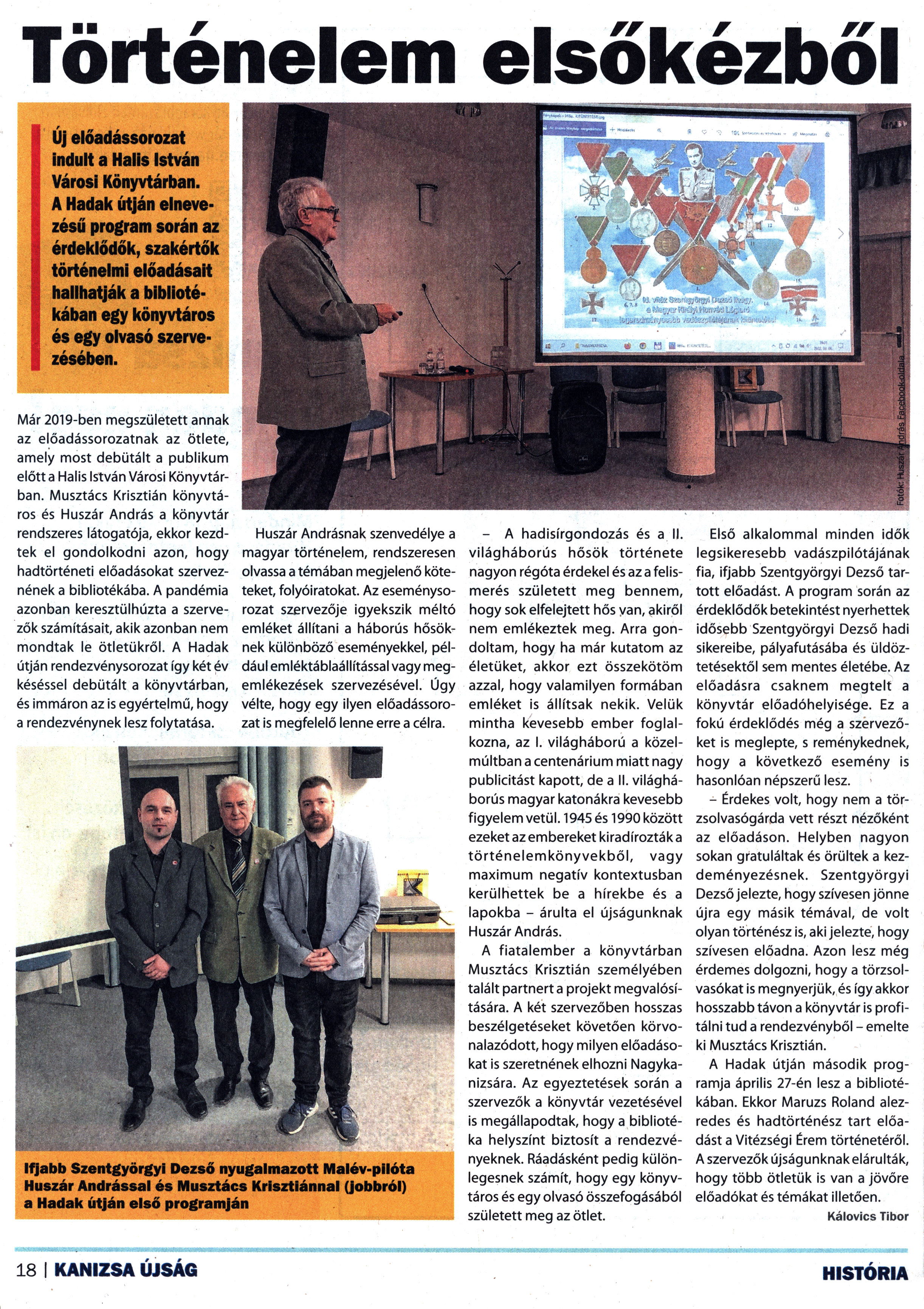 Nyilvános 1245 | 1612 | Kanizsa 2022. április 22. 8. szám 18. oldal | Történelem elsőkézből Új előadássorozat indult a Halis István Városi Könyvtárban. A Hadak útján elnevezésű program során az érdeklődők, szakértők történelmi előadásait hallhatják a bibliotékában egy könyvtáros és egy olvasó szervezésében. Már 2019-ben megszületett annak az előadássorozatnak az ötlete, amely most debütált a publikum előtt a Halis István Városi Könyvtárban. Musztács Krisztián könyvtáros és Huszár András a könyvtár rendszeres látogatója, ekkor kezdtek el gondolkodni azon, hogy hadtörténeti előadásokat szerveznének a bibliotékába. A pandémia azonban keresztülhúzta a szervezők számításait, akik azonban nem mondtak le ötletükről. A Hadak útján rendezvénysorozat így két év késéssel debütált a könyvtárban, és immáron az is egyértelmű, hogy a rendezvénynek lesz folytatása. Huszár Andrásnak szenvedélye a magyar történelem, rendszeresen olvassa a témában megjelenő köteteket, folyóiratokat. Az eseménysorozat szervezője igyekszik méltó emléket állítani a háborús hősöknek különböző eseményekkel, például emléktáblaállítással vagy megemlékezések szervezésével. Úgy vélte, hogy egy ilyen előadássorozat is megfelelő lenne erre a célra. - A hadisírgondozás és a II. világháborús hősök története nagyon régóta érdekel és az a felismerés született meg bennem, hogy sok elfelejtett hős van, akiről nem emlékeztek meg. Arra gondoltam, hogy ha már kutatom az életüket, akkor ezt összekötöm azzal, hogy valamilyen formában emléket is állítsak nekik. Velük mintha kevesebb ember foglalkozna, az I. világháború a közelmúltban a centenárium miatt nagy publicitást kapott, de a II. világháborús magyar katonákra kevesebb figyelem vetül. 1945és 1990 között ezeket az embereket kiradírozták a történelemkönyvekből, vagy maximum negatív kontextusban kerülhettek be a hírekbe és a lapokba - árulta el újságunknak Huszár András. A fiatalember a könyvtárban Musztács Krisztián személyében talált partnert a projekt megvalósítására. A két szervezőben hosszas beszélgetéseket követően körvonalazódott, hogy milyen előadásokat is szeretnének elhozni Nagykanizsára. Az egyeztetések során a szervezők a könyvtár vezetésével is megállapodtak, hogy a bibliotéka helyszínt biztosít a rendezvényeknek. Ráadásként pedig különlegesnek számít, hogy egy könyvtáros és egy olvasó összefogásából született meg az ötlet. Első alkalommal minden idők legsikeresebb vadászpilótájának fia, ifjabb Szentgyörgyi Dezső tartott előadást. A program során az érdeklődők betekintést nyerhettek idősebb Szentgyörgyi Dezső hadi sikereibe, pályafutásába és üldöztetésektől sem mentes életébe. Az előadásra csaknem megtelt a könyvtár előadóhelyisége. Ez a fokú érdeklődés még a szervezőket is meglepte, s reménykednek, hogy a következő esemény is hasonlóan népszerű lesz. - Érdekes volt, hogy nem a törzsolvasógárda vett részt nézőként az előadáson. Helyben nagyon sokan gratuláltak és örültek a kezdeményezésnek. Szentgyörgyi Dezső jelezte, hogy szívesen jönne újra egy másik témával, de volt olyan történész is, aki jelezte, hogy szívesen előadna. Azon lesz még érdemes dolgozni, hogy a törzsolvasókat is megnyerjük, és így akkor hosszabb távon a könyvtár is profitálni tud a rendezvényből - emelte ki Musztács Krisztián. A Hadak útján második programja április 27-én lesz a bibliotékában. Ekkor Maruzs Roland alezredes és hadtörténész tart előadást a Vitézségi Érem történetéről. A szervezők újságunknak elárulták, hogy több ötletük is van a jövőre előadókat és témákat illetően. Kálovics Tibor Ifjabb Szentgyörgyi Dezső nyugalmazott Malév-pilóta Huszár Andrással és Musztács Krisztiánnal (jobbról) a Hadak útján első programján |