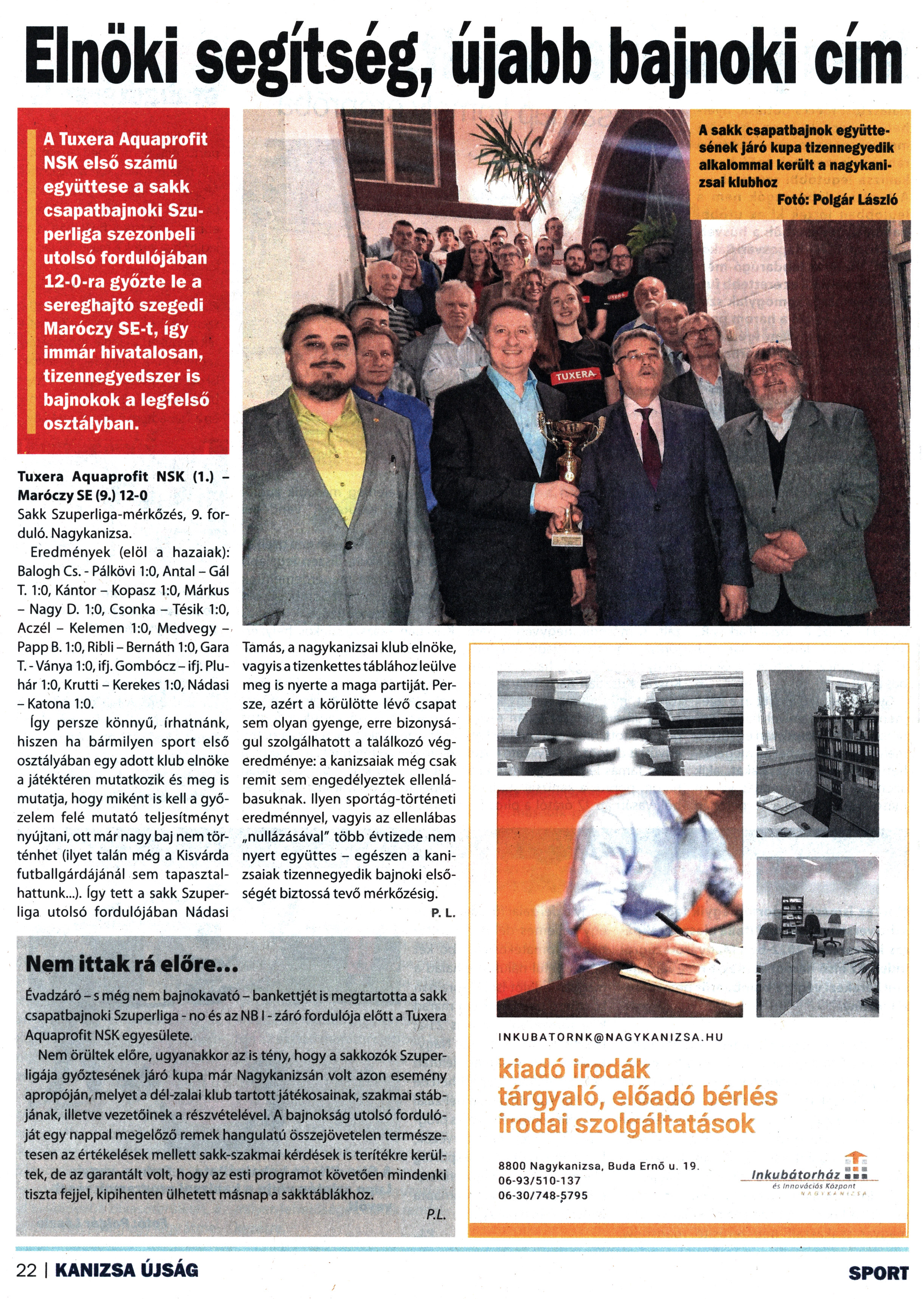 Nyilvános 1204 | 1520 | Kanizsa 2022. április 22. 8. szám 22. oldal | A Tuxera Aquaprofit NSK első számú együttese a sakk csapatbajnoki Szuperliga szezonbeli utolsó fordulójában 12-0-ra győzte le a sereghajtó szegedi Maróczy SE-t, így immár hivatalosan, tizennegyedszer is bajnokok a legfelső osztályban. 19. Elnöki segítség, újabb bajnoki cím Nem ittak rá előre... Tuxera Aquaprofit NSK (1.) -Maróczy SE (9.) 12-0 Sakk Szuperliga-mérkőzés, 9. forduló. Nagykanizsa. Eredmények (elöl a hazaiak): Balogh Cs. - Pálkövi 1:0, Antal - Gál T. 1:0, Kántor - Kopasz 1:0, Márkus - Nagy D. 1:0, Csonka - Tésik 1:0, Aczél - Kelemen 1:0, Medvegy -Papp B. 1:0, Ribli - Bernáth 1:0, Gara T. - Ványa 1:0, ifj. Gombócz - ifj. Plu-hár 1:0, Krutti - Kerekes 1:0, Nádasi -Katona 1:0. így persze könnyű, írhatnánk, hiszen ha bármilyen sport első osztályában egy adott klub elnöke a játéktéren mutatkozik és meg is mutatja, hogy miként is kell a győzelem felé mutató teljesítményt nyújtani, ott már nagy baj nem történhet (ilyet talán még a Kisvárda futballgárdájánál sem tapasztalhattunk...). így tett a sakk Szuperliga utolsó fordulójában Nádasi Tamás, a nagykanizsai klub elnöke, vagyis a tizenkettes táblához leülve meg is nyerte a maga partiját. Persze, azért a körülötte lévő csapat sem olyan gyenge, erre bizonyságul szolgálhatott a találkozó végeredménye: a kanizsaiak még csak remit sem engedélyeztek ellenlábasuknak. Ilyen sportág-történeti eredménnyel, vagyis az ellenlábas „nullázásával" több évtizede nem nyert együttes - egészen a kanizsaiak tizennegyedik bajnoki elsőségét biztossá tevő mérkőzésig. P. L. Évadzáró - s még nem bajnokavató - bankettjét is megtartotta a sakk csapatbajnoki Szuperliga - no és az NBI - záró fordulója előtt a Tuxera Aquaprofit NSK egyesülete. Nem örültek előre, ugyanakkor az is tény, hogy a sakkozók Szuperligája győztesének járó kupa már Nagykanizsán volt azon esemény apropóján, melyet a dél-zalai klub tartott játékosainak, szakmai stábjának, illetve vezetőinek a részvételével. A bajnokság utolsó fordulóját egy nappal megelőző remek hangulatú összejövetelen természetesen az értékelések mellett sakk-szakmai kérdések is terítékre került tek, de az garantált volt, hogy az esti programot követően mindenki tiszta fejjel, kipihenten ülhetett másnapa sakktáblákhoz. Pl. A sakk csapatbajnok együttesének járó kupa tizennegyedik alkalommal került a nagykanizsai klubhoz Fotó: Polgár László |
