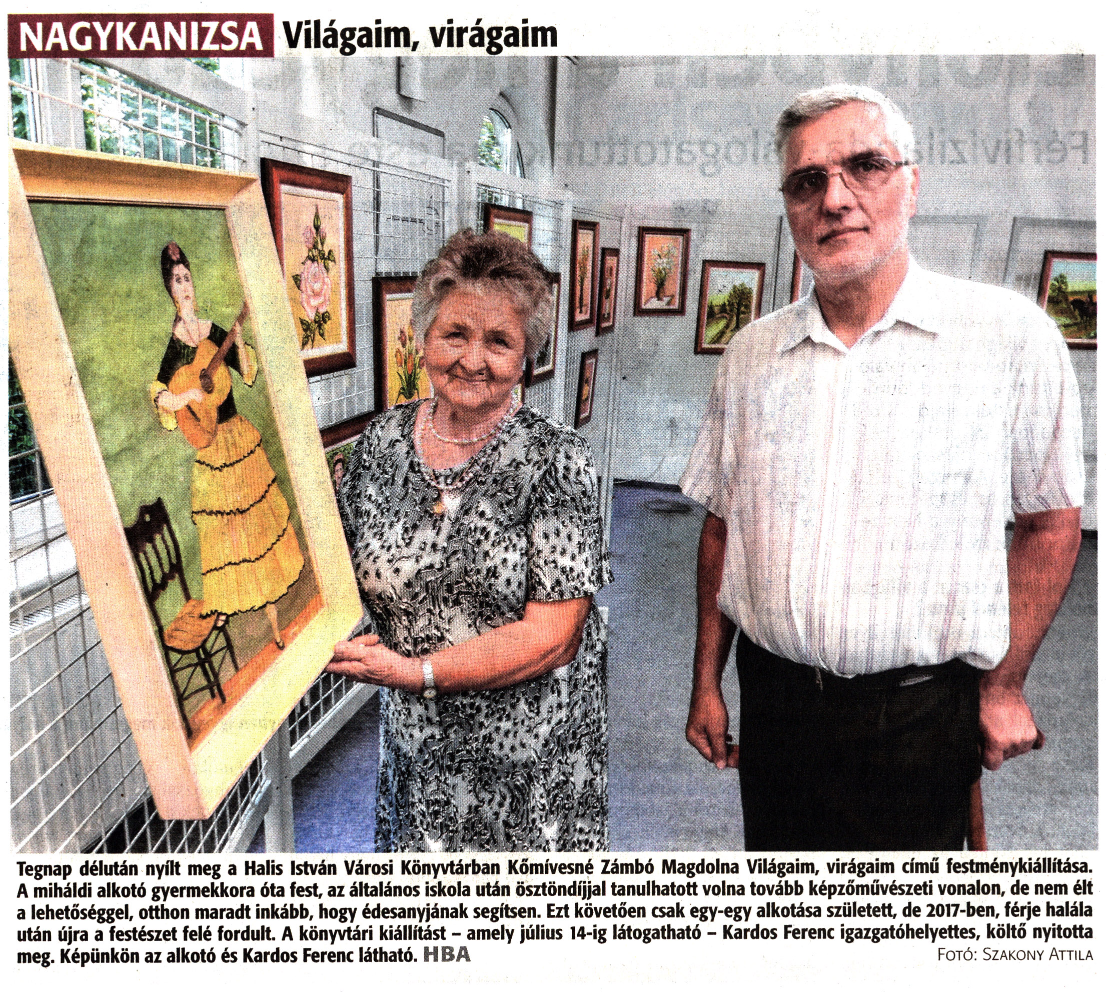 Nyilvános 1035 | 1371 | Zalai Hírlap 2022. június 29. 149. szám 16. oldal | NAGYKANIZSA Világaim, virágaim Tegnap délután nyílt meg a Halis István Városi Könyvtárban Kőmívesné Zámbó Magdolna Világaim, virágaim című festménykiállítása. A miháldi alkotó gyermekkora óta fest, az általános iskola után ösztöndíjjal tanulhatott volna tovább képzőművészeti vonalon, de nem élt a lehetőséggel, otthon maradt inkább, hogy édesanyjának segítsen. Ezt követően csak egy-egy alkotása született, de 2017-ben, férje halála után újra a festészet felé fordult. A könyvtári kiállítást - amely július 14-ig látogatható - Kardos Ferenc igazgatóhelyettes, költő nyitotta meg. Képünkön az alkotó és Kardos Ferenc látható. HBA Fotó: Szakony Attila |