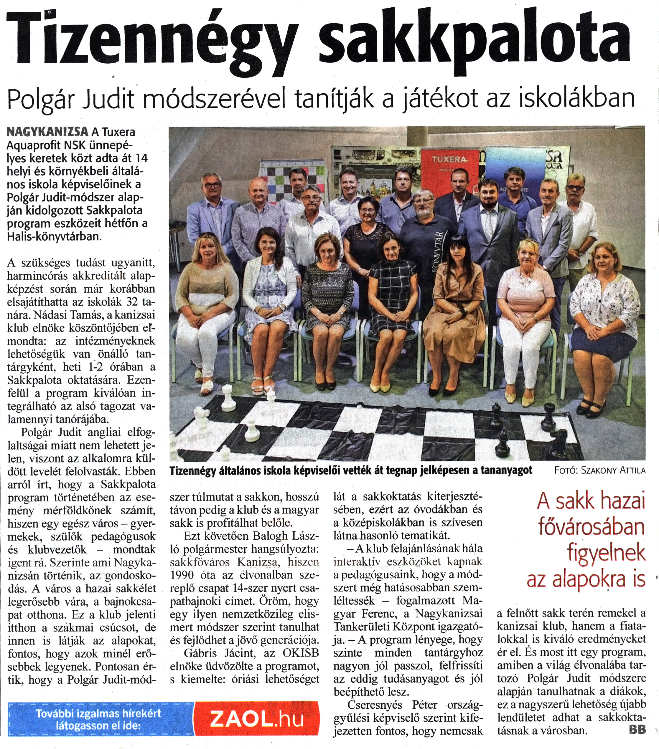Nyilvános 1099 | 1397 | Zalai Hírlap 2022 szeptember 6. 207. szám 13. oldal | Tizennégy sakkpalota Polgár Judit módszerével tanítják a játékot az iskolákban NAGYKANIZSA A Tuxera Aquaprofit NSK ünnepélyes keretek közt adta át 14 helyi és környékbeli általános iskola képviselőinek a Polgár Judit-módszer alapján kidolgozott Sakkpalota program eszközeit hétfőn a Halis-könyvtárban. A szükséges tudást ugyanitt, harmincórás akkreditált alapképzést során már korábban elsajátíthatta az iskolák 32 tanára. Nádasi Tamás, a kanizsai klub elnöke köszöntőjében elmondta: az intézményeknek lehetőségük van önálló tantárgyként, heti 1-2 órában a Sakkpalota oktatására. Ezenfelül a program kiválóan integrálható az alsó tagozat valamennyi tanórájába. Polgár Judit angliai elfoglaltságai miatt nem lehetett jelen, viszont az alkalomra küldött levelét felolvasták. Ebben arról írt, hogy a Sakkpalota program történetében az esemény mérföldkőnek számít, hiszen egy egész város - gyermekek, szülők pedagógusok és klubvezetők - mondtak igent rá. Szerinte ami Nagykanizsán történik, az gondoskodás. A város a hazai sakkélet legerősebb vára, a bajnokcsapat otthona. Ez a klub jelenti itthon a szákmai csúcsot, de innen is látják az alapokat, fontos, hogy azok minél erősebbek legyenek. Pontosan értik, hogy a Polgár Judit-módszer túlmutat a sakkon, hosszú távon pedig a klub és a magyar sakk is profitálhat belőle. Ezt követően Balogh László polgármester hangsúlyozta: sakkfőváros Kanizsa, hiszen 1990 óta az élvonalban szereplő csapat 14-szer nyert csapatbajnoki címet. Öröm, hogy egy ilyen nemzetközileg elismert módszer szerint tanulhat és fejlődhet a jövő generációja. Gábris Jácint, az OKISB elnöke üdvözölte a programot, s kiemelte: óriási lehetőséget lát a sakkoktatás kiterjesztésében, ezért az óvodákban és a középiskolákban is szívesen látna hasonló tematikát. - A klub felajánlásának hála interaktív eszközöket kapnak a pedagógusaink, hogy a módszert még hatásosabban szemléltessék - fogalmazott Magyar Ferenc, a Nagykanizsai Tankerületi Központ igazgatója. - A program lényege, hogy szinte minden tantárgyhoz nagyon jól passzol, felfrissíti az eddig tudásanyagot és jól beépíthető lesz. Cseresnyés Péter országgyűlési képviselő szerint kifejezetten fontos, hogy nemcsak a felnőtt sakk terén remekel a kanizsai klub, hanem a fiatalokkal is kiváló eredményeket ér el. És most itt egy program, amiben a világ élvonalába tartozó Polgár Judit módszere alapján tanulhatnak a diákok, ez a nagyszerű lehetőség újabb lendületet adhat a sakkoktatásnak a városban. BB Tizennégy általános iskola képviselői vették át tegnap jelképesen a tananyagot Fotó: Szakony Attila |