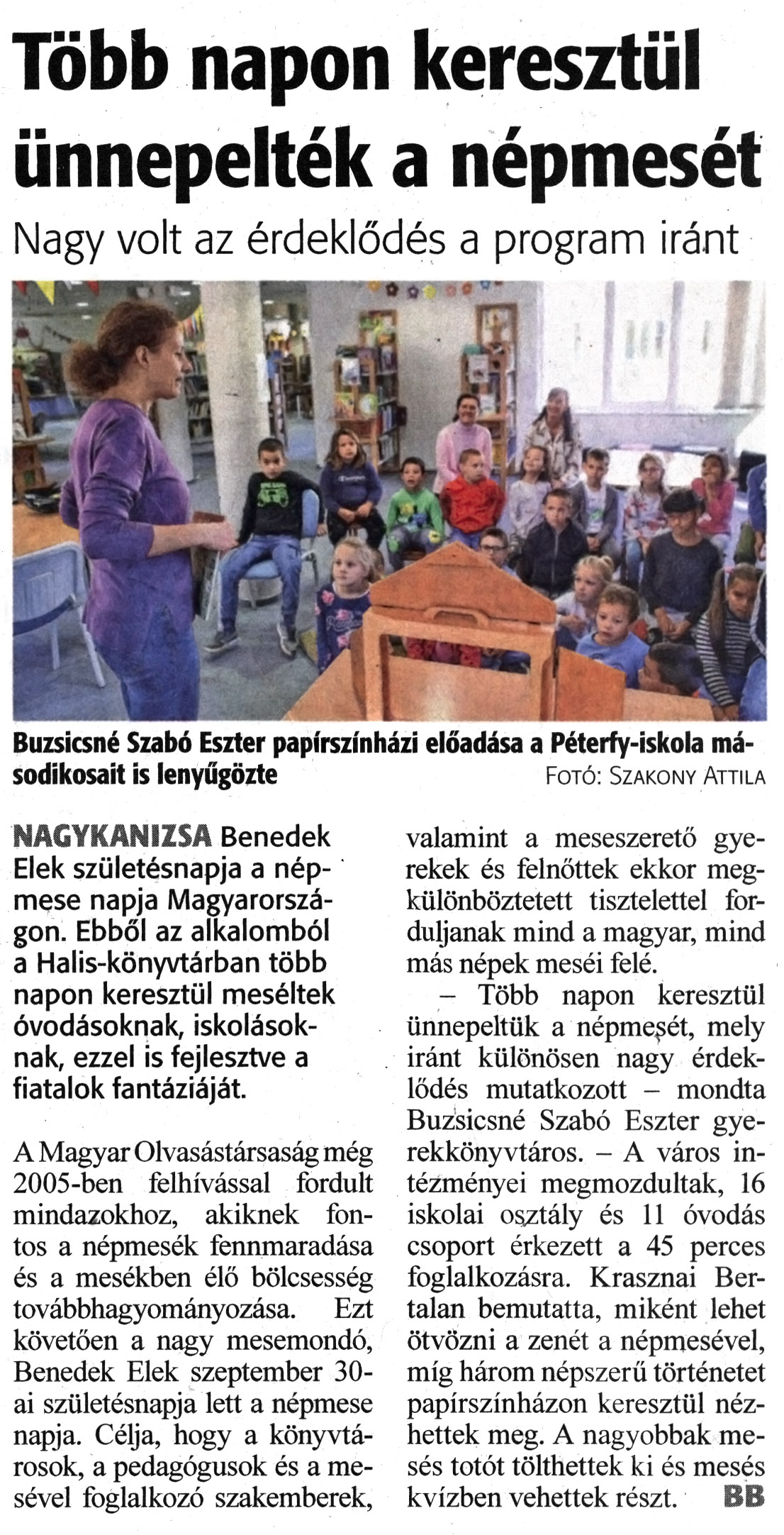 Nyilvános 1121 | 1323 | Zalai Hírlap 2022. október 6. 233. szám 1. oldal | Több napon keresztül ünnepelték a népmesét Nagy volt az érdeklődés a program iránt Buzsicsné Szabó Eszter papírszínházi előadása a Péterfy-iskola másodikosait is lenyűgözte Fotó: Szakony Attila NAGYKANIZSA Benedek Elek születésnapja a népmese napja Magyarországon. Ebből az alkalomból a Halis-könyvtárban több napon keresztül meséltek óvodásoknak, iskolásoknak, ezzel is fejlesztve a fiatalok fantáziáját. A Magyar Olvasástársaság még 2005-ben felhívással fordult mindazokhoz, akiknek fontos a népmesék fennmaradása és a mesékben élő bölcsesség továbbhagyományozása. Ezt követően a nagy mesemondó, Benedek Elek szeptember 30-ai születésnapja lett a népmese napja. Célja, hogy a könyvtárosok, a pedagógusok és a mesével foglalkozó szakemberek, valamint a meseszerető gyerekek és felnőttek ekkor megkülönböztetett tisztelettel forduljanak mind a magyar, mind más népek meséi felé. - Több napon keresztül ünnepeltük a népmesét, mely iránt különösen nagy érdeklődés mutatkozott - mondta Buzsicsné Szabó Eszter gyerekkönyvtáros. - A város intézményei megmozdultak, 16 iskolai osztály és 11 óvodás csoport érkezett a 45 perces foglalkozásra. Krasznai Bertalan bemutatta, miként lehet ötvözni a zenét a népmesével, míg három népszerű történetet papírszínházon keresztül nézhettek meg. A nagyobbak mesés totót tölthettek ki és mesés kvízben vehettek részt. BB |