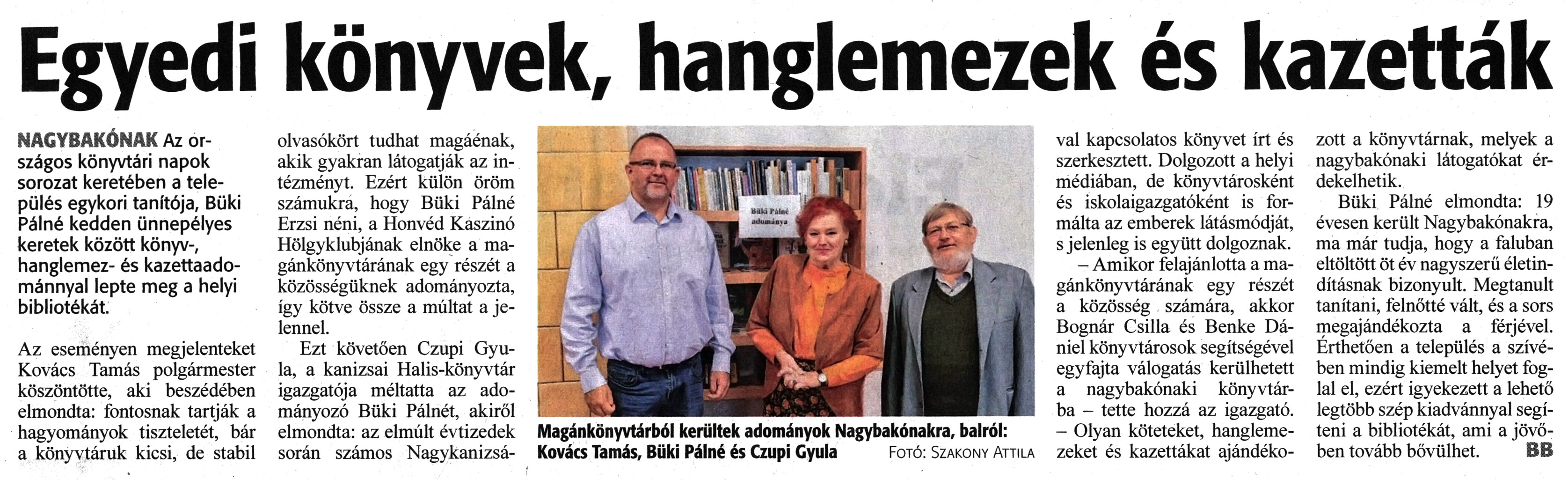 Nyilvános 1035 | 1416 | Zalai Hírlap 2022. október 6. 233. szám 6. oldal | Egyedi könyvek, hanglemezek és kazetták NAGYBAKÓNAK Az országos könyvtári napok sorozat keretében a település egykori tanítója, Büki Pálné kedden ünnepélyes keretek között könyv-, hanglemez- és kazettaadománnyal lepte meg a helyi bibliotékát. Az eseményen megjelenteket Kovács Tamás polgármester köszöntötte, aki beszédében elmondta: fontosnak tartják a hagyományok tiszteletét, bár a könyvtáruk kicsi, de stabil olvasókört tudhat magáénak, akik gyakran látogatják az intézményt. Ezért külön öröm számukra, hogy Büki Pálné Erzsi néni, a Honvéd Kaszinó Hölgyklubjának elnöke a magánkönyvtárának egy részét a közösségüknek adományozta, így kötve össze a múltat a jelennel. Ezt követően Czupi Gyula, a kanizsai Halis-könyvtár igazgatója méltatta az adományozó Büki Pálnét, akiről elmondta: az elmúlt évtizedek során számos Nagykanizsával kapcsolatos könyvet írt és szerkesztett. Dolgozott a helyi médiában, de könyvtárosként és iskolaigazgatóként is formálta az emberek látásmódját, s jelenleg is együtt dolgoznak. - Amikor felajánlotta a magánkönyvtárának egy részét a közösség számára, akkor Bognár Csilla és Benke Dániel könyvtárosok segítségével egyfajta válogatás kerülhetett a nagybakónaki könyvtárba - tette hozzá az igazgató. - Olyan köteteket, hanglemezeket és kazettákat ajándékozott a könyvtárnak, melyek a nagybakónaki látogatókat érdekelhetik. Büki Pálné elmondta: 19 évesen került Nagybakónakra, ma már tudja, hogy a faluban eltöltött öt év nagyszerű életindításnak bizonyult. Megtanult tanítani, felnőtté vált, és a sors megajándékozta a férjével. Érthetően a település a szívében mindig kiemelt helyet foglal el, ezért igyekezett a lehető legtöbb szép kiadvánnyal segíteni a bibliotékát, ami a jövőben tovább bővülhet. BB Magánkönyvtárból kerültek adományok Nagybakónakra, balról: Kovács Tamás, Büki Pálné és Czupi Gyula Fotó: Szakony Attila |