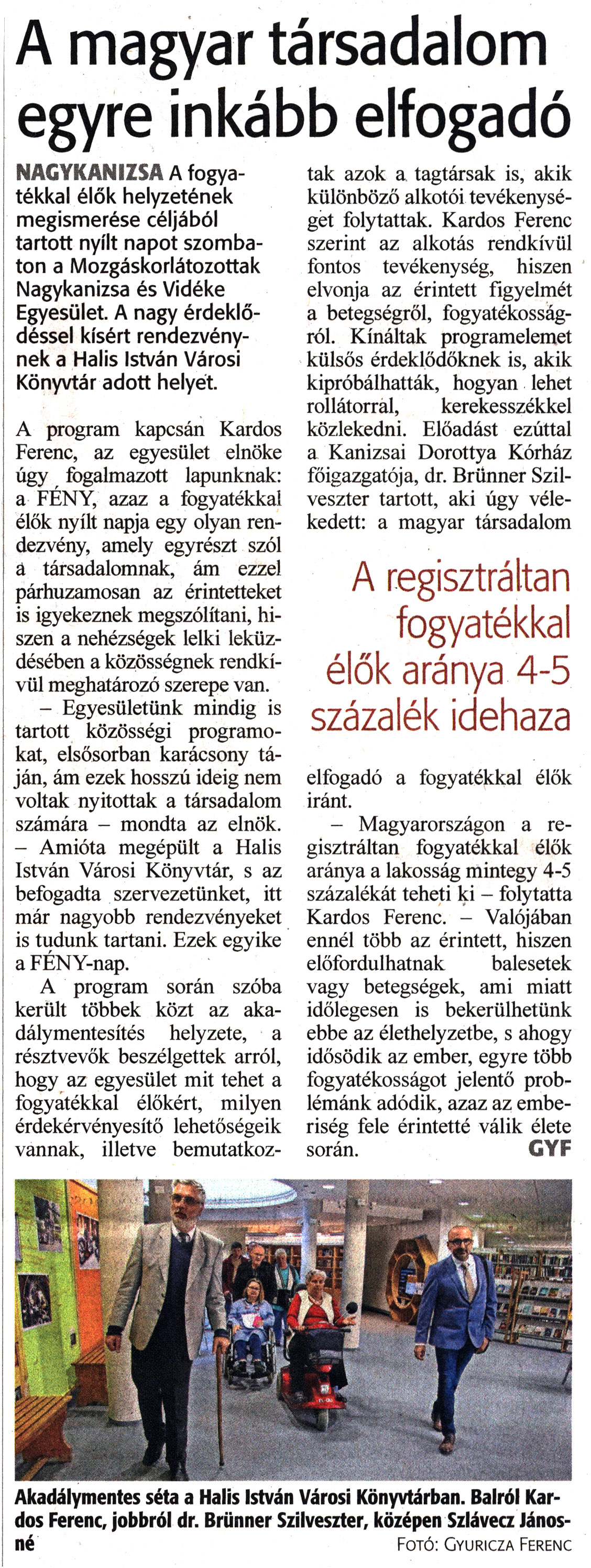 Nyilvános 1181 | 1487 | Zalai Hírlap 2022. október 17. 242. szám 2. oldal | A magyar társadalom egyre inkább elfogadó NAGYKANIZSA A fogyatékkal élők helyzetének megismerése céljából tartott nyílt napot szombaton a Mozgáskorlátozottak Nagykanizsa és Vidéke Egyesület. A nagy érdeklődéssel kísért rendezvénynek a Halis István Városi Könyvtár adott helyét. A program kapcsán Kardos Ferenc, az egyesület elnöke úgy fogalmazott lapunknak: a FÉNY, azaz a fogyatékkal élők nyílt napja egy olyan rendezvény, amely egyrészt szól a társadalomnak, ám ezzel párhuzamosan az érintetteket is igyekeznek megszólítani, hiszen a nehézségek lelki leküzdésében a közösségnek rendkívül meghatározó szerepe van. - Egyesületünk mindig is tartott közösségi programokat, elsősorban karácsony táján, ám ezek hosszú ideig nem voltak nyitottak a társadalom számára - mondta az elnök. - Amióta megépült a Halis István Városi Könyvtár, s az befogadta szervezetünket, itt már nagyobb rendezvényeket is tudunk tartani. Ezek egyike a FÉNY-nap. A program során szóba került többek közt az akadálymentesítés helyzete, a résztvevők beszélgettek arról, hogy az egyesület mit tehet a fogyatékkal élőkért, milyen érdekérvényesítő lehetőségeik vannak, illetve bemutatkoztak azok a tagtársak is, akik különböző alkotói tevékenységet folytattak. Kardos Ferenc szerint az alkotás rendkívül fontos tevékenység, hiszen elvonja az érintett figyelmét a betegségről, fogyatékosságról. Kínáltak programelemet külsős érdeklődőknek is, akik kipróbálhatták, hogyan lehet rollátorral, kerekesszékkel közlekedni. Előadást ezúttal a Kanizsai Dorottya Kórház főigazgatója, dr. Brünner Szilveszter tartott, aki úgy vélekedett: a magyar társadalom elfogadó a fogyatékkal élők iránt. - Magyarországon a regisztráltan fogyatékkal élők aránya a lakosság mintegy 4-5 százalékát teheti ki - folytatta Kardos Ferenc. - Valójában ennél több az érintett, hiszen előfordulhatnak balesetek vagy betegségek, ami miatt időlegesen is bekerülhetünk ebbe az élethelyzetbe, s ahogy idősödik az ember, egyre több fogyatékosságot jelentő problémánk adódik, azaz az emberiség fele érintetté válik élete során. CYF Akadálymentes séta a Halis István Városi Könyvtárban. Balról Kardos Ferenc, jobbról dr. Brünner Szilveszter, középen Szlávecz Jánosné Fotó: Cvuricza Ferenc |