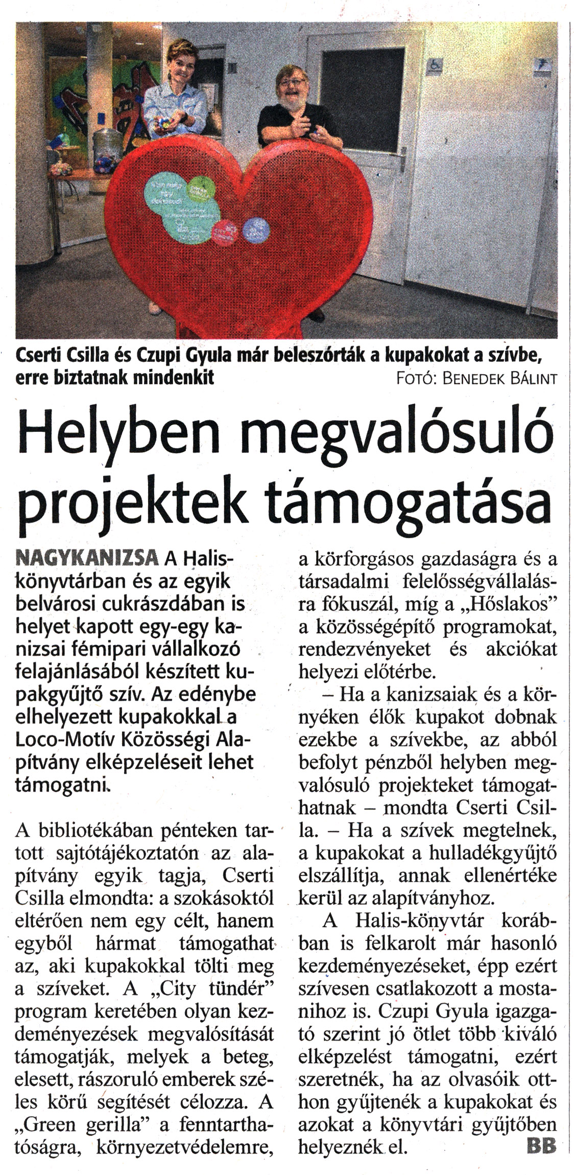 Nyilvános 1038 | 1402 | Zalai Hírlap 2022. november 2. 255. szám 2. oldal | Helyben megvalósuló projektek támogatása NAGYKANIZSA A Halis-könyvtárban és az egyik belvárosi cukrászdában is helyet kapott egy-egy kanizsai fémipari vállalkozó felajánlásából készített kupakgyűjtő szív. Az edénybe elhelyezett kupakokkal a Loco-Motív Közösségi Alapítvány elképzeléseit lehet támogatni. A bibliotékában pénteken tartott sajtótájékoztatón az alapítvány egyik tagja, Cserti Csilla elmondta: a szokásoktól eltérően nem egy célt, hanem egyből hármat támogathat az, aki kupakokkal tölti meg a szíveket. A „City tündér" program keretében olyan kezdeményezések megvalósítását támogatják, melyek a beteg, elesett, rászoruló emberek széles körű segítését célozza. A „Green gerilla" a fenntarthatóságra, környezetvédelemre, a körforgásos gazdaságra és a társadalmi felelősségvállalásra fókuszál, míg a „Hőslakos" a közösségépítő programokat, rendezvényeket és akciókat helyezi előtérbe. - Ha a kanizsaiak és a környéken élők kupakot dobnak ezekbe a szívekbe, az abból befolyt pénzből helyben megvalósuló projekteket támogathatnak - mondta Cserti Csilla. - Ha a szívek megtelnek, a kupakokat a hulladékgyűjtő elszállítja, annak ellenértéke kerül az alapítványhoz. A Halis-könyvtár korábban is felkarolt már hasonló kezdeményezéseket, épp ezért szívesen csatlakozott a mostanihoz is. Czupi Gyula igazgató szerint jó ötlet több kiváló elképzelést támogatni, ezért szeretnék, ha az olvasóik otthon gyűjtenék a kupakokat és azokat a könyvtári gyűjtőben helyeznék el. BB Cserti Csilla és Czupi Gyula már beleszórták a kupakokat a szívbe, erre biztatnak mindenkit Fotó: Benedek Bálint |