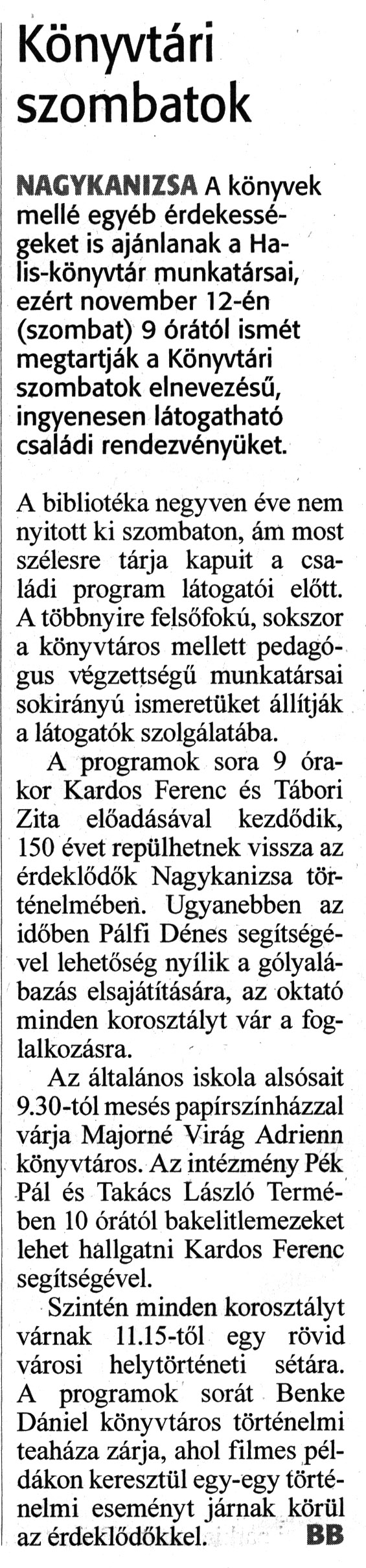 Nyilvános 1062 | 1399 | Zalai Hírlap 2022. november 11. 263. szám 4. oldal | Könyvtári szombatok NAGYKANIZSA A könyvek mellé egyéb érdekességeket is ajánlanak a Halis-könyvtár munkatársai, ezért november 12-én (szombat) 9 órától ismét megtartják a Könyvtári szombatok elnevezésű, ingyenesen látogatható családi rendezvényüket. A bibliotéka negyven éve nem nyitott ki szombaton, ám most szélesre tárja kapuit a családi program látogatói előtt. A többnyire felsőfokú, sokszor a könyvtáros mellett pedagógus végzettségű munkatársai sokirányú ismeretüket állítják a látogatók szolgálatába. A programok sora 9 órakor Kardos Ferenc és Tábori Zita előadásával kezdődik, 150 évet repülhetnek vissza az érdeklődők Nagykanizsa történelmében. Ugyanebben az időben Pálfi Dénes segítségével lehetőség nyílik a gólyalábazás elsajátítására, az oktató minden korosztályt vár a foglalkozásra. Az általános iskola alsósait 9.30-tól mesés papírszínházzal várja Majomé Virág Adrienn könyvtáros. Az intézmény Pék Pál és Takács László Termében 10 órától bakelitlemezeket lehet hallgatni Kardos Ferenc segítségével. Szintén minden korosztályt várnak 11.15-től egy rövid városi helytörténeti sétára. A programok sorát Benke Dániel könyvtáros történelmi teaháza zárja, ahol filmes példákon keresztül egy-egy történelmi eseményt járnak körül az érdeklődőkkel. BB |