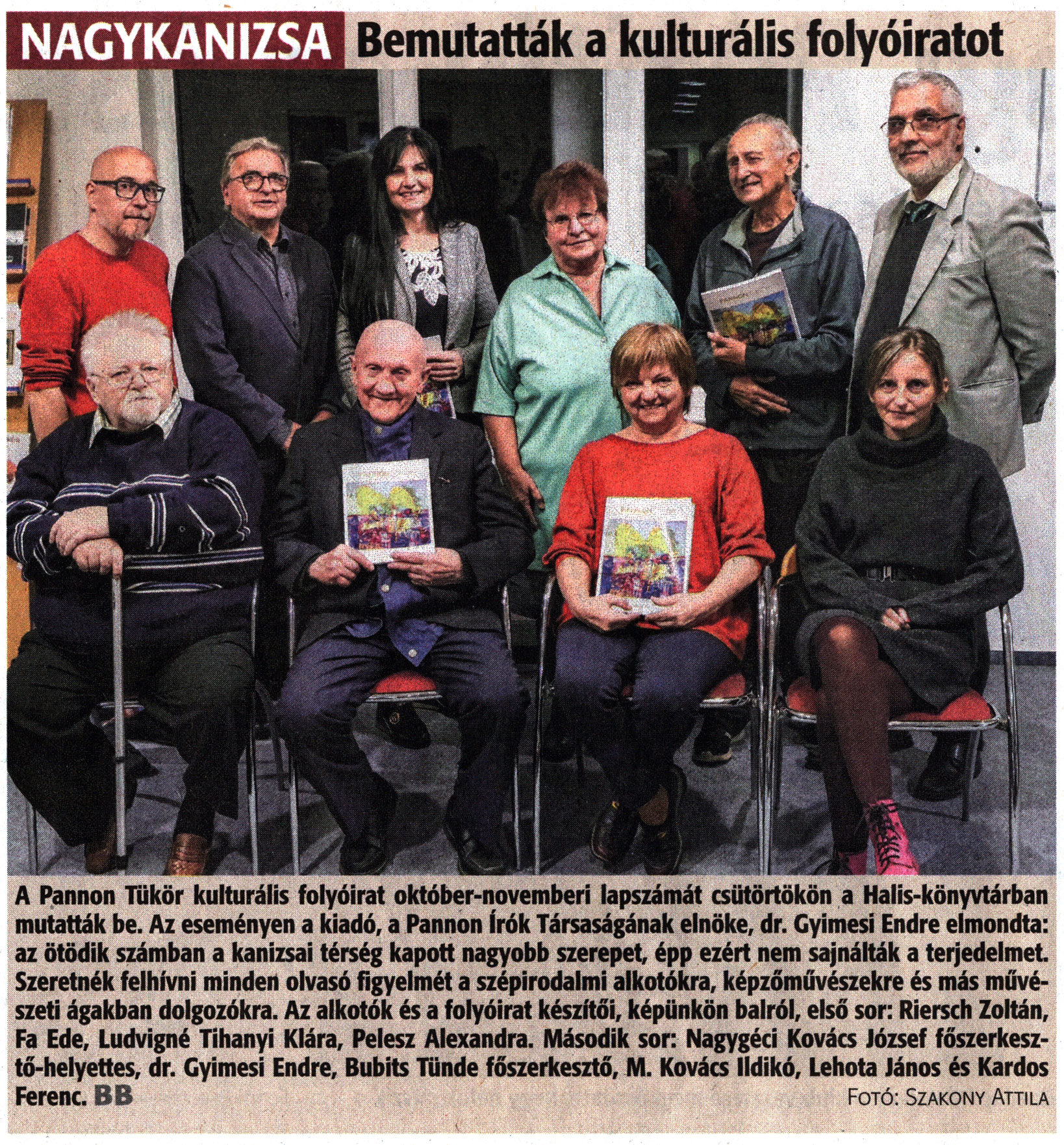 Nyilvános 1071 | 1564 | Zalai Hírlap 2022. november 11. 263. szám 16. oldal | NAGYKANIZSA Bemutatták a kulturális folyóiratot A Pannon Tükör kulturális folyóirat október-novemberi lapszámát csütörtökön a Halis-könyvtárban mutatták be. Az eseményen a kiadó, a Pannon Írók Társaságának elnöke, dr. Gyimesi Endre elmondta: az ötödik számban a kanizsai térség kapott nagyobb szerepet, épp ezért nem sajnálták a terjedelmet Szeretnék felhívni minden olvasó figyelmét a szépirodalmi alkotókra, képzőművészekre és más művészeti ágakban dolgozókra. Az alkotók és a folyóirat készítői, képünkön balról, első sor: Riersch Zoltán, Fa Ede, Ludvigné Tihanyi Klára, Pelesz Alexandra. Második sor: Nagygéci Kovács lózsef főszerkesztő-helyettes, dr. Gyimesi Endre, Bubits Tünde főszerkesztő, M. Kovács Ildikó, Lehota János és Kardos Ferenc. BB Fotó: Szakony Attila |