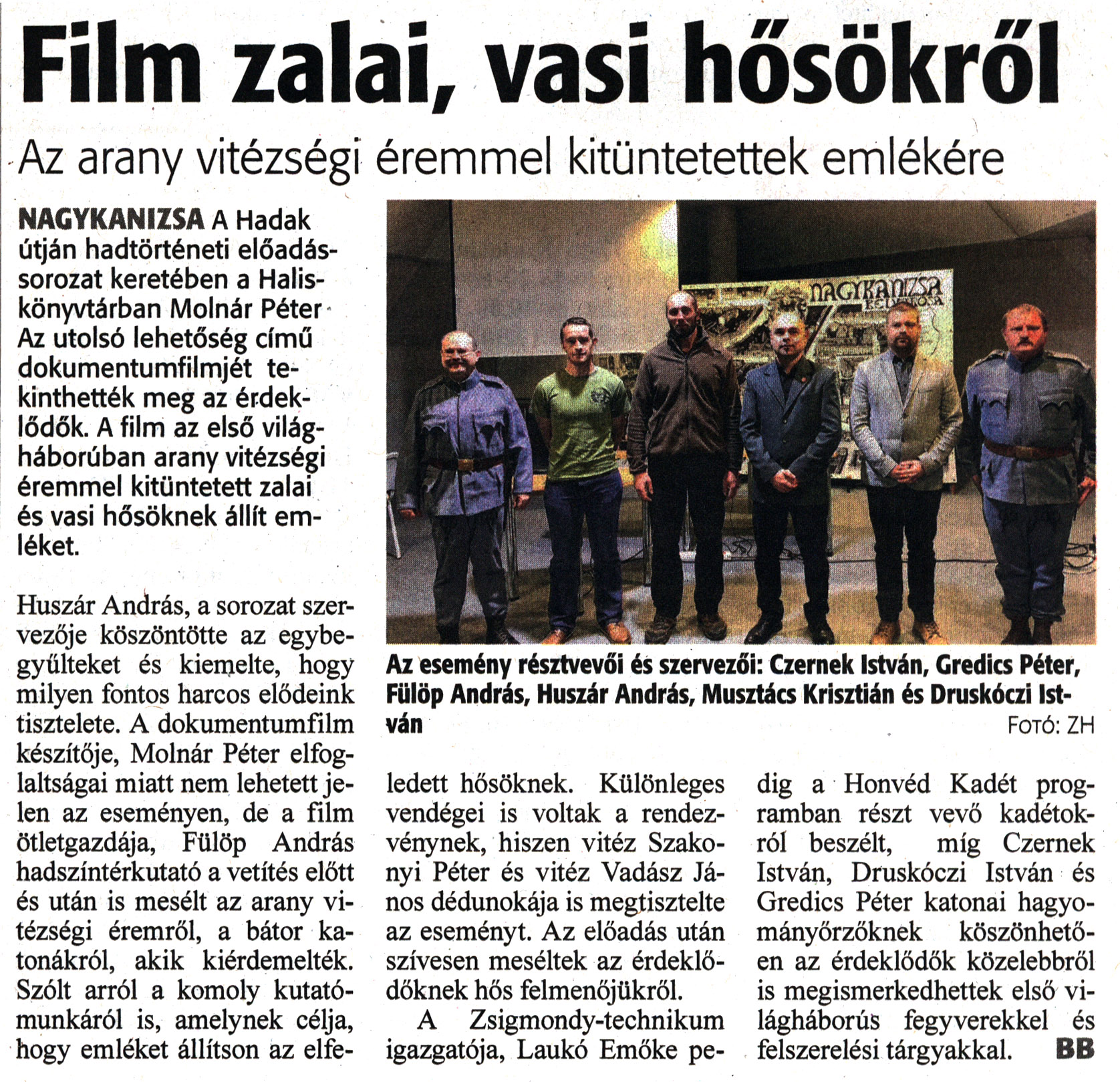 Nyilvános 1044 | 3298 | Zalai Hírlap 2022. december 14. 291. szám 5. oldal | Film zalai, vasi hősökről Az arany vitézségi éremmel kitüntetettek emlékére NAGYKANIZSA A Hadak útján hadtörténeti előadássorozat keretében a Halis-könyvtárban Molnár Péter Az utolsó lehetőség című dokumentumfilmjét tekinthették meg az érdeklődők. A film az első világháborúban arany vitézségi éremmel kitüntetett zalai és vasi hősöknek állít emléket. Huszár András, a sorozat szervezője köszöntötte az egybegyűlteket és kiemelte, hogy milyen fontos harcos elődeink tisztelete. A dokumentumfilm készítője, Molnár Péter elfoglaltságai miatt nem lehetett jelen az eseményen, de a film ötletgazdája, Fülöp András hadszíntérkutató a vetítés előtt és után is mesélt az arany vitézségi éremről, a bátor katonákról, akik kiérdemelték. Szólt arról a komoly kutatómunkáról is, amelynek célja, hogy emléket állítson az elfe- ledett hősöknek. Különleges vendégei is voltak a rendezvénynek, hiszen vitéz Szakonyi Péter és vitéz Vadász János dédunokája is megtisztelte az eseményt. Az előadás után szívesen meséltek az érdeklődőknek hős felmenőjükről. A Zsigmondy-technikum igazgatója, Laukó Emőke pedig a Honvéd Kadét programban részt vevő kadétokról beszélt, míg Czernek István, Druskóczi István és Gredics Péter katonai hagyományőrzőknek köszönhetően az érdeklődők közelebbről is megismerkedhettek első világháborús fegyverekkel és felszerelési tárgyakkal. BB Az esemény résztvevői és szervezői: Czernek István, Gredics Péter, Fülöp András, Huszár András, Musztács Krisztián és Druskóczi István Fotó: ZH |