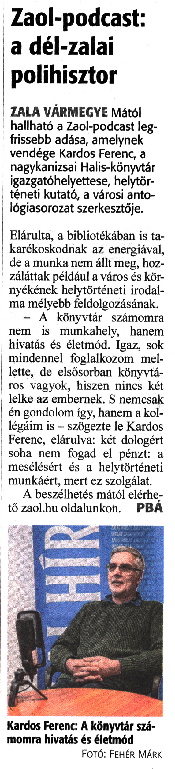 Nyilvános 1021 | 1339 | Zalai Hírlap 2023. február 10. 35. szám 1. oldal | Zaol-podcast: a dél-zalai polihisztor ZALA VÁRMEGYE Mától hallható a Zaol-podcast legfrissebb adása, amelynek vendége Kardos Ferenc, a nagykanizsai Halis-könyvtár igazgatóhelyettese, helytörténeti kutató, a városi antológiasorozat szerkesztője. Elárulta, a bibliotékában is takarékoskodnak az energiával, de a munka nem állt meg, hozzáláttak például a város és környékének helytörténeti irodalma mélyebb feldolgozásának. - A könyvtár számomra nem is munkahely, hanem hivatás és életmód. Igaz, sok mindennel foglalkozom mellette, de elsősorban könyvtáros vagyok, hiszen nincs két lelke az embernek. S nemcsak én gondolom így, hanem a kollégáim is - szögezte le Kardos Ferenc, elárulva: két dologért soha nem fogad el pénzt: a mesélésért és a helytörténeti munkáért, mert ez szolgálat. A beszélhetés mától elérhető zaol.hu oldalunkon. PBÁ Kardos Ferenc: A könyvtár számomra hivatás és életmód Fotó: Fehér Márk |