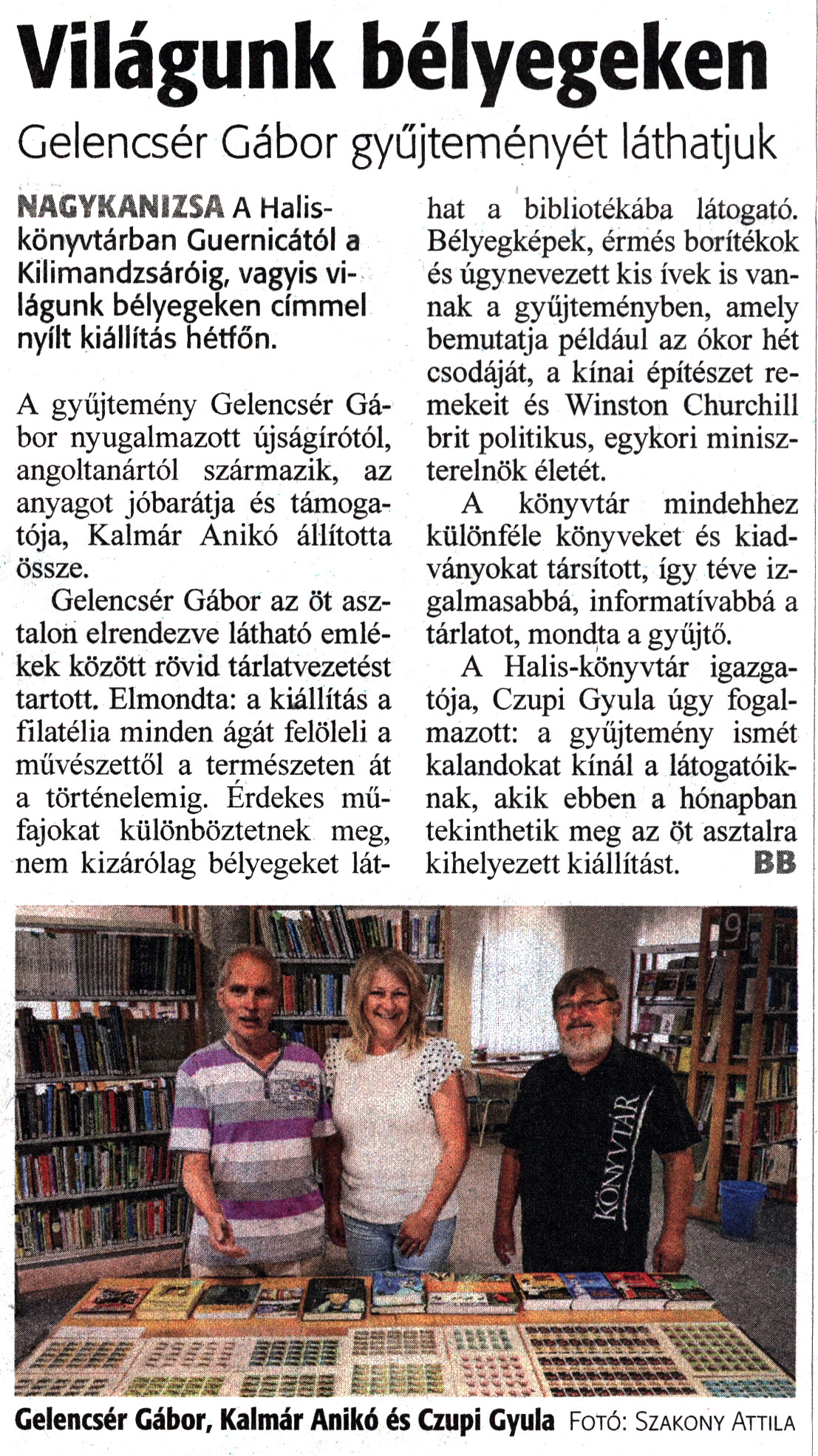 Nyilvános 999 | 1392 | Zalai Hírlap 2023. június 21. 142. szám 16. oldal | Világunk bélyegeken Gelencsér Gábor gyűjteményét láthatjuk NAGYKANIZSA A Halis-könyvtárban Guernicától a Kilimandzsáróig, vagyis világunk bélyegeken címmel nyílt kiállítás hétfőn. A gyűjtemény Gelencsér Gábor nyugalmazott újságírótól, angoltanártól származik, az anyagot jóbarátja és támogatója, Kalmár Anikó állította össze. Gelencsér Gábor az öt asztalon elrendezve látható emlékek között rövid tárlatvezetést tartott. Elmondta: a kiállítás a filatélia minden ágát felöleli a művészettől a természeten át a történelemig. Érdekes műfajokat különböztetnek meg, nem kizárólag bélyegeket lát- hat a bibliotékába látogató. Bélyegképek, érmés borítékok és úgynevezett kis ívek is vannak a gyűjteményben, amely bemutatja például az ókor hét csodáját, a kínai építészet remekeit és Winston Churchill brit politikus, egykori miniszterelnök életét. A könyvtár mindehhez különféle könyveket és kiadványokat társított, így téve izgalmasabbá, informatívabbá a tárlatot, mondta a gyűjtő. A Halis-könyvtár igazgatója, Czupi Gyula úgy fogalmazott: a gyűjtemény ismét kalandokat kínál a látogatóiknak, akik ebben a hónapban tekinthetik meg az öt asztalra kihelyezett kiállítást. BB Gelencsér Gábor, Kalmár Anikó és Czupi Gyula Fotó: Szakony Attila |