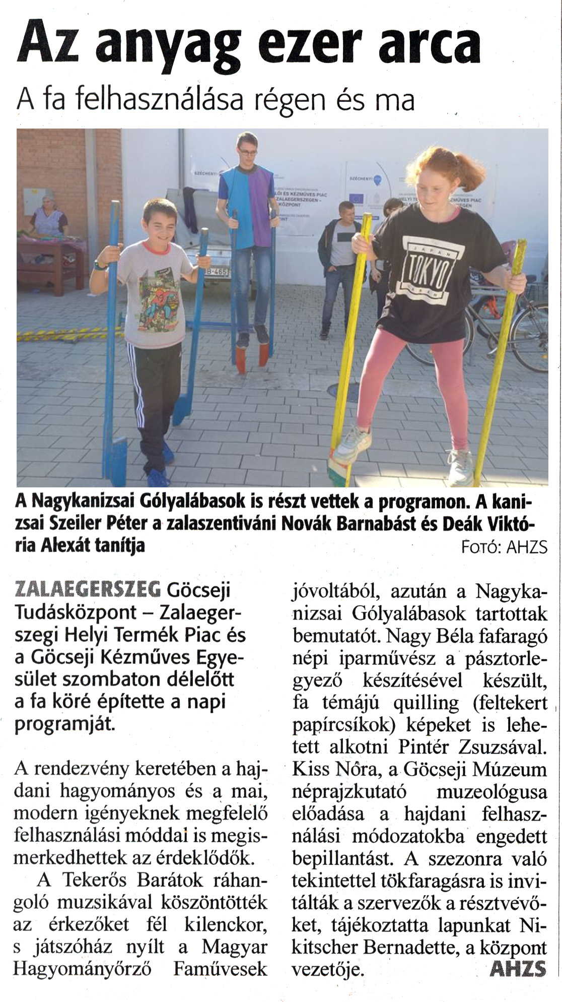 Nyilvános 1201 | 1431 | Zalai Hírlap 2023. október 17. 243. szám 16. oldal - Az anyag ezer arca | Az anyag ezer arca A fa felhasználása régen és ma A Nagykanizsai Gólyalábasok is részt vettek a programon. A kanizsai Szeiler Péter a zalaszentiváni Nóvák Barnabást és Deák Viktória Alexát tanítja Fotó: AHZS ZALAEGERSZEG Göcseji Tudásközpont - Zalaegerszegi Helyi Termék Piac és a Göcseji Kézműves Egyesület szombaton délelőtt a fa köré építette a napi programját. A rendezvény keretében a hajdani hagyományos és a mai, modern igényeknek megfelelő felhasználási móddal is megismerkedhettek az érdeklődők. A Tekerős Barátok ráhangoló muzsikával köszöntötték az érkezőket fél kilenckor, s játszóház nyílt a Magyar Hagyományőrző Faművesek jóvoltából, azután a Nagykanizsai Gólyalábasok tartottak bemutatót. Nagy Béla fafaragó népi iparművész a pásztorlegyező készítésével készült, fa témájú quilling (feltekert papírcsíkok) képeket is lehetett alkotni Pintér Zsuzsával. Kiss Nóra, a Göcseji Múzeum néprajzkutató muzeológusa előadása a hajdani felhasználási módozatokba engedett bepillantást. A szezonra való tekintettel tökfaragásra is invitálták a szervezők a résztvevőket, tájékoztatta lapunkat Nikitscher Bernadette, a központ vezetője. AHZS |