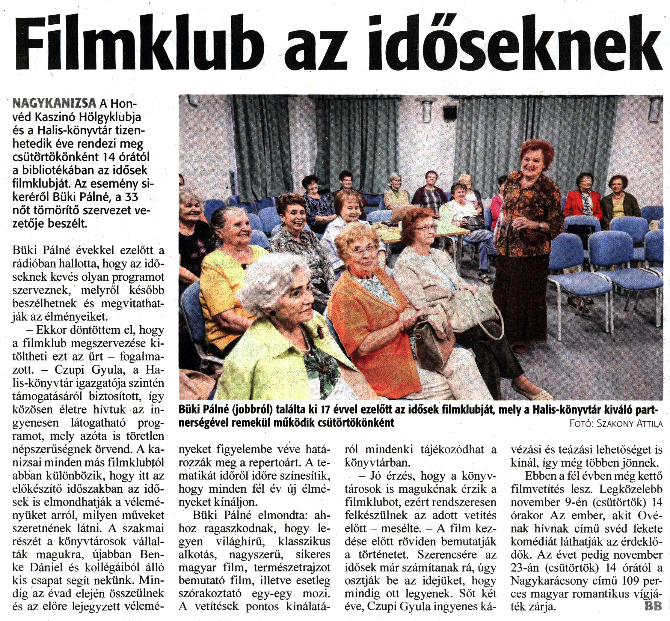 Nyilvános 996 | 1254 | Zalai Hírlap 2023. november 2. 255. szám 6. oldal | Filmklub az időseknek NAGYKANIZSA A Honvéd Kaszinó Hölgyklubja és a Halis-könyvtár tizenhetedik éve rendezi meg csütörtökönként 14 órától a bibliotékában az idősek filmklubját. Az esemény sikeréről Büki Pálné, a 33 nőt tömörítő szervezet vezetője beszélt. Büki Pálné (jobbról) találta ki 17 évvel ezelőtt az idősek filmklubját, mely a Halis-könyvtár kiváló partnerségével remekül működik csütörtökönként Fotó: Szakony Attila Büki Pálné évekkel ezelőtt a rádióban hallotta, hogy az időseknek kevés olyan programot szerveznek, melyről később beszélhetnek és megvitathatják az élményeikét. - Ekkor döntöttem el, hogy a filmklub megszervezése kitöltheti ezt az űrt - fogalmazott. - Czupi Gyula, a Halis-könyvtár igazgatója szintén támogatásáról biztosított, így közösen életre hívtuk az ingyenesen látogatható programot, mely azóta is töretlen népszerűségnek örvend. A kanizsai minden más filmklubtól abban különbözik, hogy itt az előkészítő időszakban az idősek is elmondhatják a véleményüket arról, milyen műveket szeretnének látni. A szakmai részét a könyvtárosok vállalták magukra, újabban Benke Dániel és kollégáiból álló kis csapat segít nekünk. Mindig az évad elején összeülnek és az előre lejegyzett véleményeket figyelembe véve határozzák meg a repertoárt. A tematikát időről időre színesítik, hogy minden fél év új élményeket kínáljon. Büki Pálné elmondta: ahhoz ragaszkodnak, hogy legyen világhírű, klasszikus alkotás, nagyszerű, sikeres magyar film, természetrajzot bemutató film, illetve esetleg szórakoztató egy-egy mozi. A vetítések pontos kínálatáról mindenki tájékozódhat a könyvtárban. - Jó érzés, hogy a könyvtárosok is magukénak érzik a filmklubot, ezért rendszeresen felkészülnek az adott vetítés előtt - mesélte. - A film kezdése előtt röviden bemutatják a történetet. Szerencsére az idősek már számítanak rá, úgy osztják be az idejüket, hogy mindig ott legyenek. Sőt két éve, Czupi Gyula ingyenes kávézási és teázási lehetőséget is kínál, így még többen jönnek. Ebben a fél évben még kettő filmvetítés lesz. Legközelebb november 9-én (csütörtök) 14 órakor Az ember, akit Ové-nak hívnak című svéd fekete komédiát láthatják az érdeklődők. Az évet pedig november 23-án (csütörtök) 14 órától a Nagykarácsony című 109 perces magyar romantikus vígjáték zárja. BB |
