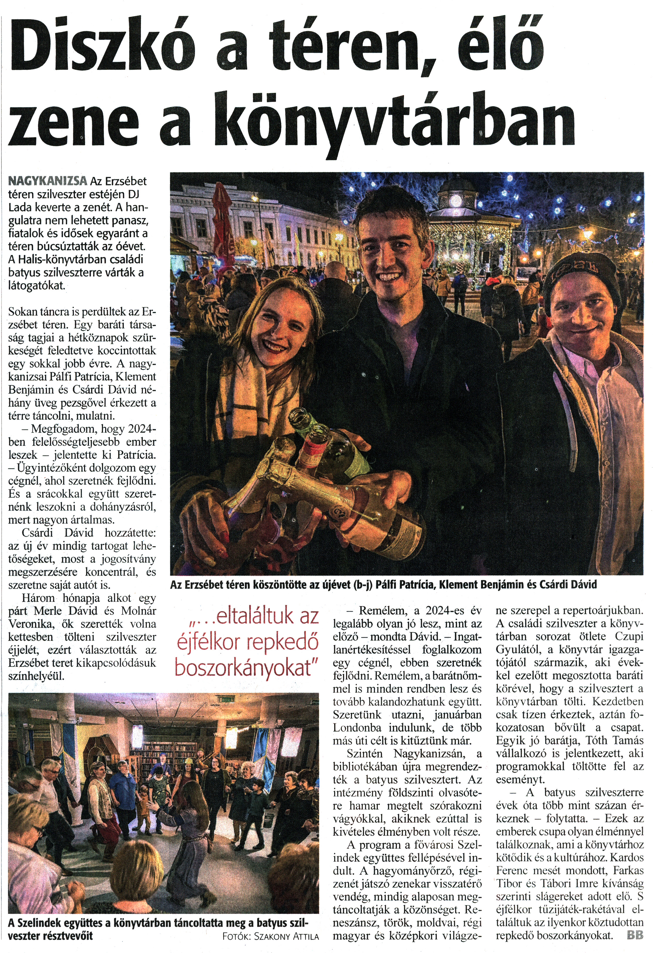Nyilvános 1004 | 1435 | Zalai Hírlap 2024. január 2. 1. szám 3. oldal | Diszkó a téren, élő zene a könyvtárban Az Erzsébet téren köszöntötte az újévet (b-j) Pálfi Patrícia, Klement Benjámin és Csárdi Dávid NAGYKANIZSA Az Erzsébet téren szilveszter estéjén DJ Lada keverte a zenét. A hangulatra nem lehetett panasz, fiatalok és idősek egyaránt a téren búcsúztatták az óévet. A Halis-könyvtárban családi batyus szilveszterre várták a látogatókat. Sokan táncra is perdültek az Erzsébet téren. Egy baráti társaság tagjai a hétköznapok szürkeségét feledtetve koccintottak egy sokkal jobb évre. A nagykanizsai Pálfi Patrícia, Klement Benjámin és Csárdi Dávid néhány üveg pezsgővel érkezett a térre táncolni, mulatni. - Megfogadom, hogy 2024-ben felelősségteljesebb ember leszek - jelentette ki Patrícia. - Ügyintézőként dolgozom egy cégnél, ahol szeretnék fejlődni. És a srácokkal együtt szeretnénk leszokni a dohányzásról, mert nagyon ártalmas. Csárdi Dávid hozzátette: az új év mindig tartogat lehetőségeket, most a jogosítvány megszerzésére koncentrál, és szeretne saját autót is. Három hónapja alkot egy párt Merle Dávid és Molnár Veronika, ők szerették volna kettesben tölteni szilveszter éjjelét, ezért választották az Erzsébet teret kikapcsolódásuk színhelyéül. - Remélem, a 2024-es év legalább olyan jó lesz, mint az előző - mondta Dávid. - Ingatlanértékesítéssel foglalkozom egy cégnél, ebben szeretnék fejlődni. Remélem, a barátnőmmel is minden rendben lesz és tovább kalandozhatunk együtt. Szeretünk utazni, januárban Londonba indulunk, de több más úti célt is kitűztünk már. Szintén Nagykanizsán, a bibliotékában újra megrendezték a bátyus szilvesztert. Az intézmény földszinti olvasótere hamar megtelt szórakozni vágyókkal, akiknek ezúttal is kivételes élményben volt része. A program a fővárosi Szelindek együttes fellépésével indult. A hagyományőrző, régizenétjátszó zenekar visszatérő vendég, mindig alaposan megtáncoltatják a közönséget. Reneszánsz, török, moldvai, régi magyar és középkori világzene szerepel a repertoárjukban. A családi szilveszter a könyvtárban sorozat ötlete Czupi Gyulától, a könyvtár igazgatójától származik, aki évekkel ezelőtt megosztotta baráti körével, hogy a szilvesztert a könyvtárban tölti. Kezdetben csak tízen érkeztek, aztán fokozatosan bővült a csapat. Egyik jó barátja, Tóth Tamás vállalkozó is jelentkezett, aki programokkal töltötte fel az eseményt. - A batyus szilveszterre évek óta több mint százan érkeznek - folytatta. - Ezek az emberek csupa olyan élménnyel találkoznak, ami a könyvtárhoz kötődik és a kultúrához. Kardos Ferenc mesét mondott, Farkas Tibor és Tábori Imre kívánság szerinti slágereket adott elő. S éjfélkor tűzijáték-rakétával eltaláltuk az ilyenkor köztudottan repkedő boszorkányokat. BB A Szelindek együttes a könyvtárban táncoltatta meg a bátyus szilveszter résztvevőit Fotók: Szakony Attila |