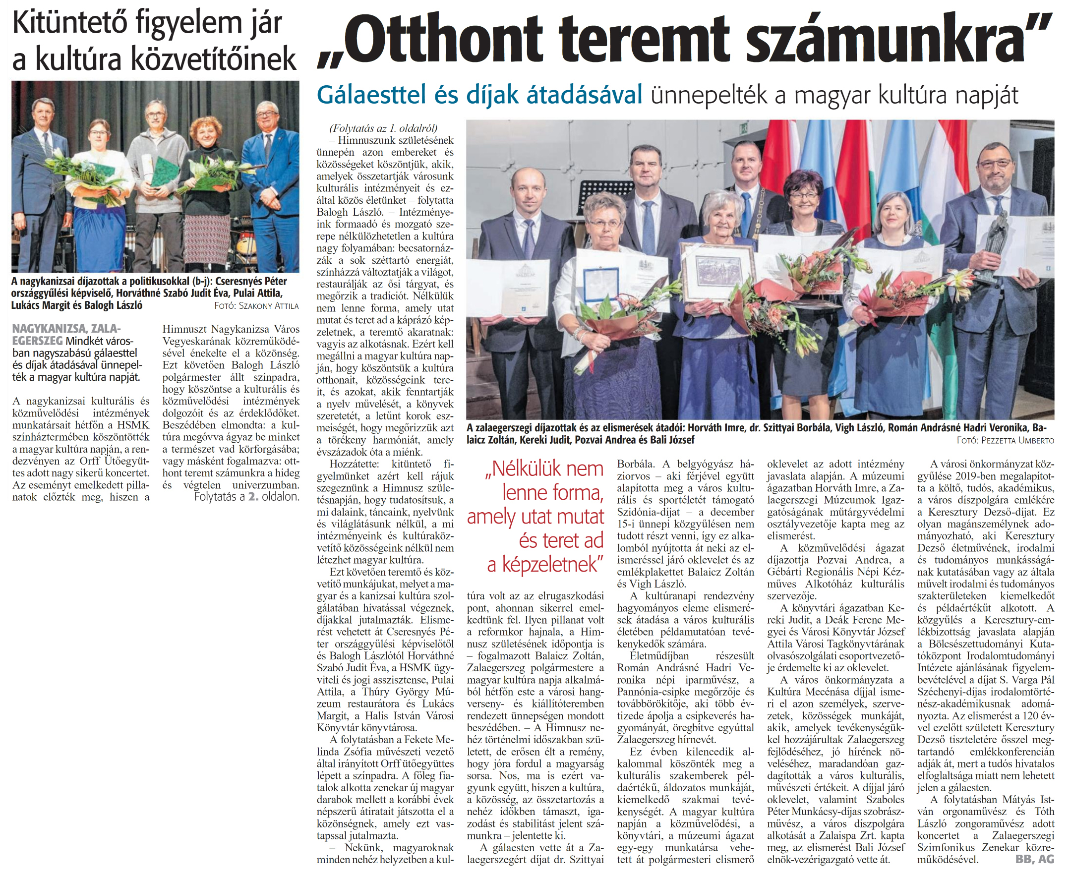 Nyilvános 1016 | 1886 | Zalai Hírlap 2024. január 24. 20. szám 1-2. oldal | Kitüntető figyelem jár a kultúra közvetítőinek A nagykanizsai díjazottak a politikusokkal (b-j): Cseresnyés Péter országgyűlési képviselő, Horváthné Szabó Judit Éva, Pulai Attila, Lukács Margit és Balogh László Fotó: Szakony Attila NAGYKANIZSA, ZALAEGERSZEG Mindkét városban nagyszabású gálaesttel és díjak átadásával ünnepelték a magyar kultúra napját. A nagykanizsai kulturális és közművelődési intézmények munkatársait hétfőn a HSMK színháztermében köszöntötték a magyar kultúra napján, a rendezvényen az Orff Ütőegyüttes adott nagy sikerű koncertet. Az eseményt emelkedett pillanatok előzték meg, hiszen a Himnuszt Nagykanizsa Város Vegyeskarának közreműködésével énekelte el a közönség. Ezt követően Balogh László polgármester állt színpadra, hogy köszöntse a kulturális és közművelődési intézmények dolgozóit és az érdeklődőket. Beszédében elmondta: a kultúra megóvva ágyaz be minket a természet vad körforgásába; vagy másként fogalmazva: otthont teremt számunkra a hideg és végtelen univerzumban. Folytatás a 2. oldalon. „Otthont teremt számunkra" Gálaesttel és díjak átadásával ünnepelték a magyar kultúra napját A zalaegerszegi díjazottak és az elismerések átadói: Horváth Imre, dr. Szittyái Borbála, Vigh László, Román Andrásné Hadri Veronika, Balaicz Zoltán, Kereki Judit, Pozvai Andrea és Bali József Fotó: Pezzetta Umberto (Folytatás az 1. oldalról) - Himnuszunk születésének ünnepén azon embereket és közösségeket köszöntjük, akik, amelyek összetartják városunk kulturális intézményeit és ezáltal közös életünket - folytatta Balogh László. - Intézményeink formaadó és mozgató szerepe nélkülözhetetlen a kultúra nagy folyamában: becsatornázzák a sok széttartó energiát, színházzá változtatják a világot, restaurálják az ősi tárgyat, és megőrzik a tradíciót. Nélkülük nem lenne forma, amely utat mutat és teret ad a káprázó képzeletnek, a teremtő akaratnak: vagyis az alkotásnak. Ezért kell megállni a magyar kultúra napján, hogy köszöntsük a kultúra otthonait, közösségeink tereit, és azokat, akik fenntartják a nyelv művelését, a könyvek szeretetét, a letűnt korok eszmeiségét, hogy megőrizzük azt a törékeny harmóniát, amely évszázadok óta a miénk. Hozzátette: kitüntető figyelmünket azért kell rájuk szegeznünk a Himnusz születésnapján, hogy tudatosítsuk, a mi dalaink, táncaink, nyelvünk és világlátásunk nélkül, a mi intézményeink és kultúraközvetítő közösségeink nélkül nem létezhet magyar kultúra. Ezt követően teremtő és közvetítő munkájukat, melyet a magyar és a kanizsai kultúra szolgálatában hivatással végeznek, díjakkal jutalmazták. Elismerést vehetett át Cseresnyés Péter országgyűlési képviselőtől és Balogh Lászlótól Horváthné Szabó Judit Éva, a HSMK ügyviteli és jogi asszisztense, Pulai Attila, a Thúry György Múzeum restaurátora és Lukács Margit, a Malis István Városi Könyvtár könyvtárosa. A folytatásban a Fekete Melinda Zsófia művészeti vezető által irányított Orff ütőegyüttes lépett a színpadra. A főleg fiatalok alkotta zenekar új magyar darabok mellett a korábbi évek népszerű átiratait játszotta el a közönségnek, amely ezt vastapssal jutalmazta. - Nekünk, magyaroknak minden nehéz helyzetben a kultúra volt az az elrugaszkodási pont, ahonnan sikerrel emelkedtünk fel. Ilyen pillanat volt a reformkor hajnala, a Himnusz születésének időpontja is - fogalmazott Balaicz Zoltán, Zalaegerszeg polgármestere a magyar kultúra napja alkalmából hétfőn este a városi hangverseny- és kiállítóteremben rendezett ünnepségen mondott beszédében. - A Himnusz nehéz történelmi időszakban született, de erősen élt a remény, hogy jóra fordul a magyarság sorsa. Nos, ma is ezért vagyunk együtt, hiszen a kultúra, a közösség, az összetartozás a nehéz időkben támaszt, igazodást és stabilitást jelent számunkra -jelentette ki. A gálaesten vette át a Zalaegerszegért díjat dr. Szittyai Borbála. A belgyógyász háziorvos - aki férjével együtt alapította meg a város kulturális és sportéletét támogató Szidónia-díjat - a december 15-i ünnepi közgyűlésen nem tudott részt venni, így ez alkalomból nyújtotta át neki az elismeréssel járó oklevelet és az emlékplakettet Balaicz Zoltán és Vigh László. A kultúranapi rendezvény hagyományos eleme elismerések átadása a város kulturális életében példamutatóan tevékenykedők számára. Életműdíjban részesült Román Andrásné Hadri Veronika népi iparművész, a Pannónia-csipke megőrzője és továbbörökítője, aki több évtizede ápolja a csipkeverés hagyományát, öregbítve egyúttal Zalaegerszeg hírnevét. Ez évben kilencedik alkalommal köszönték meg a kulturális szakemberek példaértékű, áldozatos munkáját, kiemelkedő szakmai tevékenységét. A magyar kultúra napján a közművelődési, a könyvtári, a múzeumi ágazat egy-egy munkatársa vehetett át polgármesteri elismerő oklevelet az adott intézmény javaslata alapján. A múzeumi ágazatban Horváth Imre, a Zalaegerszegi Múzeumok Igazgatóságának műtárgyvédelmi osztályvezetője kapta meg az elismerést. A közművelődési ágazat díjazottja Pozvai Andrea, a Gébárti Regionális Népi Kézműves Alkotóház kulturális szervezője. A könyvtári ágazatban Kereki Judit, a Deák Ferenc Megyei és Városi Könyvtár József Attila Városi Tagkönyvtárának olvasószolgálati csoportvezetője érdemelte ki az oklevelet. A város önkormányzata a Kultúra Mecénása díjjal ismeri el azon személyek, szervezetek, közösségek munkáját, akik, amelyek tevékenységükkel hozzájárultak Zala