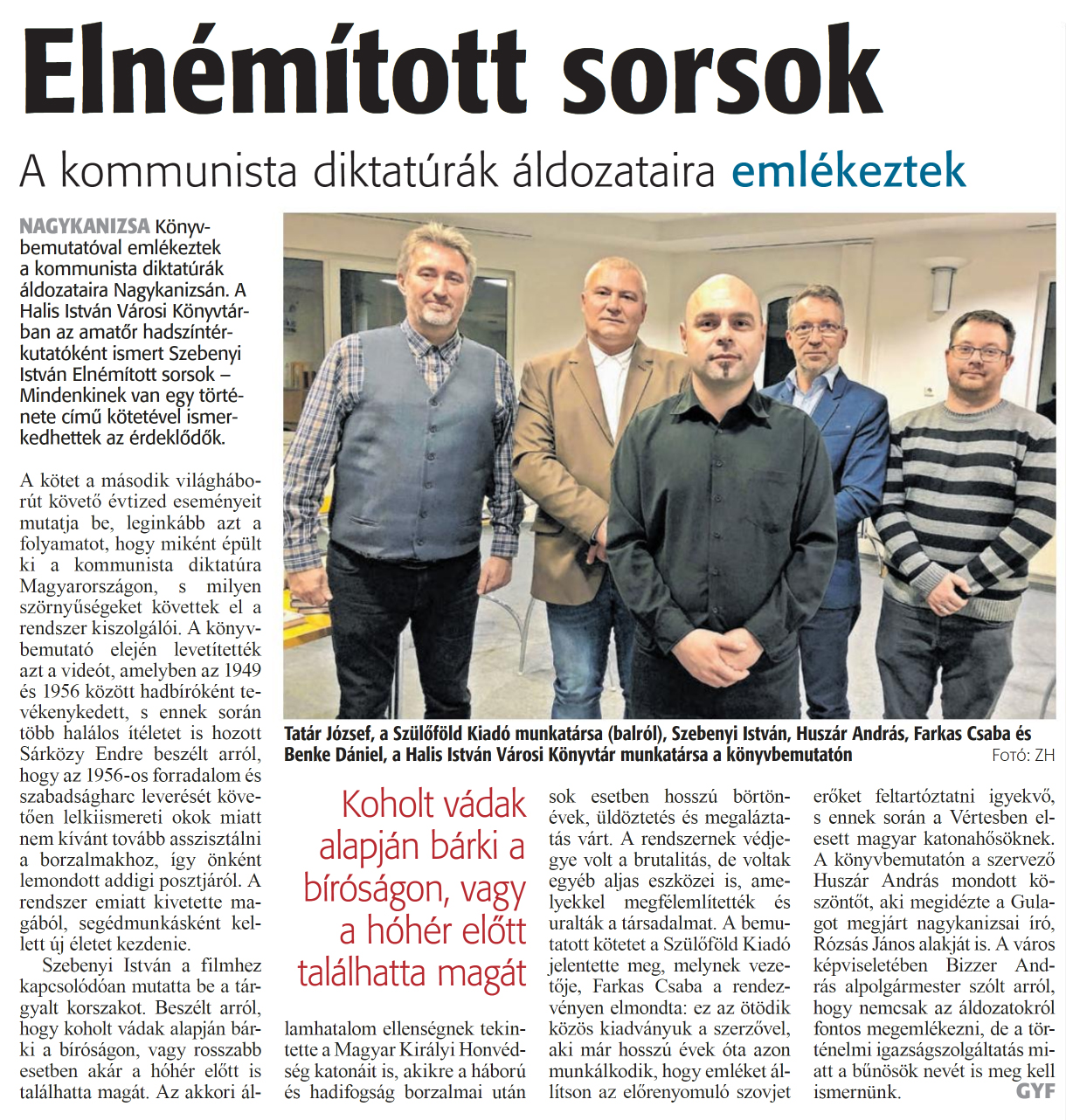 Nyilvános 961 | 1223 | Zalai Hírlap 2024. február 23. 46. szám 2. oldal | Elnémított sorsok A kommunista diktatúrák áldozataira emlékeztek Tatár József, a Szülőföld Kiadó munkatársa (balról), Szebenyi István, Huszár András, Farkas Csaba és Benke Dániel, a Halis István Városi Könyvtár munkatársa a könyvbemutatón Fotó: ZH NAGYKANIZSA Könyvbemutatóval emlékeztek a kommunista diktatúrák áldozataira Nagykanizsán. A Halis István Városi Könyvtárban az amatőr hadszíntérkutatóként ismert Szebenyi István Elnémított sorsok - Mindenkinek van egy története című kötetével ismerkedhettek az érdeklődők. A kötet a második világháborút követő évtized eseményeit mutatja be, leginkább azt a folyamatot, hogy miként épült ki a kommunista diktatúra Magyarországon, s milyen szörnyűségeket követtek el a rendszer kiszolgálói. A könyvbemutató elején levetítették azt a videót, amelyben az 1949 és 1956 között hadbíróként tevékenykedett, s ennek során több halálos ítéletet is hozott Sárközy Endre beszélt arról, hogy az 1956-os forradalom és szabadságharc leverését követően lelkiismereti okok miatt nem kívánt tovább asszisztálni a borzalmakhoz, így önként lemondott addigi posztjáról. A rendszer emiatt kivetette magából, segédmunkásként kellett új életet kezdenie. Szebenyi István a filmhez kapcsolódóan mutatta be a tárgyalt korszakot. Beszélt arról, hogy koholt vádak alapján bárki a bíróságon, vagy rosszabb esetben akár a hóhér előtt is találhatta magát. Az akkori államhatalom ellenségnek tekintette a Magyar Királyi Honvédség katonáit is, akikre a háború és hadifogság borzalmai után sok esetben hosszú börtönévek, üldöztetés és megaláztatás várt. A rendszernek védjegye volt a brutalitás, de voltak egyéb aljas eszközei is, amelyekkel megfélemlítették és uralták a társadalmat. A bemutatott kötetet a Szülőföld Kiadó jelentette meg, melynek vezetője, Farkas Csaba a rendezvényen elmondta: ez az ötödik közös kiadványuk a szerzővel, aki már hosszú évek óta azon munkálkodik, hogy emléket állítson az előrenyomuló szovjet erőket feltartóztatni igyekvő, s ennek során a Vértesben elesett magyar katonahősöknek. A könyvbemutatón a szervező Huszár András mondott köszöntőt, aki megidézte a Gulagot megjárt nagykanizsai író, Rózsás János alakját is. A város képviseletében Bizzer András alpolgármester szólt arról, hogy nemcsak az áldozatokról fontos megemlékezni, de a történelmi igazságszolgáltatás miatt a bűnösök nevét is meg kell ismernünk. |