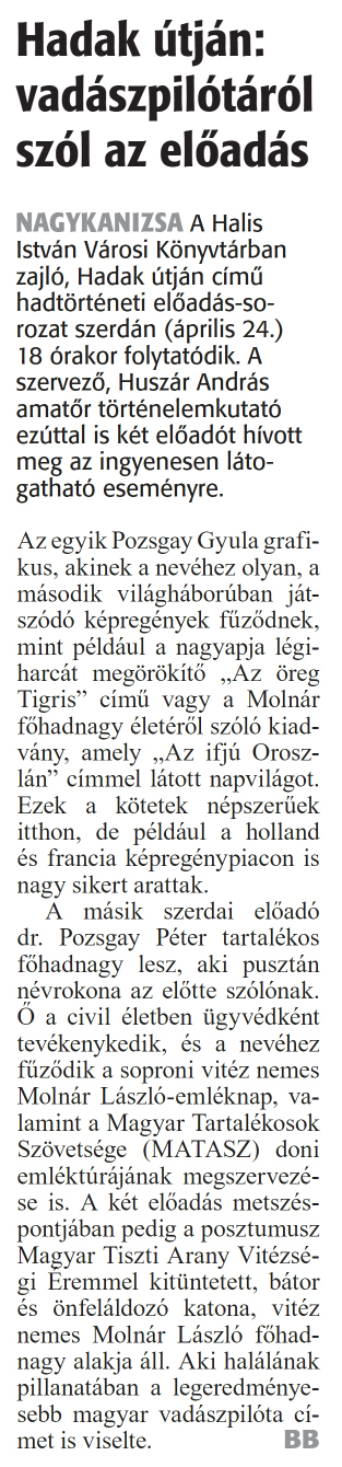 Nyilvános 922 | 1427 | Zalai Hírlap 2024 április 24. 94. szám 2. oldal | Hadak útján: vadászpilótáról szól az előadás NAGYKANIZSA A Halis István Városi Könyvtárban zajló, Hadak útján című hadtörténeti előadás-sorozat szerdán (április 24.) 18 órakor folytatódik. A szervező, Huszár András amatőr történelemkutató ezúttal is két előadót hívott meg az ingyenesen látogatható eseményre. Az egyik Pozsgay Gyula grafikus, akinek a nevéhez olyan, a második világháborúban játszódó képregények fűződnek, mint például a nagyapja légiharcát megörökítő „Az öreg Tigris" című vagy a Molnár főhadnagy életéről szóló kiadvány, amely „Az ifjú Oroszlán" címmel látott napvilágot. Ezek a kötetek népszerűek itthon, de például a holland és francia képregénypiacon is nagy sikert arattak. A másik szerdai előadó dr. Pozsgay Péter tartalékos főhadnagy lesz, aki pusztán névrokona az előtte szólónak. Ő a civil életben ügyvédként tevékenykedik, és a nevéhez fűződik a soproni vitéz nemes Molnár László-emléknap, valamint a Magyar Tartalékosok Szövetsége (MATASZ) doni emléktúrájának megszervezése is. A két előadás metszéspontjában pedig a posztumusz Magyar Tiszti Arany Vitézségi Eremmel kitüntetett, bátor és önfeláldozó katona, vitéz nemes Molnár László főhadnagy alakja áll. Aki halálának pillanatában a legeredményesebb magyar vadászpilóta címet is viselte. BB |