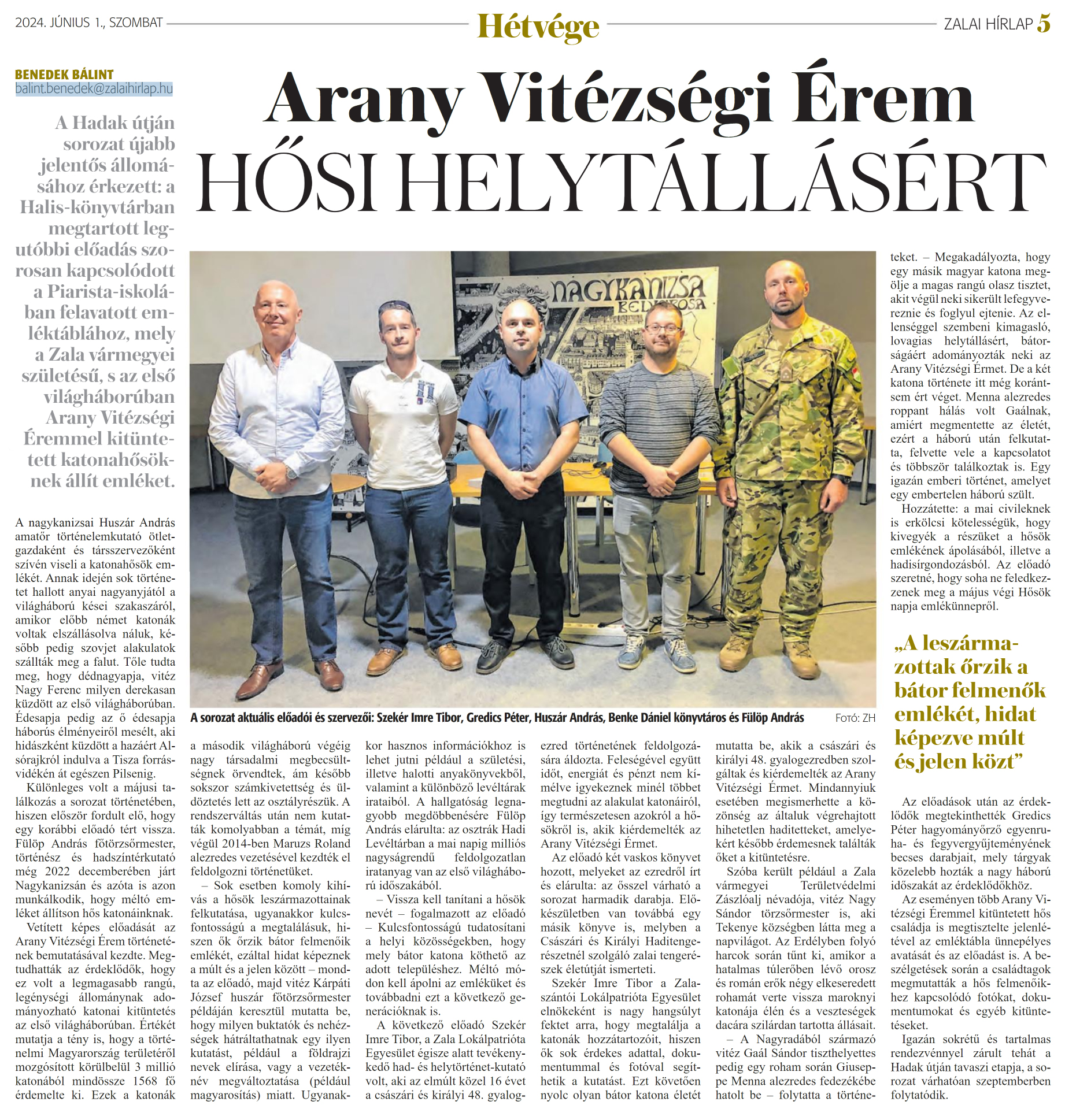 Nyilvános 932 | 1498 | Zalai Hírlap 2024. június 1. 126. szám 5. oldal | Arany Vitézségi Érem HŐSI HELYTÁLLÁSÉRT A sorozat aktuális előadói és szervezői: Szekér Imre Tibor, Gredics Péter, Huszár András, Benke Dániel könyvtáros és Fülöp András Fotó: ZH BENEDEK BÁLINT balint.benedek@zalaihirlap.hu A Hadak útján sorozat ujabb jelentős állomásához érkezett: a Halis-könyvtárban megtartott legutóbbi előadás szorosan kapcsolódott a Piarista-iskolában felavatott emléktáblához, mely a Zala vármegyei születésű, s az első világháborúban Arany Vitézségi Éremmel kitüntetett katonahősöknek állít emléket. A nagykanizsai Huszár András amatőr történelemkutató ötletgazdaként és társszervezőként szívén viseli a katonahősök emlékét. Annak idején sok történetet hallott anyai nagyanyjától a világháború kései szakaszáról, amikor előbb német katonák voltak elszállásolva náluk, később pedig szovjet alakulatok szállták meg a falut. Tőle tudta meg, hogy dédnagyapja, vitéz Nagy Ferenc milyen derekasan küzdött az első világháborúban. Édesapja pedig az ő édesapja háborús élményeiről mesélt, aki hidászként küzdött a hazáért Alsórajkról indulva a Tisza forrásvidékén át egészen Pilsenig. Különleges volt a májusi találkozás a sorozat történetében, hiszen először fordult elő, hogy egy korábbi előadó tért vissza. Fülöp András főtörzsőrmester, történész és hadszíntérkutató még 2022 decemberében járt Nagykanizsán és azóta is azon munkálkodik, hogy méltó emléket állítson hős katonáinknak. Vetített képes előadását az Arany Vitézségi Érem történetének bemutatásával kezdte. Megtudhatták az érdeklődők, hogy ez volt a legmagasabb rangú, legénységi állománynak adományozható katonai kitüntetés az első világháborúban. Értékét mutatja a tény is, hogy a történelmi Magyarország területéről mozgósított körülbelül 3 millió katonából mindössze 1568 fő érdemelte ki. Ezek a katonák a második világháború végéig nagy társadalmi megbecsültségnek örvendtek, ám később sokszor számkivetettség és üldöztetés lett az osztályrészük. A rendszerváltás után nem kutatták komolyabban a témát, míg végül 2014-ben Maruzs Roland alezredes vezetésével kezdték el feldolgozni történetüket. - Sok esetben komoly kihívás a hősök leszármazottainak felkutatása, ugyanakkor kulcsfontosságú a megtalálásuk, hiszen ők őrzik bátor felmenőik emlékét, ezáltal hidat képeznek a múlt és a jelen között - mondta az előadó, majd vitéz Kárpáti József huszár főtörzsőrmester példáján keresztül mutatta be, hogy milyen buktatók és nehézségek hátráltathatnak egy ilyen kutatást, például a földrajzi nevek elírása, vagy a vezetéknév megváltoztatása (például magyarosítás) miatt. Ugyanakkor hasznos információkhoz is lehet jutni például a születési, illetve halotti anyakönyvekből, valamint a különböző levéltárak irataiból. A hallgatóság legnagyobb megdöbbenésére Fülöp András elárulta: az osztrák Hadi Levéltárban a mai napig milliós nagyságrendű feldolgozatlan iratanyag van az első világháború időszakából. - Vissza kell tanítani a hősök nevét - fogalmazott az előadó - Kulcsfontosságú tudatosítani a helyi közösségekben, hogy mely bátor katona köthető az adott településhez. Méltó módon kell ápolni az emléküket és továbbadni ezt a következő generációknak is. A következő előadó Szekér Imre Tibor, a Zala Lokálpatrióta Egyesület égisze alatt tevékenykedő had- és helytörténet-kutató volt, aki az elmúlt közel 16 évet a császári és királyi 48. gyalogezred történetének feldolgozására áldozta. Feleségével együtt időt, energiát és pénzt nem kímélve igyekeznek minél többet megtudni az alakulat katonáiról, így természetesen azokról a hősökről is, akik kiérdemelték az Arany Vitézségi Érmet. Az előadó két vaskos könyvet hozott, melyeket az ezredről írt és elárulta: az ősszel várható a sorozat harmadik darabja. Előkészületben van továbbá egy másik könyve is, melyben a Császári és Királyi Haditengerészetnél szolgáló zalai tengerészek életútját ismerteti. Szekér Imre Tibor a Zalaszántói Lokálpatrióta Egyesület elnökeként is nagy hangsúlyt fektet arra, hogy megtalálja a katonák hozzátartozóit, hiszen ők sok érdekes adattal, dokumentummal és fotóval segíthetik a kutatást. Ezt követően nyolc olyan bátor katona életét mutatta be, akik a császári és királyi 48. gyalogezredben szolgáltak és kiérdemelték az Arany Vitézségi Érmet. Mindannyiuk esetében megismerhette a közönség az általuk végrehajtott hihetetlen haditetteket, amelyekért később érdemesnek találták őket a kitüntetésre. Szóba került például a Zala vármegyei Területvédelmi Zászlóalj névadója, vitéz Nagy Sándor törzsőrmester is, aki Tekenye községben látta meg a napvilágot. Az Erdélyben folyó harcok során tünt ki, amikor a hatalmas túlerőben lévő orosz és román erők négy elkeseredett rohamát verte vissza maroknyi katonája élén és a veszteségek dacára szilárdan tartotta állásait. - A Nagyradából származó vitéz Gaál Sándor tiszthelyettes pedig egy roham során Giuseppe Menna alezredes fedezékébe hatolt be - folytatta a történeteket. - Megakadályozta, hogy egy másik magyar katona megölje a magas rangú olasz tisztet, akit végül neki sikerült lefegyvereznie és foglyul ejtenie. Az ellenséggel szembeni kimagasló, lovagias helytállásért, bátorságáért adományozták neki az Arany Vitézségi Érmet. De a két katona története itt még korántsem ért véget. Menna alezredes roppant hálás volt Gaálnak, amiért megmentette az életét, ezért a háború után felkutatta, felvette vele a kapc