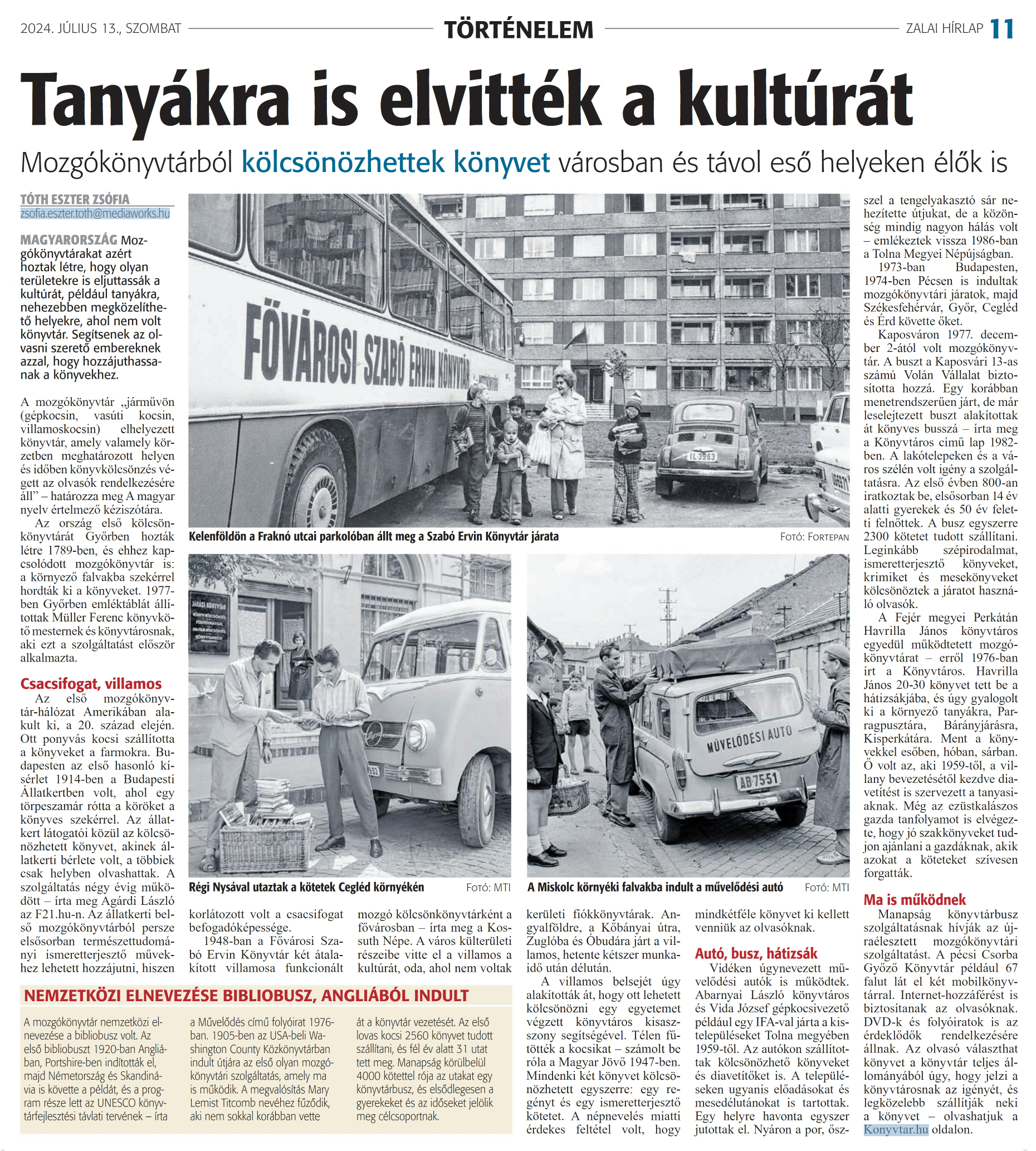 Nyilvános 885 | 1116 | Zalai Hírlap 2024. július 13. 162. szám 11. oldal | Tanyákra is elvitték a kultúrát Mozgókönyvtárból kölcsönözhettek könyvet városban és távol eső helyeken élők is TÓTH ESZTER ZSÓFIA zsofia.eszter.toth@mediaworks.hu MAGYARORSZÁG Mozgókönyvtárakat azért hoztak létre, hogy olyan területekre is eljuttassák a kultúrát, például tanyákra, nehezebben megközelíthető helyekre, ahol nem volt könyvtár. Segítsenek az olvasni szerető embereknek azzal, hogy hozzájuthassanak a könyvekhez. A mozgókönyvtár „járművön (gépkocsin, vasúti kocsin, villamoskocsin) elhelyezett könyvtár, amely valamely körzetben meghatározott helyen és időben könyvkölcsönzés végett az olvasók rendelkezésére áll" - határozza meg A magyar nyelv értelmező kéziszótára. Az ország első kölcsön-könyvtárát Győrben hozták létre 1789-ben, és ehhez kapcsolódott mozgókönyvtár is: a környező falvakba szekérrel hordták ki a könyveket. 1977-ben Győrben emléktáblát állítottak Müller Ferenc könyvkötő mesternek és könyvtárosnak, aki ezt a szolsáltatást először alkalmazta. Az első mozgókönyvtár-hálózat Amerikában alakult ki, a 20. század elején. Ott ponyvás kocsi szállította a könyveket a farmokra. Budapesten az első hasonló kísérlet 1914-ben a Budapesti Állatkertben volt, ahol egy törpeszamár rótta a köröket a könyves szekérrel. Az állatkert látogatói közül az kölcsönözhetett könyvet, akinek állatkerti bérlete volt, a többiek csak helyben olvashattak. A szolgáltatás négy évig működött - írta meg Agárdi László az F21.hu-n. Az állatkerti belső mozgókönyvtárból persze elsősorban természettudományi ismeretterjesztő müvekhez lehetett hozzájutni, hiszen korlátozott volt a csacsifogat befogadóképessége. 1948-ban a Fővárosi Szabó Ervin Könyvtár két átalakított villamosa funkcionált mozgó kölcsönkönyvtárként a fővárosban - írta meg a Kossuth Népe. A város külterületi részeibe vitte el a villamos a kultúrát, oda, ahol nem voltak kerületi fiókkönyvtárak. Angyalföldre, a Kőbányai útra, Zuglóba és Óbudára járt a villamos, hetente kétszer munkaidő után délután. A villamos belsejét úgy alakították át, hogy ott lehetett kölcsönözni egy egyetemet végzett könyvtáros kisasszony segítségével. Télen fűtötték a kocsikat - számolt be róla a Magyar Jövő 1947-ben. Mindenki két könyvet kölcsönözhetett egyszerre: egy regényt és egy ismeretterjesztő kötetet. A népnevelés miatti érdekes feltétel volt, hogy mindkétféle könyvet ki kellett venniük az olvasóknak. Vidéken úgynevezett művelődési autók is működtek. Abarnyai László könyvtáros és Vida József gépkocsivezető például egy IFA-val járta a kistelepüléseket Tolna megyében 1959-től. Az autókon szállítottak kölcsönözhető könyveket és diavetítőket is. A településeken ugyanis előadásokat és mesedélutánokat is tartottak. Egy helyre havonta egyszer jutottak el. Nyáron a por, ősszel a tengelyakasztó sár nehezítette útjukat, de a közönség mindig nagyon hálás volt - emlékeztek vissza 1986-ban a Tolna Megyei Népújságban. 1973-ban Budapesten, 1974-ben Pécsen is indultak mozgókönyvtári járatok, majd Székesfehérvár, Győr, Cegléd és Érd követte őket. Kaposváron 1977. december 2-ától volt mozgókönyvtár. A buszt a Kaposvári 13-as számú Volán Vállalat biztosította hozzá. Egy korábban menetrendszerűen járt, de már leselejtezett buszt alakítottak át könyves busszá - írta meg a Könyvtáros című lap 1982-ben. A lakótelepeken és a város szélén volt igény a szolgáltatásra. Az első évben 800-an iratkoztak be, elsősorban 14 év alatti gyerekek és 50 év feletti felnőttek. A busz egyszerre 2300 kötetet tudott szállítani. Leginkább szépirodalmat, ismeretterjesztő könyveket, krimiket és mesekönyveket kölcsönöztek a járatot használó olvasók. A Fejér megyei Perkátán Havrilla János könyvtáros egyedül működtetett mozgókönyvtárat - erről 1976-ban írt a Könyvtáros. Havrilla János 20-30 könyvet tett be a hátizsákjába, és úgy gyalogolt ki a környező tanyákra, Parragpusztára, Bárányjárásra, Kisperkátára. Ment a könyvekkel esőben, hóban, sárban. Ő volt az, aki 1959-től, a villany bevezetésétől kezdve diavetítést is szervezett a tanyasiaknak. Még az ezüstkalászos gazda tanfolyamot is elvégezte, hogy jó szakkönyveket tudjon ajánlani a gazdáknak, akik azokat a köteteket szívesen forgatták. Ma is működnek Manapság könyvtárbusz szolgáltatásnak hívják az újraélesztett mozgókönyvtári szolgáltatást. A pécsi Csorba Győző Könyvtár például 67 falut lát el két mobilkönyvtárral. Internet-hozzáférést is biztosítanak az olvasóknak. DVD-k és folyóiratok is az érdeklődők rendelkezésére állnak. Az olvasó választhat könyvet a könyvtár teljes állományából úgy, hogy jelzi a könyvtárosnak az igényét, és legközelebb szállítják neki a könyvet - olvashatjuk a Konyvtar.hu oldalon. NEMZETKÖZI ELNEVEZÉSE BIBLIOBUSZ, ANGLIÁBÓL INDULT A mozgókönyvtár nemzetközi elnevezése a bibliobusz volt. Az első bibliobuszt 1920-ban Angliában, Portshire-ben indították el, majd Németország és Skandinávia is követte a példát, és a program része lett az UNESCO könyvtárfejlesztési távlati tervének - írta a Művelődés című folyóirat 1976-ban. 1905-ben az USA-beli Washington County Közkönyvtárban indult útjára az első olyan mozgókönyvtári szolgáltatás, amely ma is működik. A megvalósítás Mary Lemist Titcomb nevéhez fűződik, aki nem sokkal korábban vette át a könyvtár vezetését. Az első lovas kocsi 2560 könyvet tudott szállítani, és fél év alatt 31 utat tett meg. Manapság körülbelül 4000 kötettel rója az utakat egy könyvtárbus