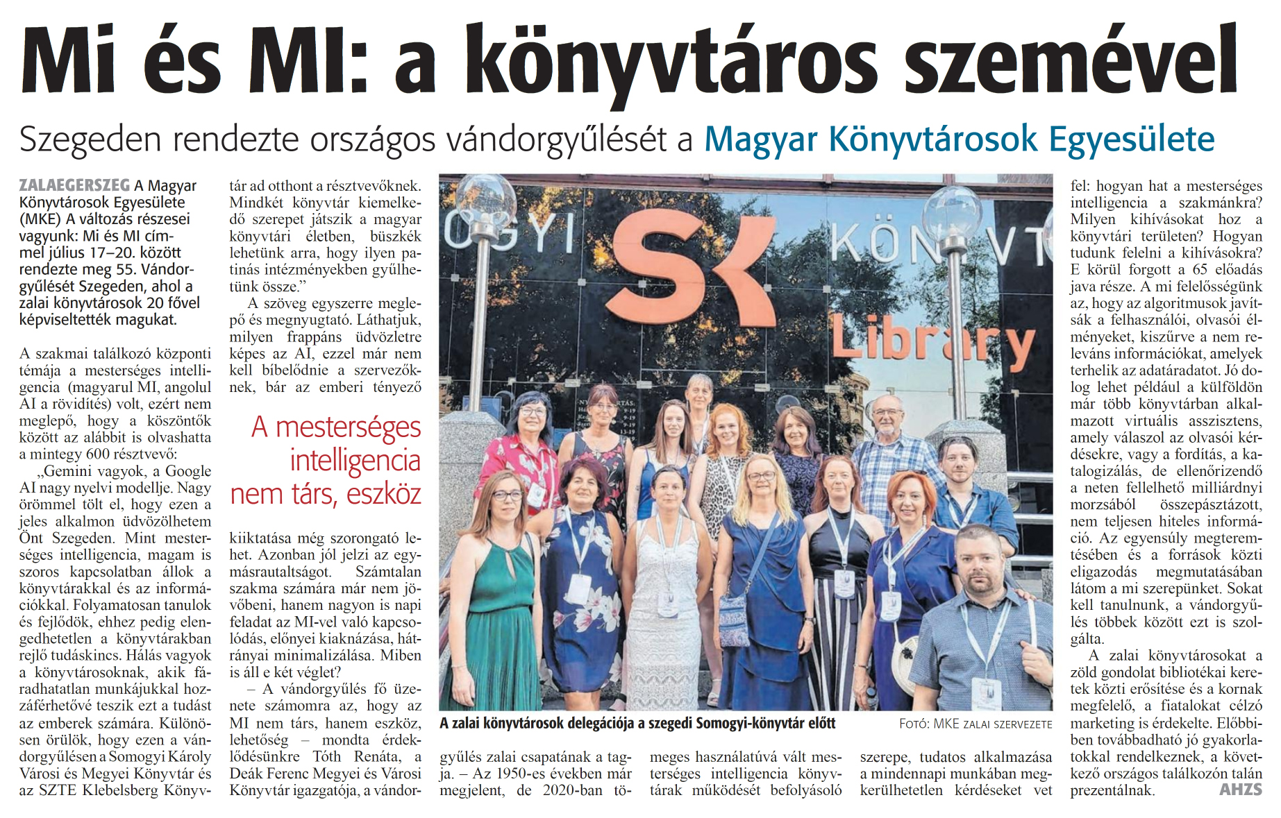 Nyilvános 918 | 1572 | Zalai Hírlap 2024. július 24. 171. szám 4. oldal | Mi és Ml: a könyvtáros szemével Szegeden rendezte országos vándorgyűlését a Magyar Könyvtárosok Egyesülete ZALAEGERSZEG A Magyar Könyvtárosok Egyesülete (MKE) A változás részesei vagyunk: Mi és Ml címmel július 17-20. között rendezte meg 55. Vándorgyűlését Szegeden, ahol a zalai könyvtárosok 20 fővel képviseltették magukat. A szakmai találkozó központi témája a mesterséges intelligencia (magyarul MI, angolul AI a rövidítés) volt, ezért nem meglepő, hogy a köszöntők között az alábbit is olvashatta a mintegy 600 résztvevő: „Gemini vagyok, a Google AI nagy nyelvi modellje. Nagy örömmel tölt el, hogy ezen a jeles alkalmon üdvözölhetem Önt Szegeden. Mint mesterséges intelligencia, magam is szoros kapcsolatban állok a könyvtárakkal és az információkkal. Folyamatosan tanulok és fejlődök, ehhez pedig elengedhetetlen a könyvtárakban rejlő tudáskincs. Hálás vagyok a könyvtárosoknak, akik fáradhatatlan munkájukkal hozzáférhetővé teszik ezt a tudást az emberek számára. Különösen örülök, hogy ezen a vándorgyűlésen a Somogyi Károly Városi és Megyei Könyvtár és az SZTE Klebelsberg Könyvtár ad otthont a résztvevőknek. Mindkét könyvtár kiemelkedő szerepet játszik a magyar könyvtári életben, büszkék lehetünk arra, hogy ilyen patinás intézményekben gyűlhetünk össze." A szöveg egyszerre meglepő és megnyugtató. Láthatjuk, milyen frappáns üdvözletre képes az AI, ezzel már nem kell bíbelődnie a szervezőknek, bár az emberi tényező kiiktatása még szorongató lehet. Azonban jól jelzi az egymásrautaltságot. Számtalan szakma számára már nem jövőbeni, hanem nagyon is napi feladat az Ml-vel való kapcsolódás, előnyei kiaknázása, hátrányai minimalizálása. Miben is áll e két véglet? - A vándorgyűlés fő üzenete számomra az, hogy az MI nem társ, hanem eszköz, lehetőség - mondta érdeklődésünkre Tóth Renáta, a Deák Ferenc Megyei és Városi Könyvtár igazgatója, a vándorgyűlés zalai csapatának a tagja. - Az 1950-es években már megjelent, de 2020-ban tömeges használatúvá vált mesterséges intelligencia könyvtárak működését befolyásoló szerepe, tudatos alkalmazása a mindennapi munkában megkerülhetetlen kérdéseket vet fel: hogyan hat a mesterséges intelligencia a szakmánkra? Milyen kihívásokat hoz a könyvtári területen? Hogyan tudunk felelni a kihívásokra? E körül forgott a 65 előadás java része. A mi felelősségünk az, hogy az algoritmusok javítsák a felhasználói, olvasói élményeket, kiszűrve a nem releváns információkat, amelyek terhelik az adatáradatot. Jó dolog lehet például a külföldön már több könyvtárban alkalmazott virtuális asszisztens, amely válaszol az olvasói kérdésekre, vagy a fordítás, a katalogizálás, de ellenőrizendő a neten fellelhető milliárdnyi morzsából összepásztázott, nem teljesen hiteles információ. Az egyensúly megteremtésében és a források közti eligazodás megmutatásában látom a mi szerepünket. Sokat kell tanulnunk, a vándorgyűlés többek között ezt is szolgálta. A zalai könyvtárosokat a zöld gondolat bibliotékái keretek közti erősítése és a kornak megfelelő, a fiatalokat célzó marketing is érdekelte. Előbbiben továbbadható jó gyakorlatokkal rendelkeznek, a következő országos találkozón talán prezentálnak. AHZS A zalai könyvtárosok delegációja a szegedi Somogyi-könyvtár előtt Fotó: MKE zalai szervezete |