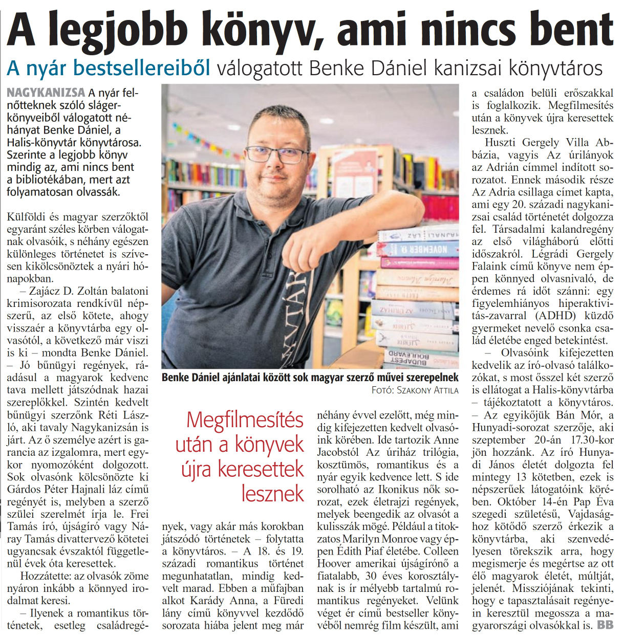 Nyilvános 884 | 1212 | Zalai Hírlap 2024. szeptember 9. 210. szám 2. oldal | A legjobb könyv, ami nincs bent NAGYKANIZSA A nyár felnőtteknek szóló slágerkönyveiből válogatott néhányat Benke Dániel, a Halis-könyvtár könyvtárosa. Szerinte a legjobb könyv mindig az, ami nincs bent a bibliotékában, mert azt folyamatosan olvassák. Külföldi és magyar szerzőktől egyaránt széles körben válogatnak olvasóik, s néhány egészen különleges történetet is szívesen kikölcsönöztek a nyári hónapokban. - Zajácz D. Zoltán balatoni krimisorozata rendkívül népszerű, az első kötete, ahogy visszaér a könyvtárba egy olvasótól, a következő már viszi is ki - mondta Benke Dániel. - Jó bűnügyi regények, ráadásul a magyarok kedvenc tava mellett játszódnak hazai szereplőkkel. Szintén kedvelt bűnügyi szerzőnk Réti László, aki tavaly Nagykanizsán is járt. Az ő személye azért is garancia az izgalomra, mert egykor nyomozóként dolgozott. Sok olvasónk kölcsönözte ki Gárdos Péter Hajnali láz című regényét is, melyben a szerző szülei szerelmét írja le. Frei Tamás író, újságíró vagy Náray Tamás divattervező kötetei ugyancsak évszaktól függetlenül évek óta keresettek. Hozzátette: az olvasók zöme nyáron inkább a könnyed irodalmat keresi. - Ilyenek a romantikus történetek, esetleg családregények, vagy akár más korokban játszódó történetek - folytatta a könyvtáros. - A 18. és 19. századi romantikus történet megunhatatlan, mindig kedvelt marad. Ebben a műfajban alkot Karády Anna, a Füredi lány című könyvvel kezdődő sorozata hiába jelent meg már néhány évvel ezelőtt, még mindig kifejezetten kedvelt olvasóink körében. Ide tartozik Anne Jacobstól Az úriház trilógia, kosztümös, romantikus és a nyár egyik kedvence lett. S ide sorolható az Ikonikus nők sorozat, ezek életrajzi regények, melyek beengedik az olvasót a kulisszák mögé. Például a titokzatos Marilyn Monroe vagy éppen Edith Piaf életébe. Colleen Hoover amerikai újságírónő a fiatalabb, 30 éves korosztálynak is ír mélyebb tartalmú romantikus regényeket. Velünk véget ér című bestseller könyvéből nemrég film készült, ami a családon belüli erőszakkal is foglalkozik. Megfilmesítés után a könyvek újra keresettek lesznek. Huszti Gergely Villa Abbázia, vagyis Az úrilányok az Adrián címmel indított sorozatot. Ennek második része Az Adria csillaga címet kapta, ami egy 20. századi nagykanizsai család történetét dolgozza fel. Társadalmi kalandregény az első világháború előtti időszakról. Légrádi Gergely Falaink című könyve nem éppen könnyed olvasnivaló, de érdemes rá időt szánni: egy figyelemhiányos hiperaktivitás-zavarral (ADHD) küzdő gyermeket nevelő csonka család életébe enged betekintést. - Olvasóink kifejezetten kedvelik az író-olvasó találkozókat, s most ősszel két szerző is ellátogat a Halis-könyvtárba - tájékoztatott a könyvtáros. - Az egyikőjük Bán Mór, a Hunyadi-sorozat szerzője, aki szeptember 20-án 17.30-kor jön hozzánk. Az író Hunyadi János életét dolgozta fel mintegy 13 kötetben, ezek is népszerűek látogatóink körében. Október 14-én Pap Éva szegedi születésű, Vajdasághoz kötődő szerző érkezik a könyvtárba, aki szenvedélyesen törekszik arra, hogy megismerje és megértse az ott élő magyarok életét, múltját, jelenét. Missziójának tekinti, hogy e tapasztalásait regényein keresztül megossza a magyarországi olvasókkal is. BB A nyár bestsellereiből válogatott Benke Dániel kanizsai könyvtáros Benke Dániel ajánlatai között sok magyar szerző művei szerepelnek Fotó: Szakony Attila |