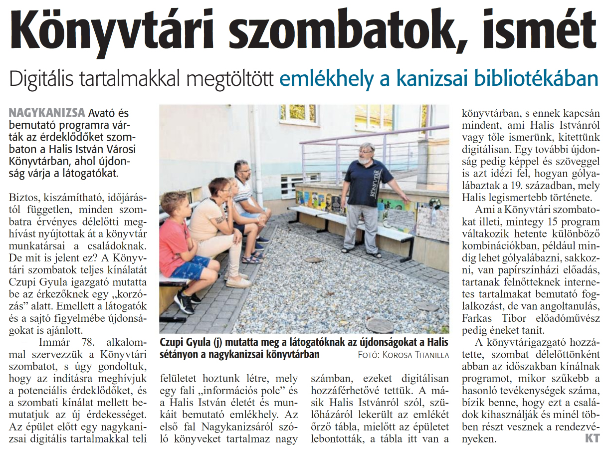 Nyilvános 883 | 1157 | Zalai Hírlap 2024. szeptember 9. 210. szám 4. oldal | Könyvtári szombatok, ismét Digitális tartalmakkal megtöltött emlékhely a kanizsai bibliotékában NAGYKANIZSA Avató és bemutató programra várták az érdeklődőket szombaton a Halis István Városi Könyvtárban, ahol újdonság várja a látogatókat. Biztos, kiszámítható, időjárástól független, minden szombatra érvényes délelőtti meghívást nyújtottak át a könyvtár munkatársai a családoknak. De mit is jelent ez? A Könyvtári szombatok teljes kínálatát Czupi Gyula igazgató mutatta be az érkezőknek egy „korzózás" alatt. Emellett a látogatók és a sajtó figyelmébe újdonságokat is ajánlott. - Immár 78. alkalommal szervezzük a Könyvtári szombatot, s úgy gondoltuk, hogy az indításra meghívjuk a potenciális érdeklődőket, és a szombati kínálat mellett bemutatjuk az új érdekességet. Az épület előtt egy nagykanizsai digitális tartalmakkal teli felületet hoztunk létre, mely egy fali „információs polc" és a Halis István életét és munkáit bemutató emlékhely. Az első fal Nagykanizsáról szóló könyveket tartalmaz nagy számban, ezeket digitálisan hozzáférhetővé tettük. A másik Halis Istvánról szól, szülőházáról lekerült az emlékét őrző tábla, mielőtt az épületet lebontották, a tábla itt van a könyvtárban, s ennek kapcsán mindent, ami Halis Istvánról vagy tőle ismerünk, kitettünk digitálisan. Egy további újdonság pedig képpel és szöveggel is azt idézi fel, hogyan gólyalábaztak a 19. században, mely Halis legismertebb története. Ami a Könyvtári szombatokat illeti, mintegy 15 program váltakozik hetente különböző kombinációkban, például mindig lehet gólyalábazni, sakkozni, van papírszínházi előadás, tartanak felnőtteknek internetes tartalmakat bemutató foglalkozást, de van angoltanulás, Farkas Tibor előadóművész pedig éneket tanít. A könyvtárigazgató hozzátette, szombat délelőttönként abban az időszakban kínálnak programot, mikor szűkebb a hasonló tevékenységek száma, bízik benne, hogy ezt a családok kihasználják és minél többen részt vesznek a rendezvényeken. KT Czupi Gyula (j) mutatta meg a látogatóknak az újdonságokat a Halis sétányon a nagykanizsai könyvtárban Fotó: Korosa Titanilla |