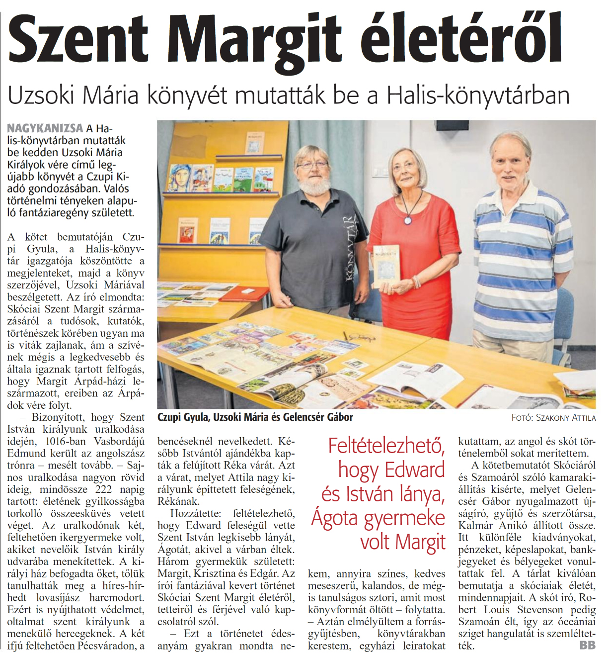 Nyilvános 910 | 1208 | Zalai Hírlap 2024. szeptember 12. 213. szám 6. oldal | Szent Margit életéről Uzsoki Mária könyvét mutatták be a Halis-könyvtárban NAGYKANIZSA A Halis-könyvtárban mutatták be kedden Uzsoki Mária Királyok vére című legújabb könyvét a Czupi Kiadó gondozásában. Valós történelmi tényeken alapuló fantáziaregény született. A kötet bemutatóján Czupi Gyula, a Halis-könyvtár igazgatója köszöntötte a megjelenteket, majd a könyv szerzőjével, Uzsoki Máriával beszélgetett. Az író elmondta: Skóciai Szent Margit származásáról a tudósok, kutatók, történészek körében ugyan ma is viták zajlanak, ám a szívének mégis a legkedvesebb és általa igaznak tartott felfogás, hogy Margit Árpád-házi leszármazott, ereiben az Árpádok vére folyt. - Bizonyított, hogy Szent István királyunk uralkodása idején, 1016-ban Vasbordájú Edmund került az angolszász trónra - mesélt tovább. - Sajnos uralkodása nagyon rövid ideig, mindössze 222 napig tartott: életének gyilkosságba torkolló összeesküvés vetett véget. Az uralkodónak két, feltehetően ikergyermeke volt, akiket nevelőik István király udvarába menekítettek. A királyi ház befogadta őket, tőlük tanulhatták meg a híres-hírhedt lovasíjász harcmodort. Ezért is nyújthatott védelmet, oltalmat szent királyunk a menekülő hercegeknek. A két ifjú feltehetően Pécsváradon, a bencéseknél nevelkedett. Később Istvántól ajándékba kapták a felújított Réka várát. Azt a várat, melyet Attila nagy királyunk építtetett feleségének, Rékának. Hozzátette: feltételezhető, hogy Edvvard feleségül vette Szent István legkisebb lányát, Ágotát, akivel a várban éltek. Három gyermekük született: Margit, Krisztina és Edgár. Az írói fantáziával kevert történet Skóciai Szent Margit életéről, tetteiről és férjével való kapcsolatról szól. - Ezt a történetet édesanyám gyakran mondta nekem, annyira színes, kedves meseszerű, kalandos, de mégis tanulságos sztori, amit most könyvformát öltött - folytatta. - Aztán elmélyültem a forrásgyűjtésben, könyvtárakban kerestem, egyházi leiratokat kutattam, az angol és skót történelemből sokat merítettem. A kötetbemutatót Skóciáról és Szamoáról szóló kamarakiállítás kísérte, melyet Gelencsér Gábor nyugalmazott újságíró, gyűjtő és szerzőtársa, Kalmár Ánikó állított össze. Itt különféle kiadványokat, pénzeket, képeslapokat, bankjegyeket és bélyegeket vonultattak fel. A tárlat kiválóan bemutatja a skóciaiak életét, mindennapjait. A skót író, Róbert Louis Stevenson pedig Szamoán élt, így az óceániai sziget hangulatát is szemléltették. BB Czupi Gyula, Uzsoki Mária és Gelencsér Gábor Fotó: Szakony Attila |