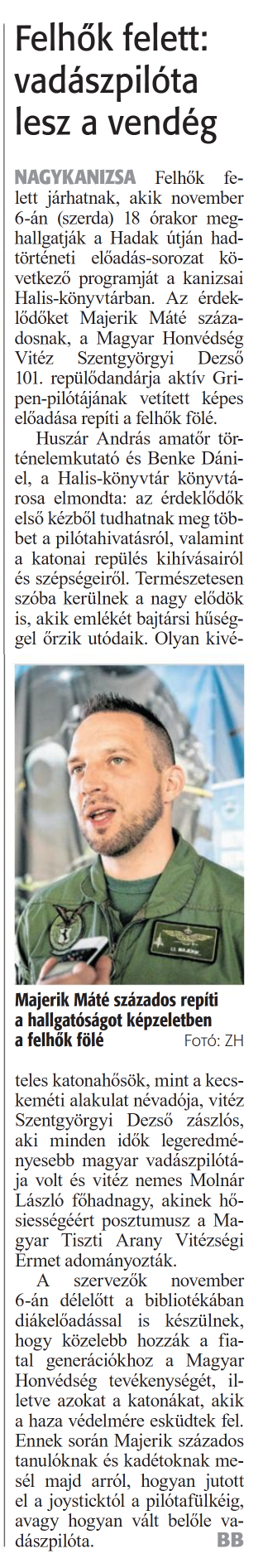 Nyilvános 845 | 1059 | Zalai Hírlap 2024. október 31. 254. szám 6. oldal | Felhők felett: vadászpilóta lesz a vendég NAGYKANIZSA Felhők felett járhatnak, akik november 6-án (szerda) 18 órakor meghallgatják a Hadak útján hadtörténeti előadás-sorozat következő programját a kanizsai Halis-könyvtárban. Az érdeklődőket Majerik Máté századosnak, a Magyar Honvédség Vitéz Szentgyörgyi Dezső 101. repülődandárja aktív Gripen-pilótájának vetített képes előadása repíti a felhők fölé. Huszár András amatőr történelemkutató és Benke Dániel, a Halis-könyvtár könyvtárosa elmondta: az érdeklődők első kézből tudhatnak meg többet a pilótahivatásról, valamint a katonai repülés kihívásairól és szépségeiről. Természetesen szóba kerülnek a nagy elődök is, akik emlékét bajtársi hűséggel őrzik utódaik. Olyan kivételes katonahősök, mint a kecskeméti alakulat névadója, vitéz Szentgyörgyi Dezső zászlós, aki minden idők legeredményesebb magyar vadászpilótája volt és vitéz nemes Molnár László főhadnagy, akinek hősiességéért posztumusz a Magyar Tiszti Arany Vitézségi Érmet adományozták. A szervezők november 6-án délelőtt a bibliotékában diákelőadással is készülnek, hogy közelebb hozzák a fiatal generációkhoz a Magyar Honvédség tevékenységét, illetve azokat a katonákat, akik a haza védelmére esküdtek fel. Ennek során Majerik százados tanulóknak és kadétoknak mesél majd arról, hogyan jutott el a joysticktói a pilótafülkéig, avagy hogyan vált belőle vadászpilóta. BB |