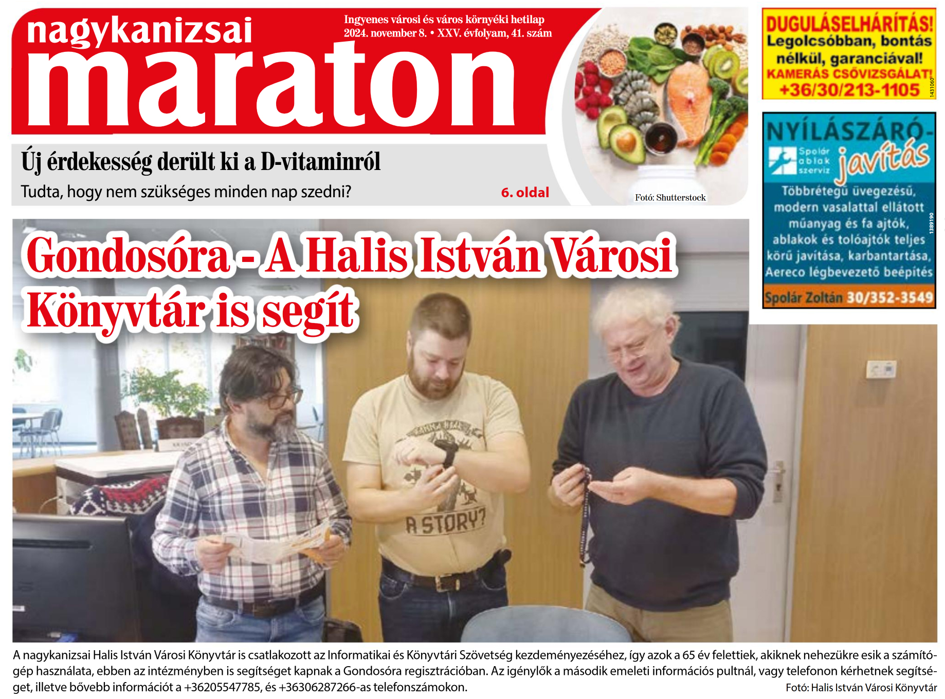 Nyilvános 860 | 1004 | Nagykanizsai Maraton 2024. november 8. 41. szám 1. oldal | Gondosóra - A Halis István Városi Könyvtár is segít A nagykanizsai Halis István Városi Könyvtár is csatlakozott az Informatikai és Könyvtári Szövetség kezdeményezéséhez, így azok a 65 év felettiek, akiknek nehezükre esik a számítógép használata, ebben az intézményben is segítséget kapnak a Gondosóra regisztrációban. Az igénylők a második emeleti információs pultnál, vagy telefonon kérhetnek segítséget, illetve bővebb információt a +36205547785, és +36306287266-as telefonszámokon. Fotó: Halis István Városi Könyvtár |