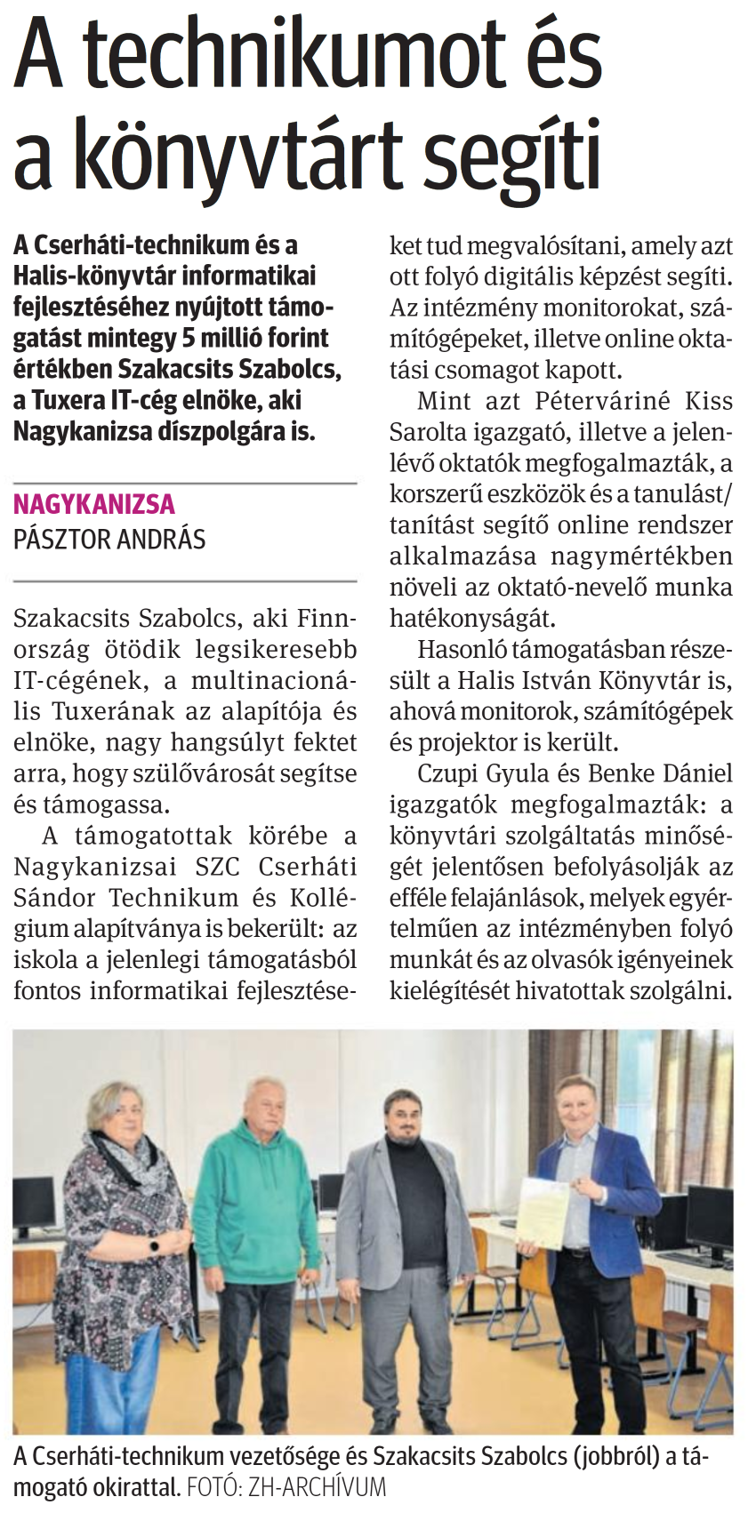 Nyilvános 899 | 1236 | Zalai Hírlap 2024. december 18. 294. szám 5. oldal | A technikumot és a könyvtárt segíti A Cserháti-technikum és a Halis-könyvtár informatikai fejlesztéséhez nyújtott támogatást mintegy 5 millió forint értékben Szakacsits Szabolcs, a Tuxera IT-cég elnöke, aki Nagykanizsa díszpolgára is. NAGYKANIZSA PÁSZTOR ANDRÁS Szakacsits Szabolcs, aki Finnország ötödik legsikeresebb IT-cégének, a multinacionális Tuxerának az alapítója és elnöke, nagy hangsúlyt fektet arra, hogy szülővárosát segítse és támogassa. A támogatottak körébe a Nagykanizsai SZC Cserháti Sándor Technikum és Kollégium alapítványa is bekerült: az iskola a jelenlegi támogatásból fontos informatikai fejlesztéseket tud megvalósítani, amely azt ott folyó digitális képzést segíti. Az intézmény monitorokat, számítógépeket, illetve online oktatási csomagot kapott. Mint azt Péterváriné Kiss Sarolta igazgató, illetve a jelenlévő oktatók megfogalmazták, a korszerű eszközök és a tanulást/ tanítást segítő online rendszer alkalmazása nagymértékben növeli az oktató-nevelő munka hatékonyságát. Hasonló támogatásban részesült a Halis István Könyvtár is, ahová monitorok, számítógépek és projektor is került. Czupi Gyula és Benke Dániel igazgatók megfogalmazták: a könyvtári szolgáltatás minőségét jelentősen befolyásolják az efféle felajánlások, melyek egyértelműen az intézményben folyó munkát és az olvasók igényeinek kielégítését hivatottak szolgálni. A Cserháti-technikum vezetősége és Szakacsits Szabolcs (jobbról) a támogató okirattal. FOTÓ: ZH-ARCHÍVUM |
