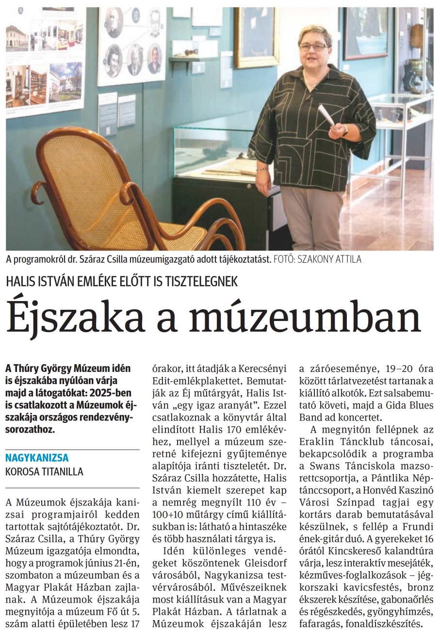 Nyilvános 742 | 1214 | Zalai Hírlap 2025. június 18. 139. szám 3. oldal | HALIS ISTVÁN EMLÉKE ELŐTT IS TISZTELEGNEK Éjszaka a múzeumban A Thúry György Múzeum idén is éjszakába nyúlóan várja majd a látogatókat: 2025-ben is csatlakozott a Múzeumok éjszakája országos rendezvénysorozathoz. NAGYKANIZSA KOROSA TITANILLA A Múzeumok éjszakája kanizsai programjairól kedden tartottak sajtótájékoztatót. Dr. Száraz Csilla, a Thúry György Múzeum igazgatója elmondta, hogy a programok június 21-én, szombaton a múzeumban és a Magyar Plakát Házban zajlanak. A Múzeumok éjszakája megnyitója a múzeum Fő út 5. szám alatti épületében lesz 17 órakor, itt átadják a Kerecsényi Edit-emlékplakettet. Bemutatják az Éj műtárgyát, Halis István „egy igaz aranyát". Ezzel csatlakoznak a könyvtár által elindított Halis 170 emlékévhez, mellyel a múzeum szeretné kifejezni gyűjteménye alapítója iránti tiszteletét. Dr. Száraz Csilla hozzátette, Halis István kiemelt szerepet kap a nemrég megnyílt 110 év -100+10 műtárgy című kiállításukban is: látható a hintaszéke és több használati tárgya is. Idén különleges vendégeket köszöntenek Gleisdorf városából, Nagykanizsa testvérvárosából. Művészeiknek most kiállításuk van a Magyar Plakát Házban. A tárlatnak a Múzeumok éjszakáján lesz a záróeseménye, 19-20 óra között tárlatvezetést tartanak a kiállító alkotók. Ezt salsabemu-tató követi, majd a Gida Blues Band ad koncertet. A megnyitón fellépnek az Eraklin Táncklub táncosai, bekapcsolódik a programba a Swans Tánciskola mazso-rettcsoportja, a Pántlika Néptánccsoport, a Honvéd Kaszinó Városi Színpad tagjai egy kortárs darab bemutatásával készülnek, s fellép a Frundi ének-gitár duó. A gyerekeket 16 órától Kincskereső kalandtúra várja, lesz interaktív mesejáték, kézműves-foglalkozások - jégkorszaki kavicsfestés, bronz ékszerek készítése, gabonaőrlés és régészkedés, gyöngyhímzés, fafaragás, fonaldíszkészítés. A programokról dr. Száraz Csilla múzeumigazgató adott tájékoztatást. FOTÓ: SZAKONY ATTILA |