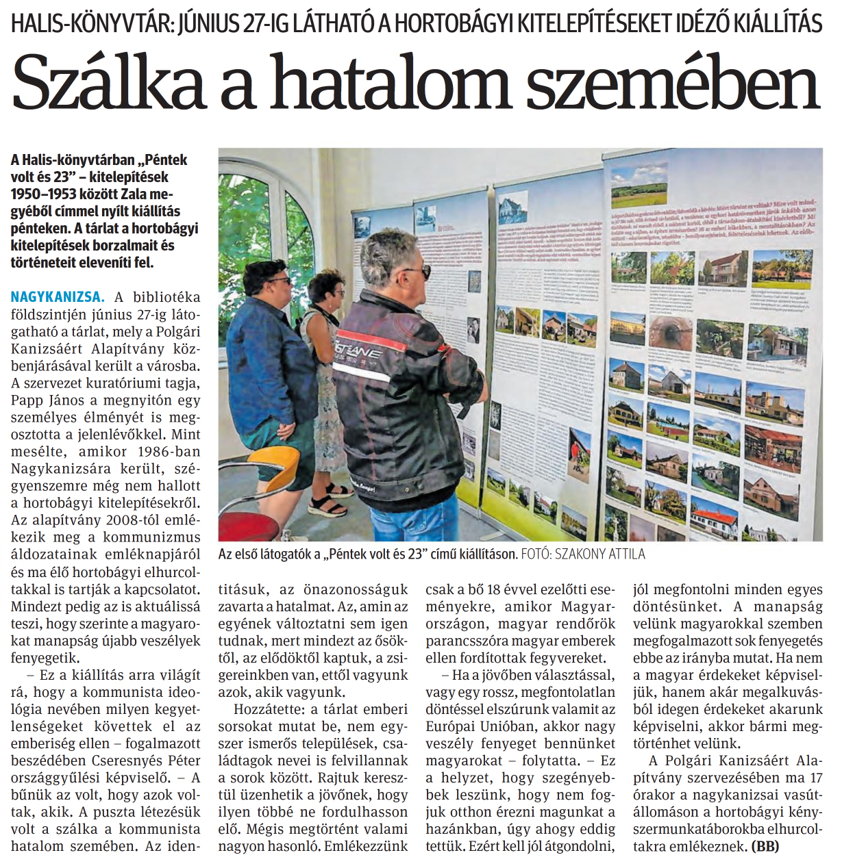 Nyilvános 851 | 1321 | Zalai Hírlap 2025. június 16. 137. szám 3. oldal | HALIS-KÖNYVTÁR: JÚNIUS 27-IG LÁTHATÓ A HORTOBÁGYI KITELEPÍTÉSEKET IDÉZŐ KIÁLLÍTÁS Szálka a hatalom szemében Az első látogatók a „Péntek volt és 23" című kiállításon. FOTÓ: SZAKONY ATTILA A Halis-könyvtárban „Péntek volt és 23" - kitelepítések 1950-1953 között Zala megyéből címmel nyílt kiállítás pénteken. A tárlat a hortobágyi kitelepítések borzalmait és történeteit eleveníti fel. NAGYKANIZSA. A bibliotéka földszintjén június 27-ig látogatható a tárlat, mely a Polgári Kanizsáért Alapítvány közbenjárásával került a városba. A szervezet kuratóriumi tagja, Papp János a megnyitón egy személyes élményét is megosztotta a jelenlévőkkel. Mint mesélte, amikor 1986-ban Nagykanizsára került, szégyenszemre még nem hallott a hortobágyi kitelepítésekről. Az alapítvány 2008-tól emlékezik meg a kommunizmus áldozatainak emléknapjáról és ma élő hortobágyi elhurcol-takkal is tartják a kapcsolatot. Mindezt pedig az is aktuálissá teszi, hogy szerinte a magyarokat manapság újabb veszélyek fenyegetik. - Ez a kiállítás arra világít rá, hogy a kommunista ideológia nevében milyen kegyetlenségeket követtek el az emberiség ellen - fogalmazott beszédében Cseresnyés Péter országgyűlési képviselő. - A bűnük az volt, hogy azok voltak, akik. A puszta létezésük volt a szálka a kommunista hatalom szemében. Az identitásuk, az önazonosságuk zavarta a hatalmat. Az, amin az egyének változtatni sem igen tudnak, mert mindezt az ősöktől, az elődöktől kaptuk, a zsigereinkben van, ettől vagyunk azok, akik vagyunk. Hozzátette: a tárlat emberi sorsokat mutat be, nem egyszer ismerős települések, családtagok nevei is felvillannak a sorok között. Rajtuk keresztül üzenhetik a jövőnek, hogy ilyen többé ne fordulhasson elő. Mégis megtörtént valami nagyon hasonló. Emlékezzünk csak a bő 18 évvel ezelőtti eseményekre, amikor Magyarországon, magyar rendőrök parancsszóra magyar emberek ellen fordítottak fegyvereket. - Ha a jövőben választással, vagy egy rossz, megfontolatlan döntéssel elszúrunk valamit az Európai Unióban, akkor nagy veszély fenyeget bennünket magyarokat - folytatta. - Ez a helyzet, hogy szegényebbek leszünk, hogy nem fogjuk otthon érezni magunkat a hazánkban, úgy ahogy eddig tettük. Ezért kell jól átgondolni, jól megfontolni minden egyes döntésünket. A manapság velünk magyarokkal szemben megfogalmazott sok fenyegetés ebbe az irányba mutat. Ha nem a magyar érdekeket képviseljük, hanem akár megalkuvásból idegen érdekeket akarunk képviselni, akkor bármi megtörténhet velünk. A Polgári Kanizsáért Alapítvány szervezésében ma 17 órakor a nagykanizsai vasútállomáson a hortobágyi kényszermunkatáborokba elhurcol-takra emlékeznek. (BB) |