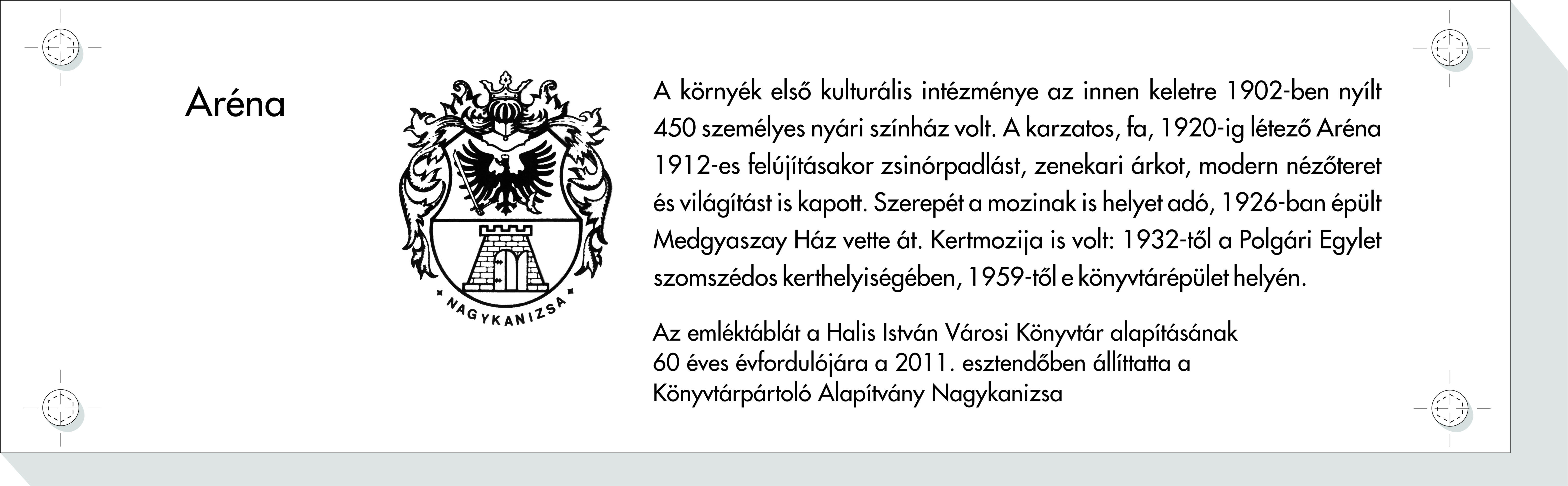 Nyilvános 1743 | 4410 | Aréna | A környék első kulturális intézménye az innen keletre 1902-ben nyílt 450 személyes nyári színház volt. A karzatos, fa, 1920-ig létező Aréna 1912-es felújításakor zsinórpadlást, zenekari árkot, modern nézőteret és világítást is kapott. Szerepét a mozinak is helyet adó, 1926-ban épült Medgyaszay Ház vette át. Kertmozija is volt: 1932-től a Polgári Egylet szomszédos kerthelyiségében, 1959-től e könyvtárépület helyén. Az emléktáblát a Halis István Városi Könyvtár alapításának 60 éves évfordulójára a 2011. esztendőben állíttatta a Könyvtárpártoló Alapítvány Nagykanizsa |