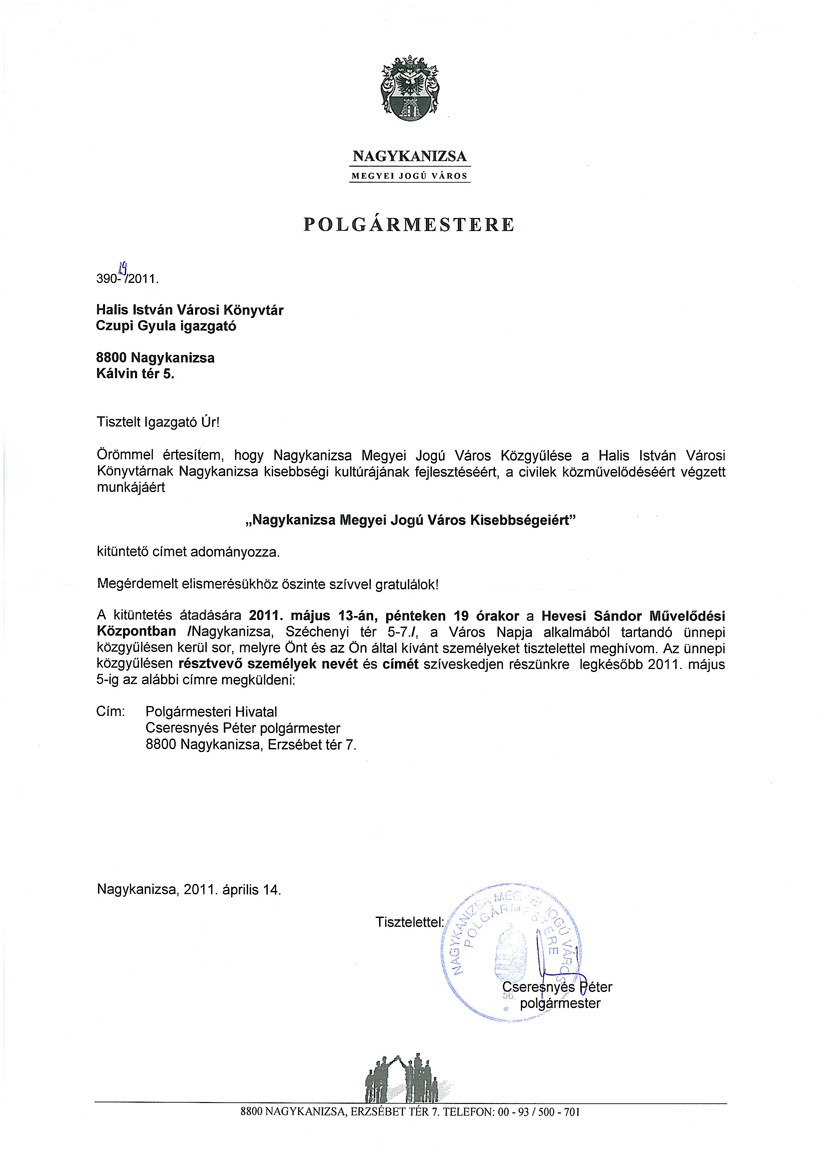 Nyilvános 1262 | 3054 | NAGYKANIZSA | MEGYEI JOGÚ VÁROS POLGÁRMESTERE 390-19/2011. Halis István Városi Könyvtár Czupi Gyula igazgató 8800 Nagykanizsa Kálvin tér 5. Tisztelt Igazgató Úr! Örömmel értesítem, hogy Nagykanizsa Megyei Jogú Város Közgyűlése a Halis István Városi Könyvtárnak Nagykanizsa kisebbségi kultúrájának fejlesztéséért, a civilek közművelődéséért végzett munkájáért „Nagykanizsa Megyei Jogú Város Kisebbségeiért” kitüntető címet adományozza. Megérdemelt elismerésükhöz őszinte szívvel gratulálok! A kitüntetés átadására 2011. május 13-án, pénteken 19 órakor a Hevesi Sándor Művelődési Központban /Nagykanizsa, Széchenyi tér 5-7./, a Város Napja alkalmából tartandó ünnepi közgyűlésen kerül sor, melyre Önt és az Ön által kívánt személyeket tisztelettel meghívom. Az ünnepi közgyűlésen résztvevő személyek nevét és címét szíveskedjen részünkre legkésőbb 2011. május 5-ig az alábbi címre megküldeni: Cím: Polgármesteri Hivatal Cseresnyés Péter polgármester 8800 Nagykanizsa, Erzsébet tér 7. Nagykanizsa, 2011. április 14. Tisztelettel: Cseresnyés Péter polgármester |