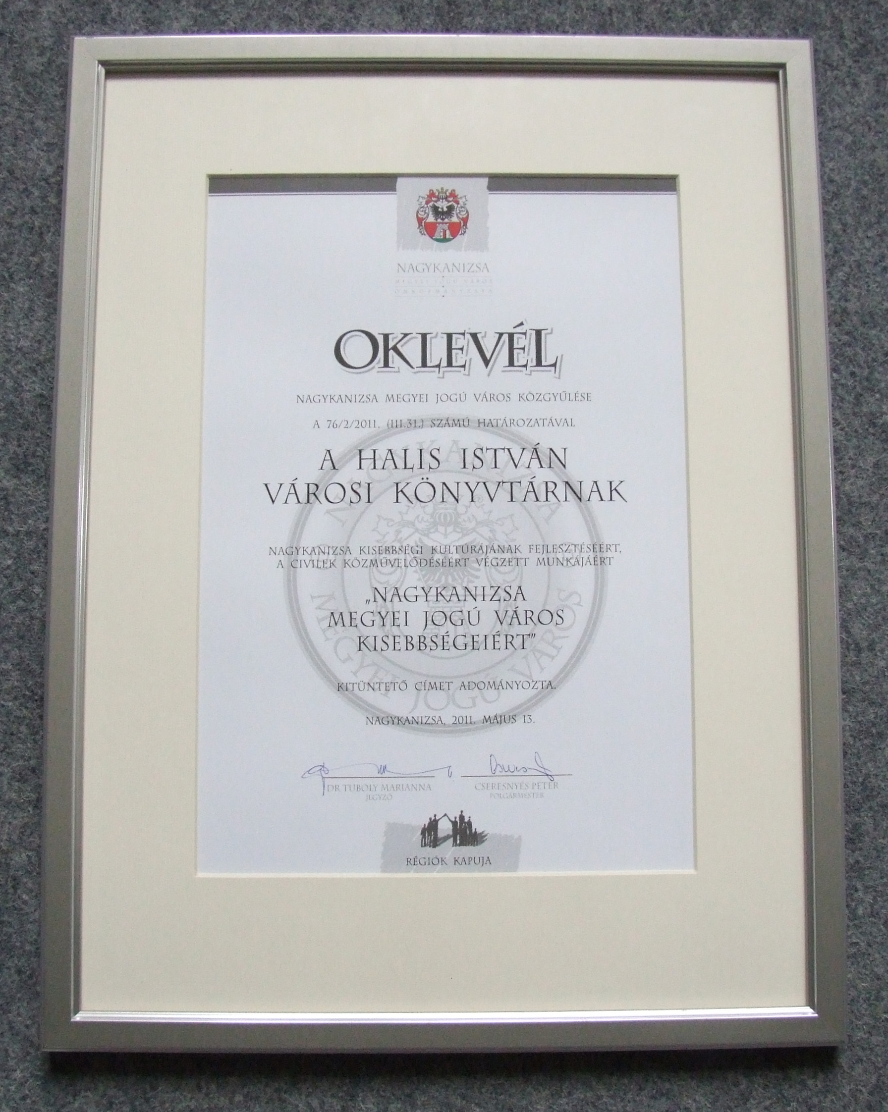 Nyilvános 1287 | 3031 | NAGYKANIZSA | MEGYEI JOGÚ VÁROS ÖNKORMÁNYZATA OKLEVÉL Nagykanizsa Megyei Jogú Város közgyűlése a 76/2/2011. (III.31.) számú határozatával a Halis István Városi Könyvtárnak Nagykanizsa kisebbségi kultúrájának fejlesztéséért, a civilek közművelődéséért végzett munkájáért „Nagykanizsa Megyei Jogú Város Kisebbségeiért” kitüntető címet adományozta. Nagykanizsa, 2011. május 13. |