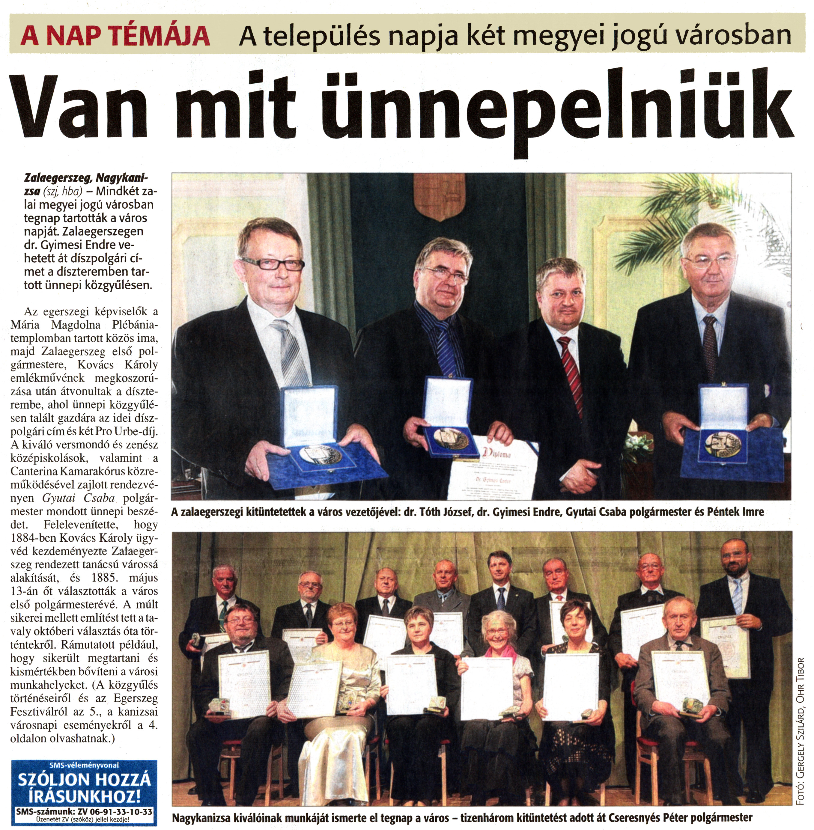 Nyilvános 1468 | 3688 | Zalai Hírlap 2011. május 14. 112. szám 1. oldal - Van mit ünnepelniük | A cikk szövege: A NAP TÉMÁJA A település napja két megyei jogú városban Van mit ünnepelniük Zalaegerszeg, Nagykanizsa (szj, hba) - Mindkét zalai megyei jogú városban tegnap tartották a város napját. Zalaegerszegen dr. Gyimesi Endre vehetett át díszpolgári címet a díszteremben tartott ünnepi közgyűlésen. Az egerszegi képviselők a Mária Magdolna Plébániatemplomban tartott közös ima, majd Zalaegerszeg első polgármestere, Kovács Károly emlékművének megkoszorúzása után átvonultak a díszterembe, ahol ünnepi közgyűlésen talált gazdára az idei díszpolgári cím és két Pro Urbe-díj. A kiváló versmondó és zenész középiskolások, valamint a Canterina Kamarakórus közreműködésével zajlott rendezvényen Gyutai Csaba polgármester mondott ünnepi beszédet. Felelevenítette, hogy 1884-ben Kovács Károly ügyvéd kezdeményezte Zalaegerszeg rendezett tanácsú várossá alakítását, és 1885. május 13-án őt választották a város első polgármesterévé. A múlt sikerei mellett említést tett a tavaly októberi választás óta történtekről. Rámutatott például, hogy sikerült megtartani és kismértékben bővíteni a városi munkahelyeket. (A közgyűlés történéseiről és az Egerszeg Fesztiválról az 5., a kanizsai városnapi eseményekről a 4. oldalon olvashatnak.) A zalaegerszegi kitüntetettek a város vezetőjével: dr. Tóth József, dr. Gyimesi Endre, Gyutai Csaba polgármester és Péntek Imre Nagykanizsa kiválóinak munkáját ismerte el tegnap a város - tizenhárom kitüntetést adott át Cseresnyés Péter polgármester |