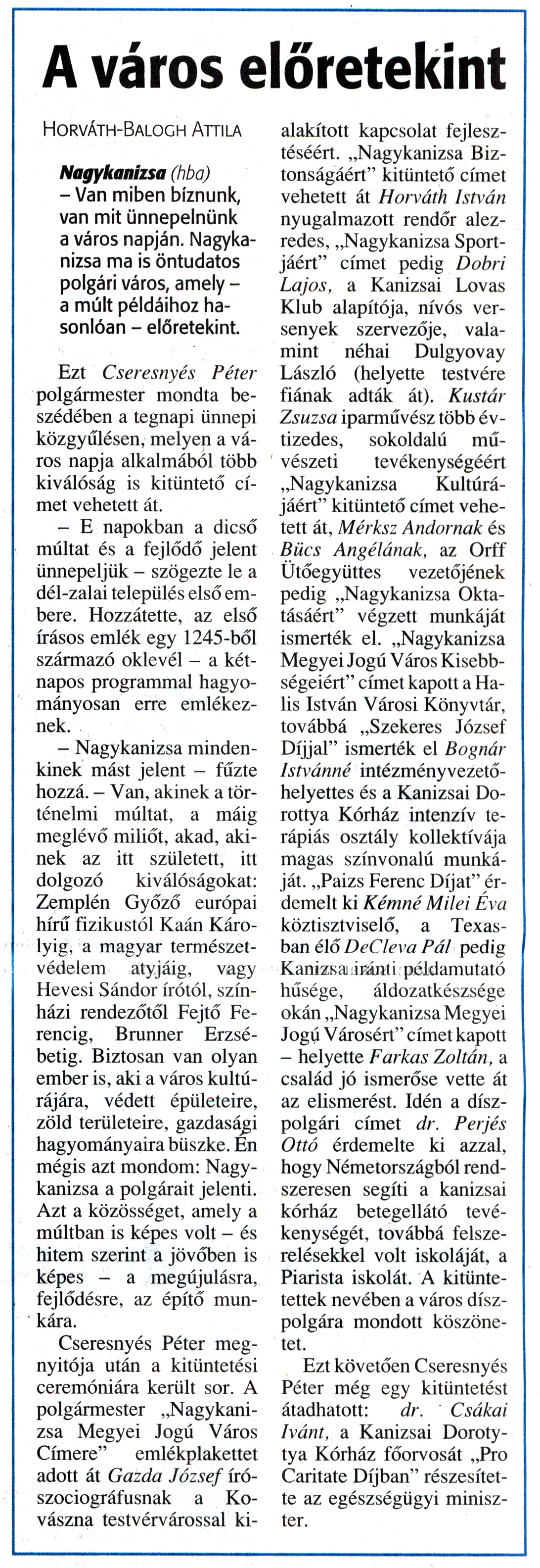 Nyilvános 1421 | 3714 | Zalai Hírlap 2011. május 14. 112. szám 4. oldal - A város előretekint | A cikk szövege: A város előretekint Horváth-Balogh Attila Nagykanizsa (hba) - Van miben bíznunk, van mit ünnepelnünk a város napján. Nagykanizsa ma is öntudatos polgári város, amely -a múlt példáihoz hasonlóan - előretekint. Ezt Cseresnyés Péter polgármester mondta beszédében a tegnapi ünnepi közgyűlésen, melyen a város napja alkalmából több kiválóság is kitüntető címet vehetett át. - E napokban a dicső múltat és a fejlődő jelent ünnepeljük - szögezte le a dél-zalai település első embere. Hozzátette, az első írásos emlék egy 1245-ből származó oklevél - a kétnapos programmal hagyományosan erre emlékeznek. - Nagykanizsa mindenkinek mást jelent - fűzte hozzá. - Van, akinek a történelmi múltat, a máig meglévő miliőt, akad, akinek az itt született, itt dolgozó kiválóságokat: Zemplén Győző európai hírű fizikustól Kaán Károlyig, a magyar természetvédelem atyjáig, vagy Hevesi Sándor írótól, színházi rendezőtől Fejtő Ferencig, Brunner Erzsébetig. Biztosan van olyan ember is, aki a város kultúrájára, védett épületeire, zöld területeire, gazdasági hagyományaira büszke. Én mégis azt mondom: Nagykanizsa a polgárait jelenti. Azt a közösséget, amely a múltban is képes volt - és hitem szerint a jövőben is képes - a megújulásra, fejlődésre, az építő munkára. Cseresnyés Péter megnyitója után a kitüntetési ceremóniára került sor. A polgármester „Nagykanizsa Megyei Jogú Város Címere" emlékplakettet adott át Gazda József író-szociográfusnak a Kovászna testvérvárossal ki- alakított kapcsolat fejlesztéséért. „Nagykanizsa Biztonságáért" kitüntető címet vehetett át Horváth István nyugalmazott rendőr alezredes, „Nagykanizsa Sportjáért" címet pedig Dobri Lajos, a Kanizsai Lovas Klub alapítója, nívós versenyek szervezője, valamint néhai Dulgyovay László (helyette testvére fiának adták át). Kustár Zsuzsa iparművész több évtizedes, sokoldalú művészeti tevékenységéért „Nagykanizsa Kultúrájáért" kitüntető címet vehetett át, Mérksz Andornak és Bücs Angélának, az Orff Ütőegyüttes vezetőjének pedig „Nagykanizsa Oktatásáért" végzett munkáját ismerték el. „Nagykanizsa Megyei Jogú Város Kisebbségeiért" címet kapott a Halis István Városi Könyvtár, továbbá „Szekeres József Díjjal" ismerték el Bognár Istvánné intézményvezető-helyettes és a Kanizsai Dorottya Kórház intenzív terápiás osztály kollektívája magas színvonalú munkáját. „Paizs Ferenc Díjat" érdemelt ki Kémné Milei Éva köztisztviselő, a Texasban élő DeCleva Pál pedig Kanizsa iránti példamutató hűsége, áldozatkészsége okán „Nagykanizsa Megyei Jogú Városért" címet kapott - helyette Farkas Zoltán, a család jó ismerőse vette át az elismerést. Idén a díszpolgári címet dr. Perjés Ottó érdemelte ki azzal, hogy Németországból rendszeresen segíti a kanizsai kórház betegellátó tevékenységét, továbbá felszerelésekkel volt iskoláját, a Piarista iskolát. A kitüntetettek nevében a város díszpolgára mondott köszönetet. Ezt követően Cseresnyés Péter még egy kitüntetést átadhatott: dr. Csákai Ivánt, a Kanizsai Dorottya Kórház főorvosát „Pro Caritate Díjban" részesítette az egészségügyi miniszter. |