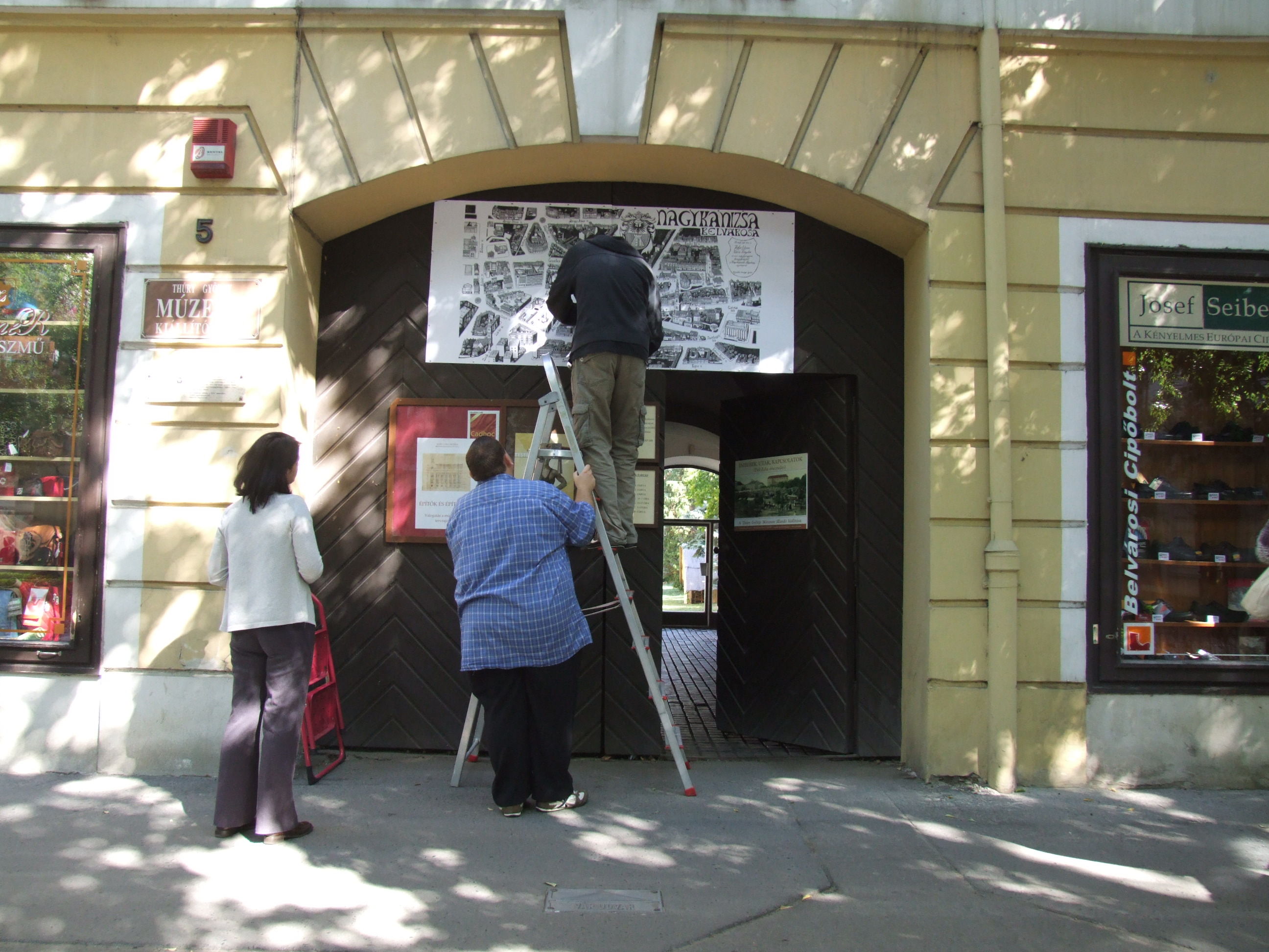 2011.09.23. Madártávlati kép felrakása a Thúry György Múzeum kiállítóhelyének bejárata fölé