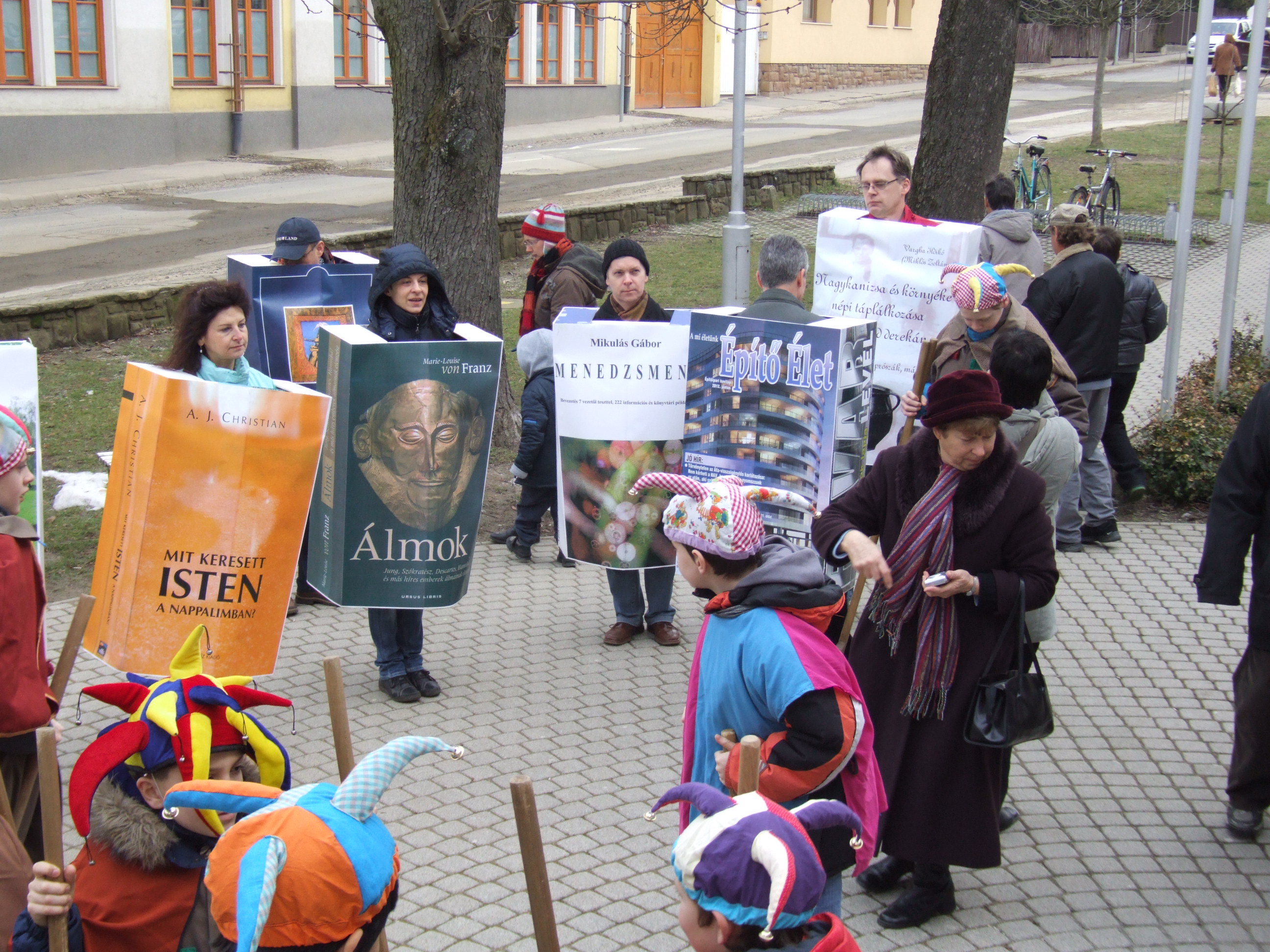 Nyilvános 1311 | 2871 | 2013. február 9. A farsangi fánkfesztiválra készülve felhívásban kértük olvasóinkat, hogy öltsék magukra kedves könyvüket. Egy „könyvespolcnyi” jelentkező vette magára kedves olvasmányát, az ő vonulásukról készültek ezek a képek. A környezetükben néhol láthatók a Nagykanizsai Gólyalábasok, akik szintén a könyvtárhoz kötődnek. A „felvonuló kötetek” a könyvtár épületében még megtekinthetők. | |