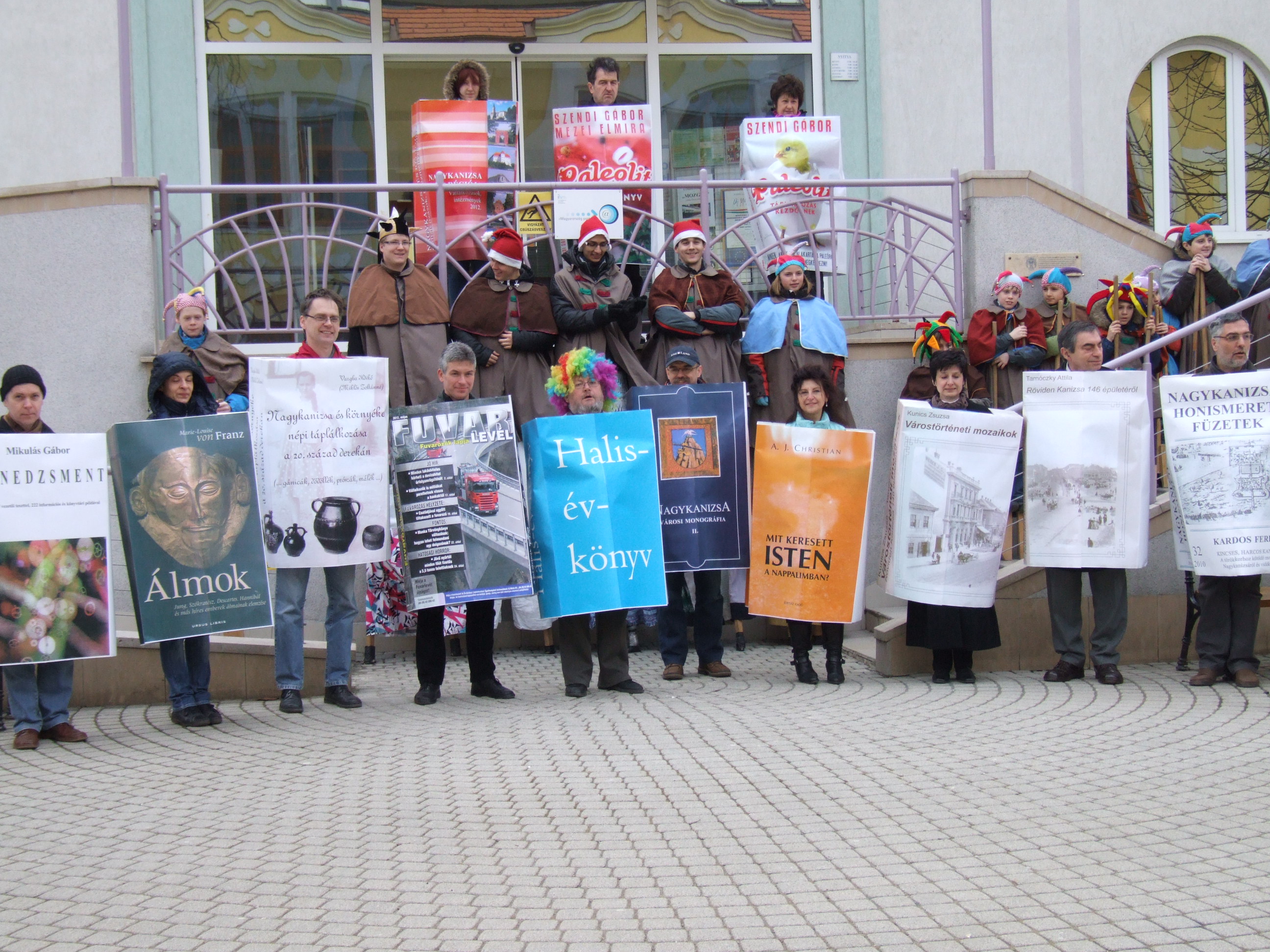 Nyilvános 1345 | 2910 | 2013. február 9. A farsangi fánkfesztiválra készülve felhívásban kértük olvasóinkat, hogy öltsék magukra kedves könyvüket. Egy „könyvespolcnyi” jelentkező vette magára kedves olvasmányát, az ő vonulásukról készültek ezek a képek. A környezetükben néhol láthatók a Nagykanizsai Gólyalábasok, akik szintén a könyvtárhoz kötődnek. A „felvonuló kötetek” a könyvtár épületében még megtekinthetők. | |